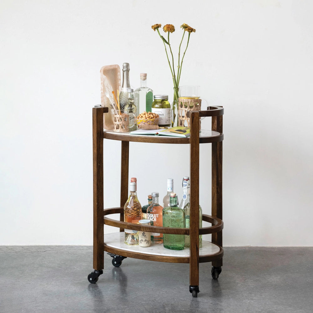 Mango Wood 2-Tier Bar Cart on Casters with Marble Shelves