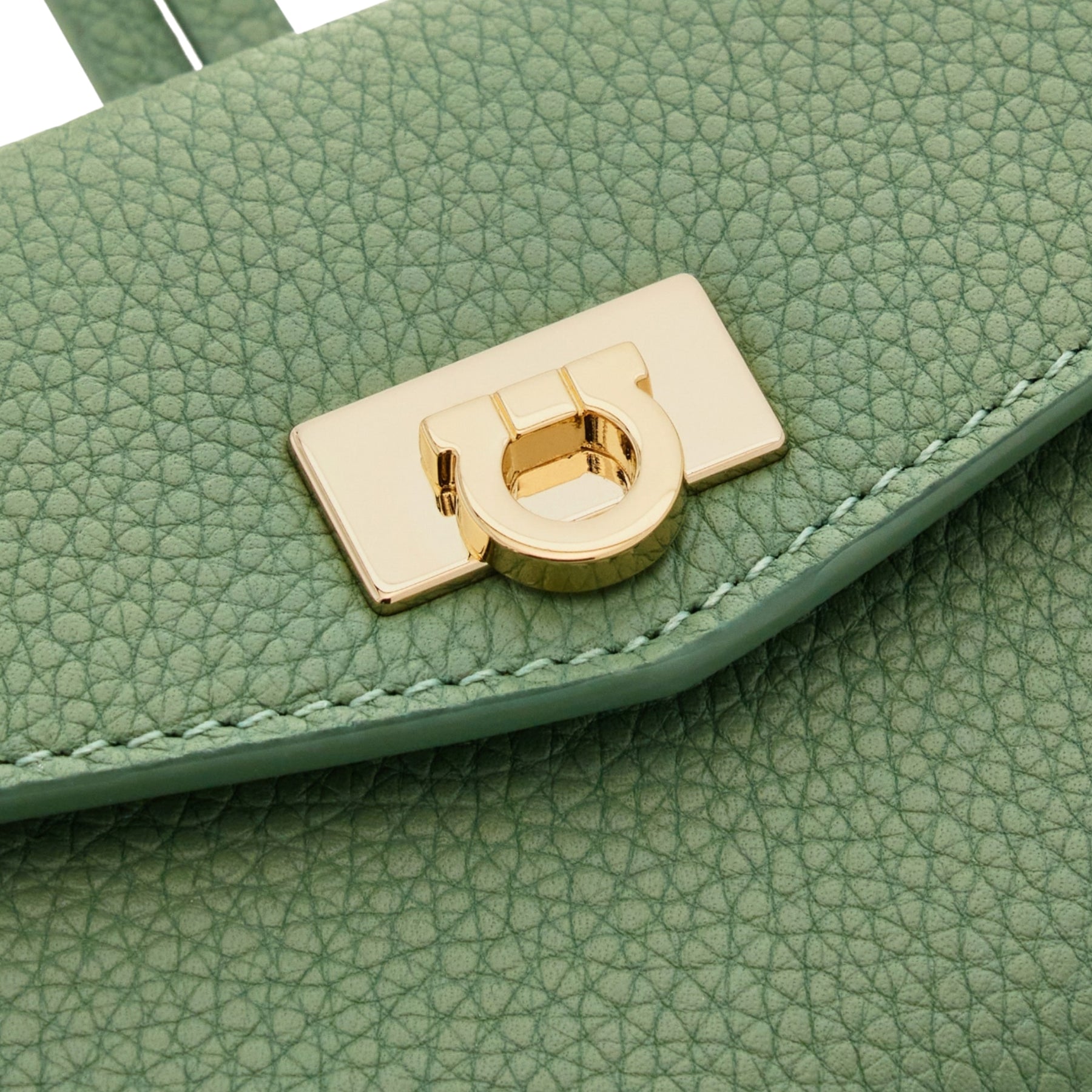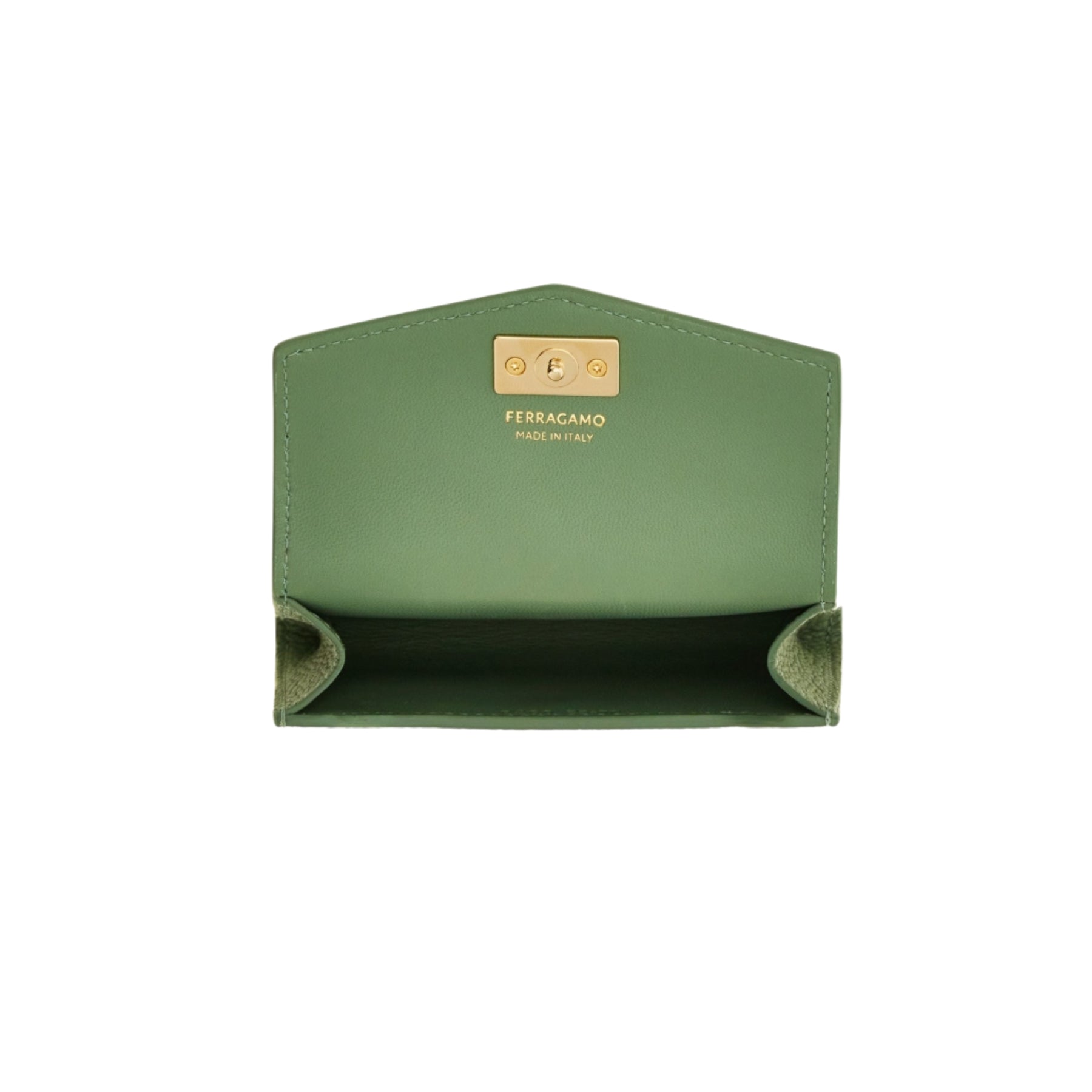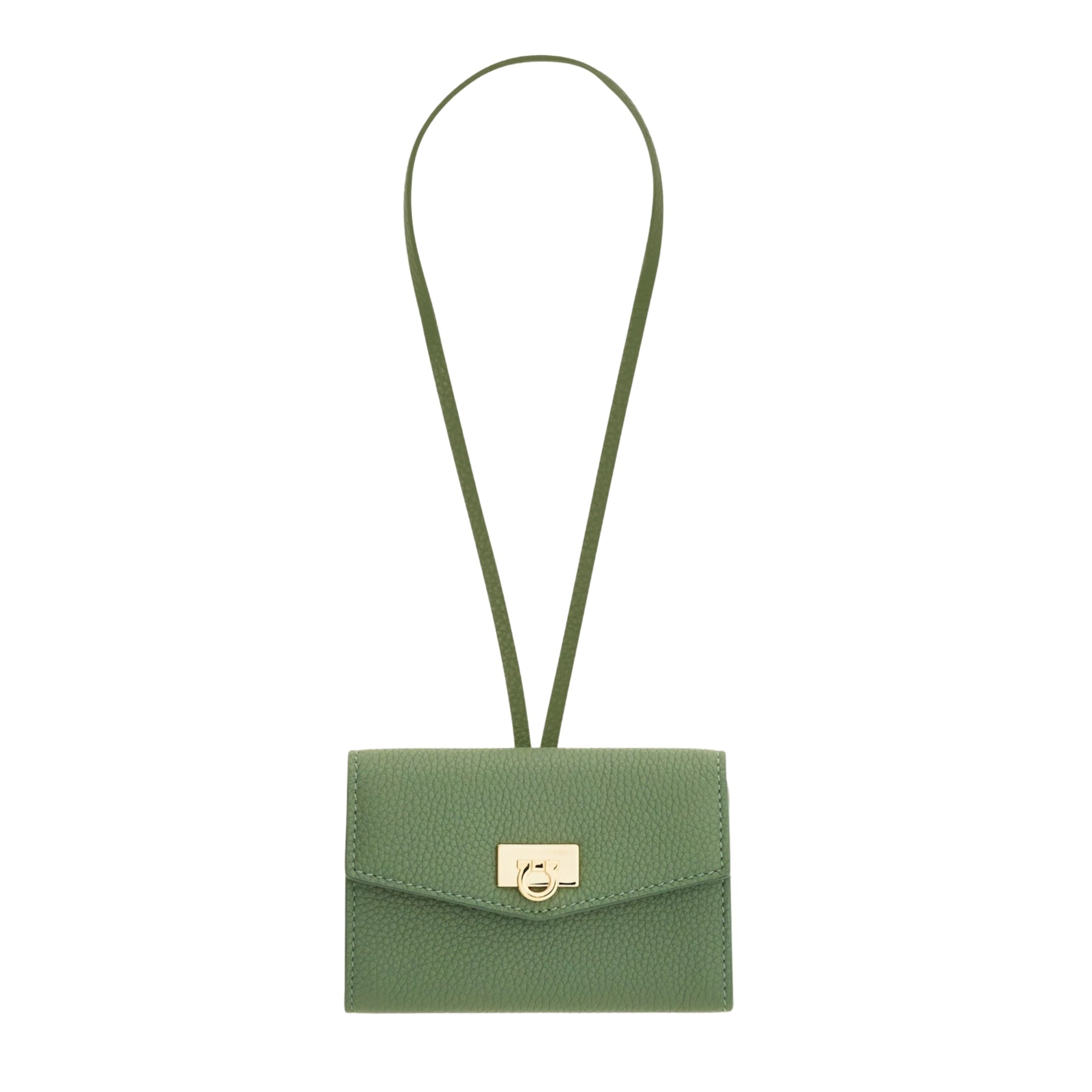 A chic little laminated calfskin charm in Seaglass — a soft, luminous mint tone that adds a refreshing pop of color. This cleverly designed accessory doubles as a sleek cardholder and features a gold-tone Gancini buckle for signature sophistication. Clip it onto your favorite handbag, backpack, or travel tote for a subtle touch of personality and shine.