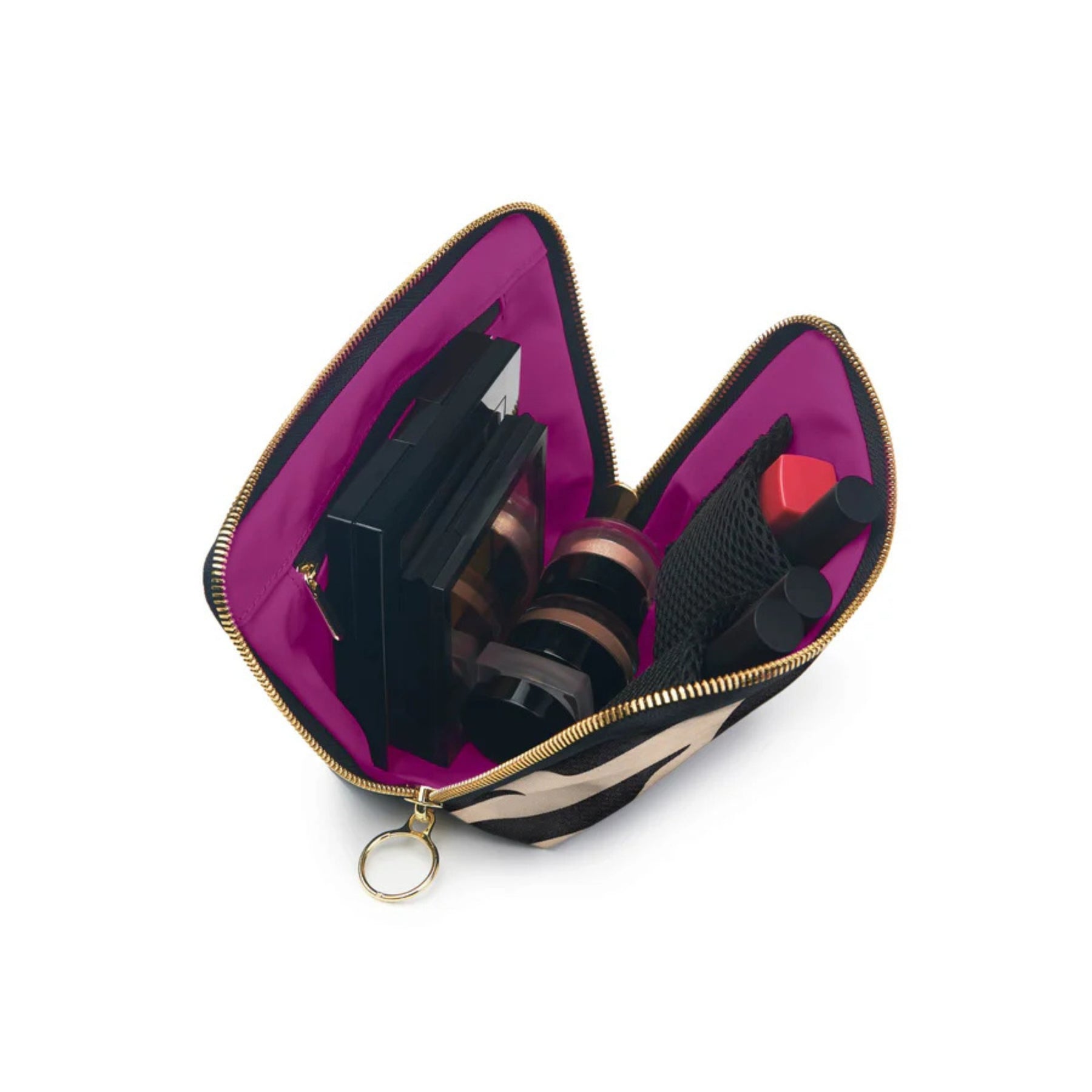 The Everyday Cosmetic Bag – Zebra FS Fabric combines playful style with everyday practicality. Perfect for your purse, gym bag, or daily routine, this compact makeup bag keeps your essentials organized and easily accessible. Featuring a bold zebra print exterior and a vibrant pink interior, it opens on three sides for full visibility—no more digging for your lipstick or mascara. Gold-plated hardware and thoughtful interior pockets add a touch of luxury to your daily organization.