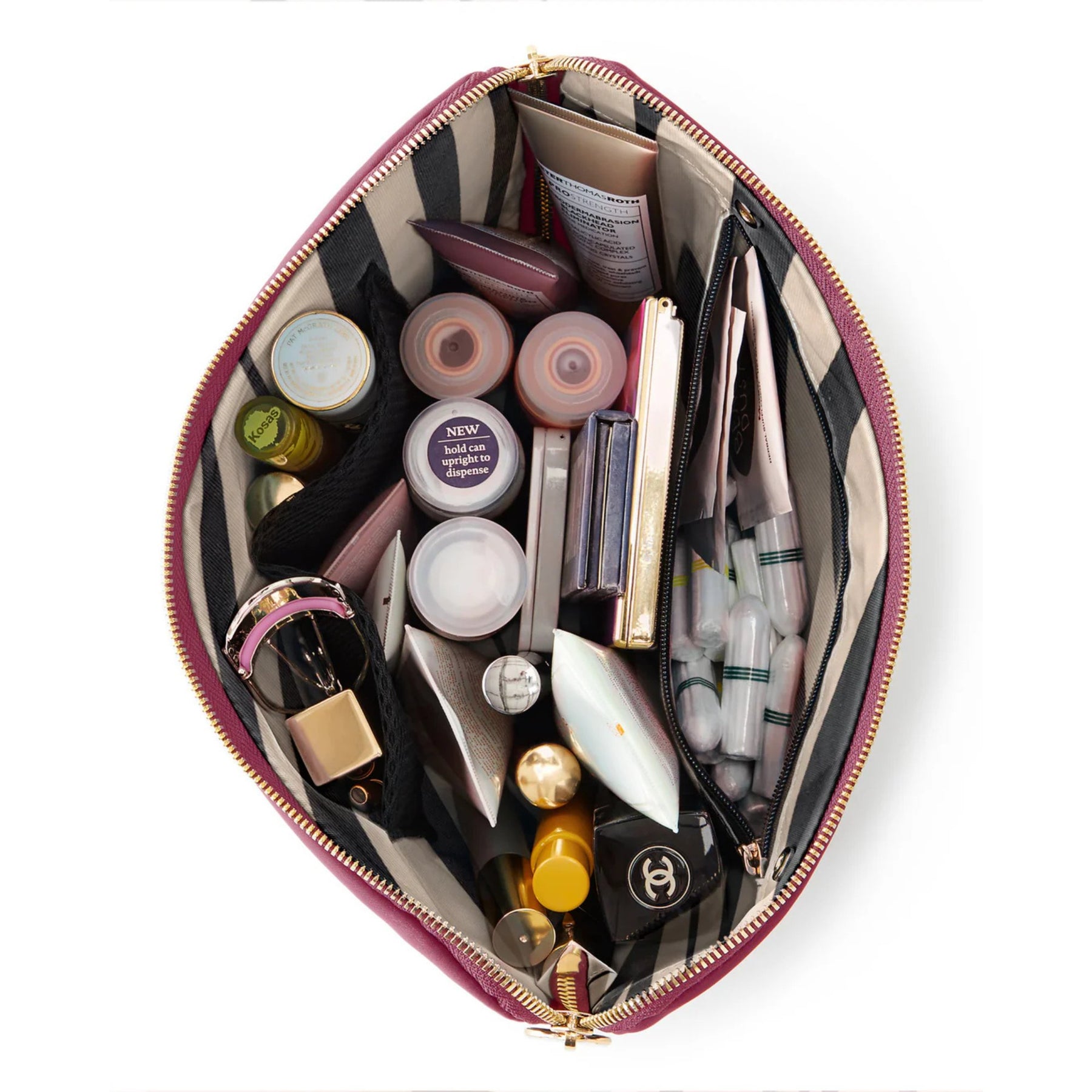 The Vacationer Makeup Bag – Wine/Zebra blends bold elegance with practical organization for effortless travel. With its rich wine-toned exterior and striking zebra print interior, this spacious bag lets you carry your entire beauty routine in style. Designed to open on three sides for easy access, it keeps everything visible and within reach. Thoughtfully designed pockets fit brushes, lip glosses, eyeshadows, and more—making it the perfect companion for vacations, weekend getaways, or at-home organization.