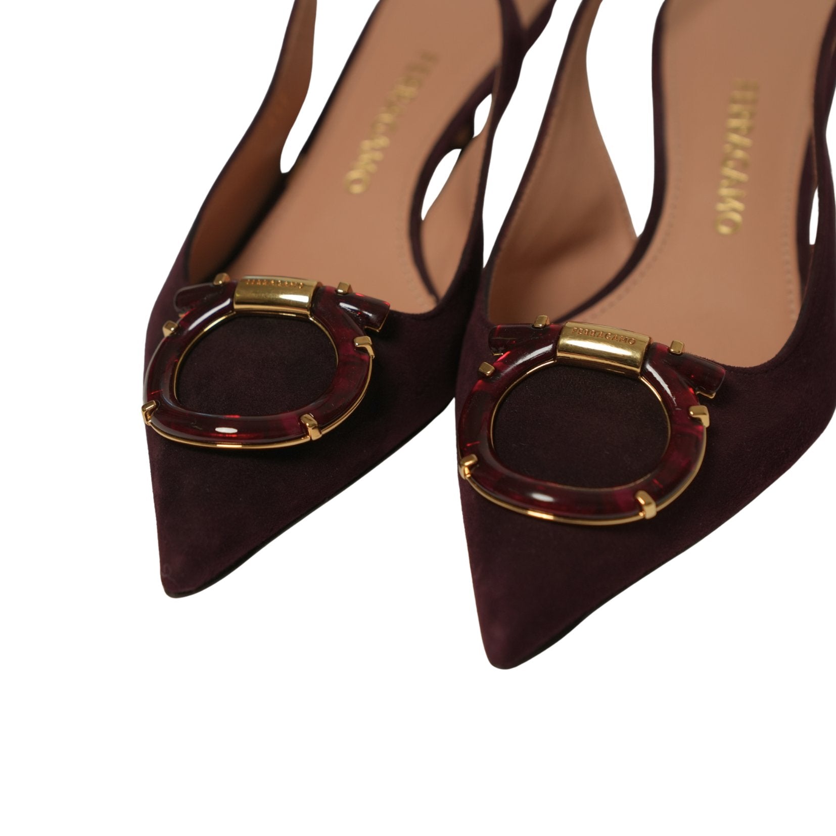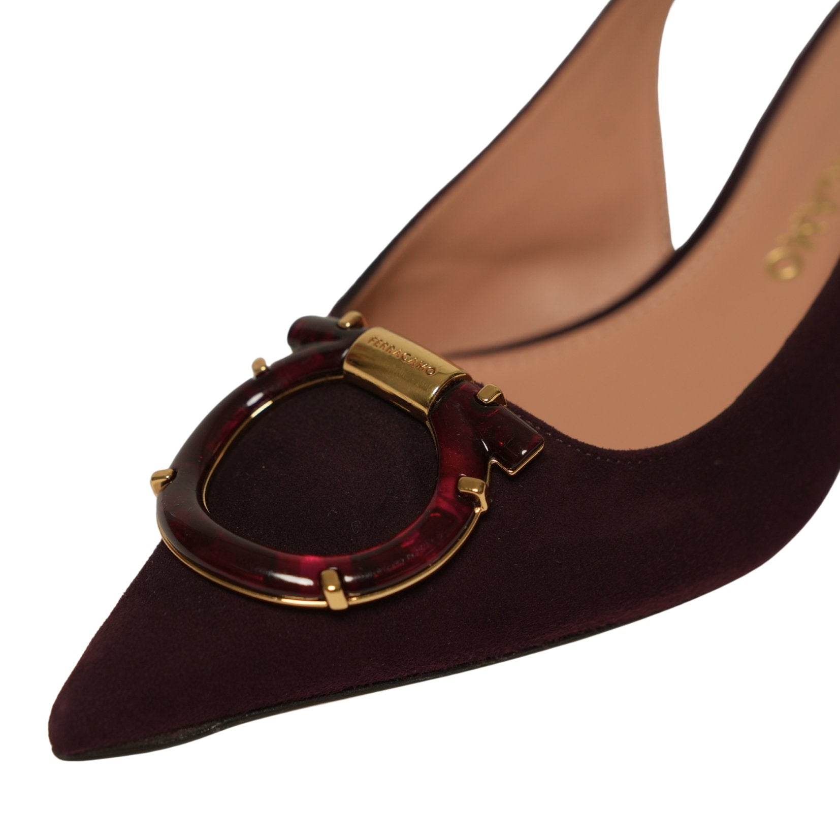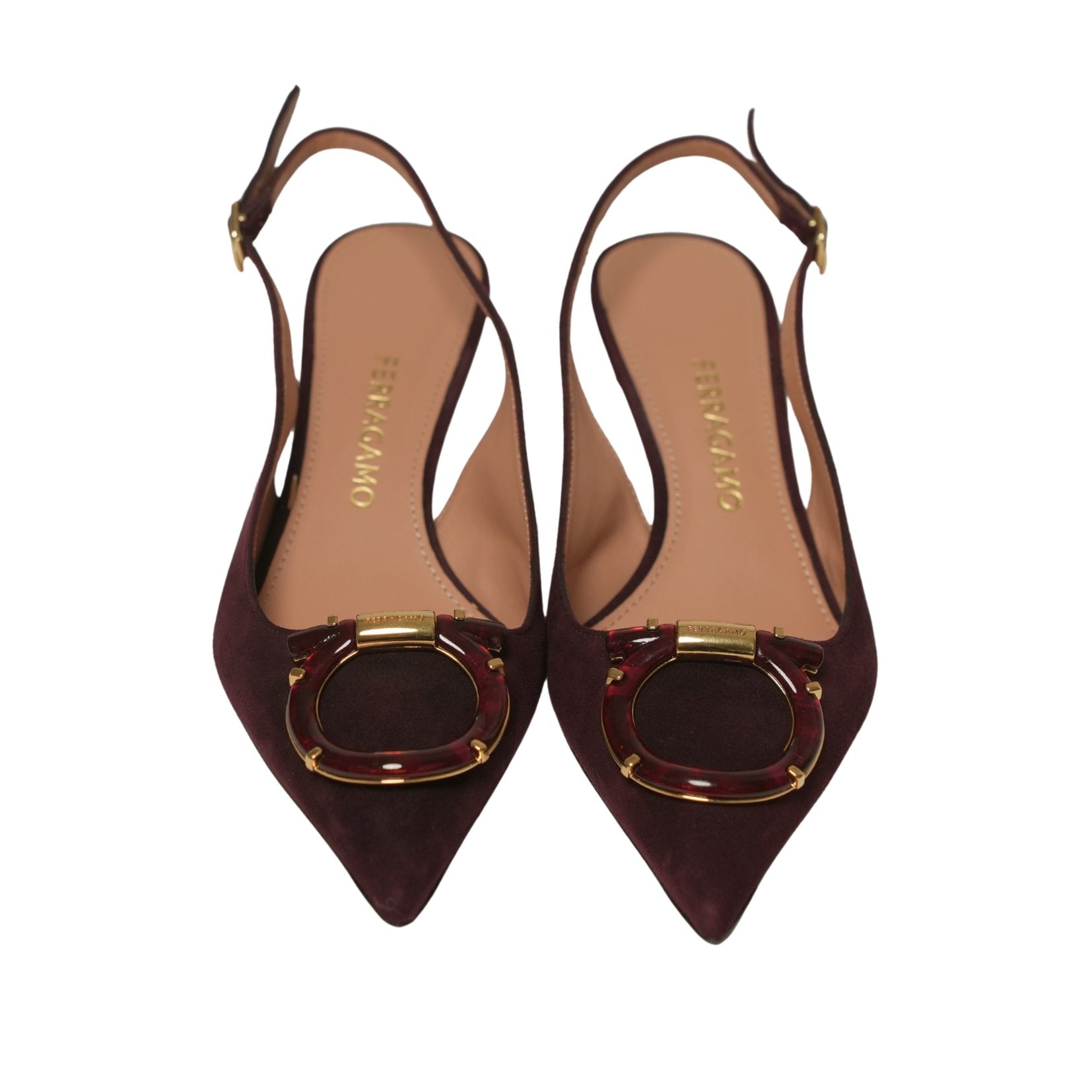 An elegant expression of Ferragamo craftsmanship, the Ornament Lady Gancini slingback is crafted in rich suede with a sharp pointed toe and a refined kitten heel. Finished with the house’s iconic gold-tone Gancini ornament at the vamp, this timeless silhouette balances classic femininity with modern polish.
