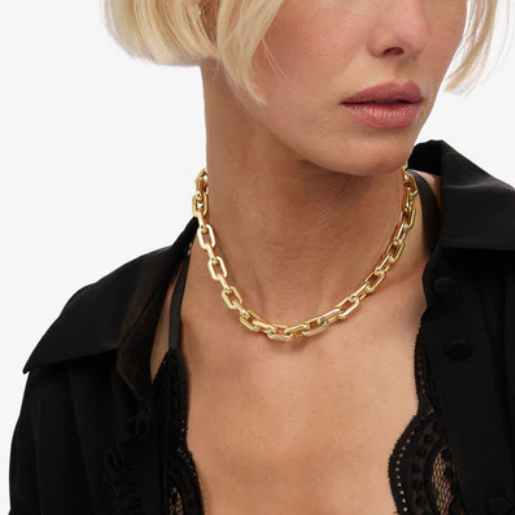 Make a bold statement with the Frankie Chain Necklace, a substantial and unapologetically luxurious piece that commands attention. Measuring 16 inches, this chain necklace features oversized links plated in radiant gold, delivering maximum impact with minimal effort. Whether paired with a little black dress for a night out or layered over casual attire for everyday edge, the Frankie is the ultimate statement chain.