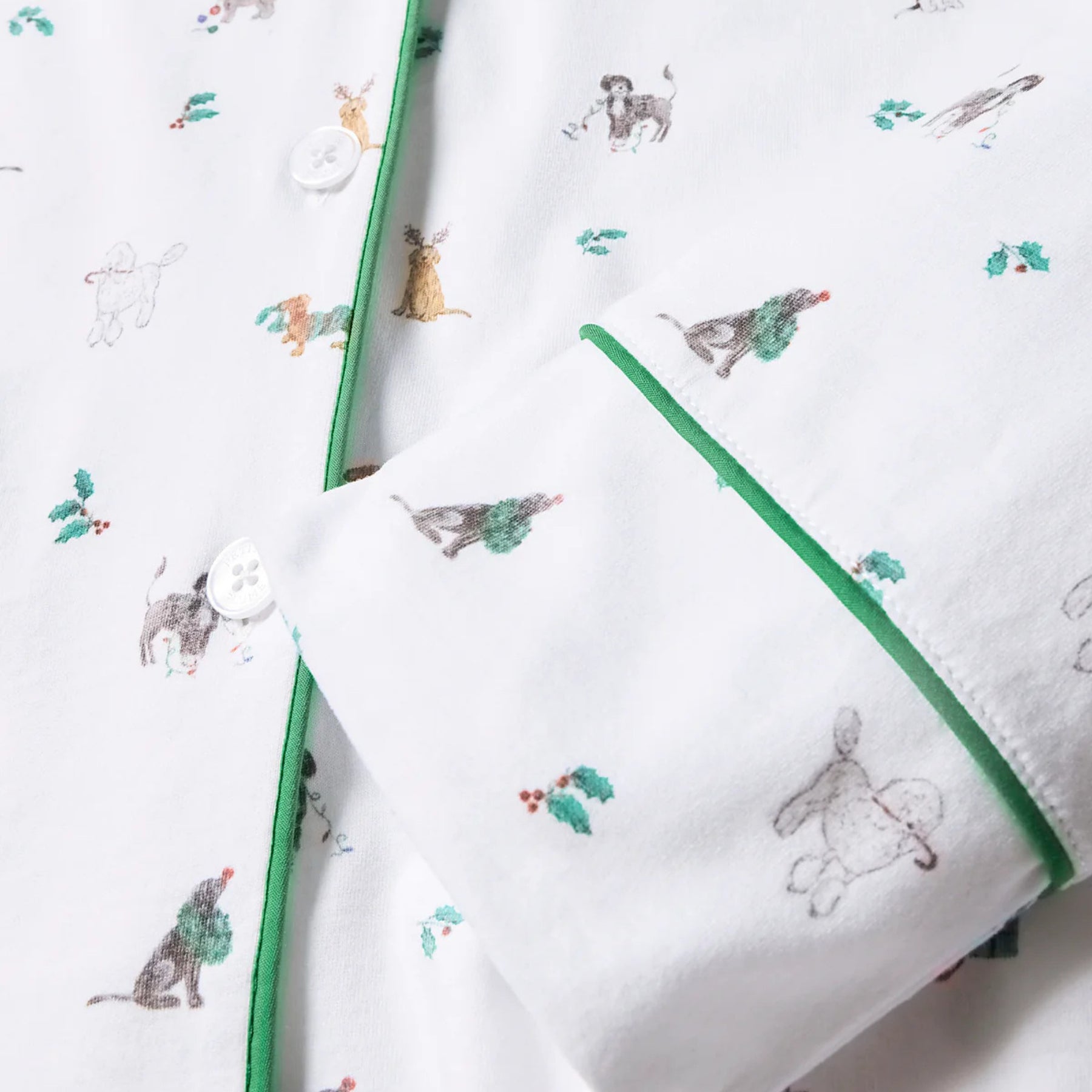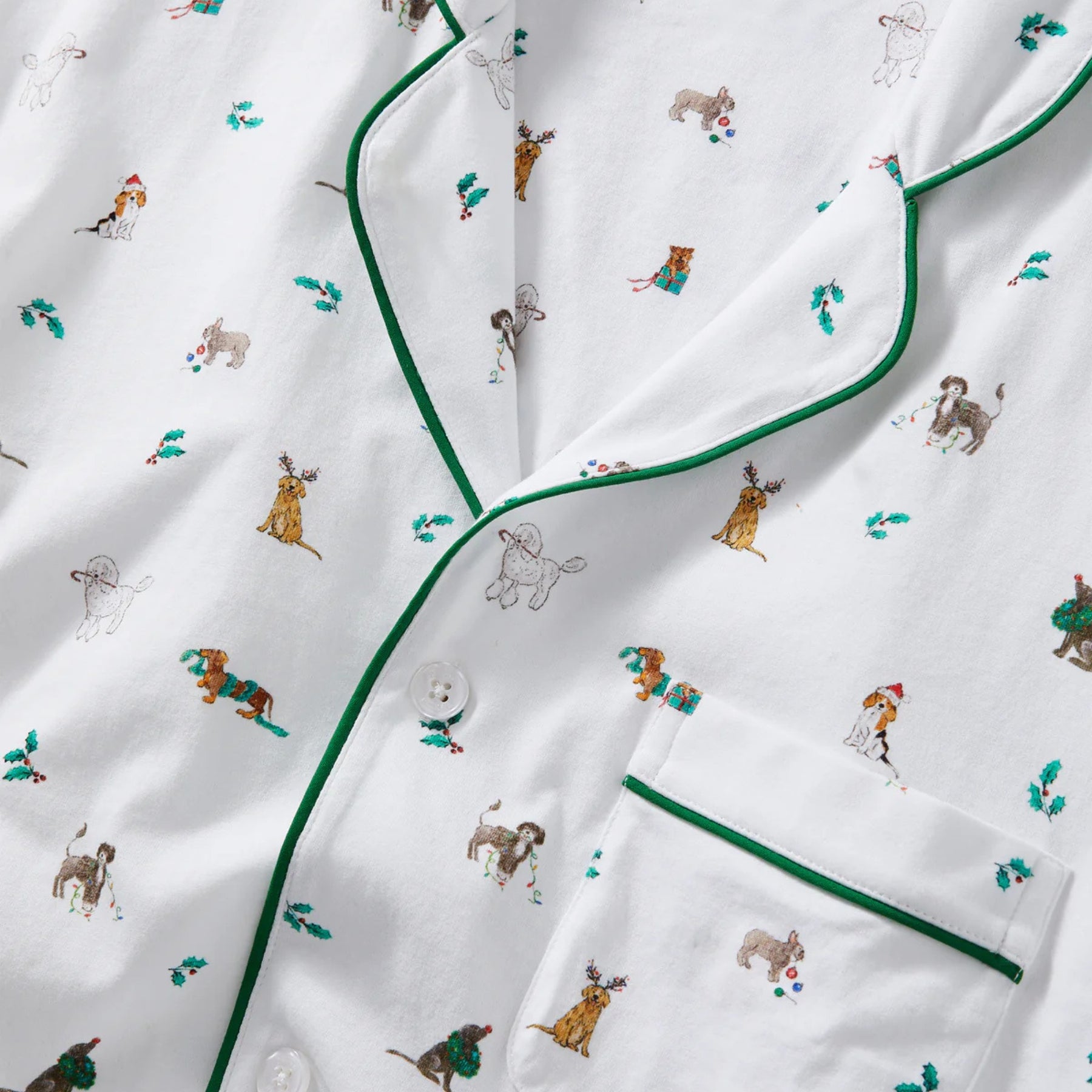 The Women’s Luxe Pima Jingle Paws Pajama brings a playful spirit to luxurious sleepwear. Crafted from 100% Peruvian Pima cotton, this charming set celebrates the season with a cheerful print of festive pups — from candy cane-carrying poodles to wreath-wearing labradors. With its buttery softness, breathable texture, and refined piping, this pajama set perfectly balances comfort and whimsy for cozy nights or relaxed mornings.