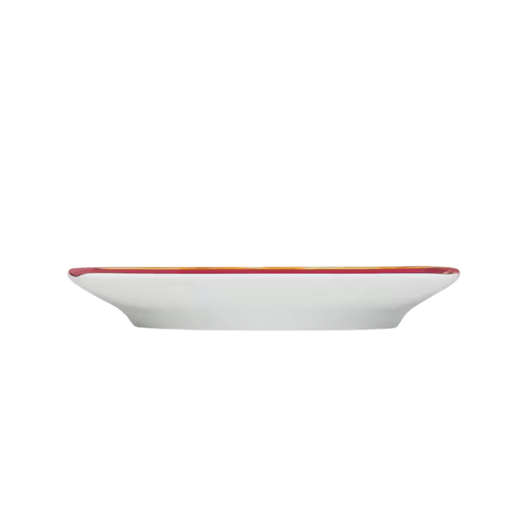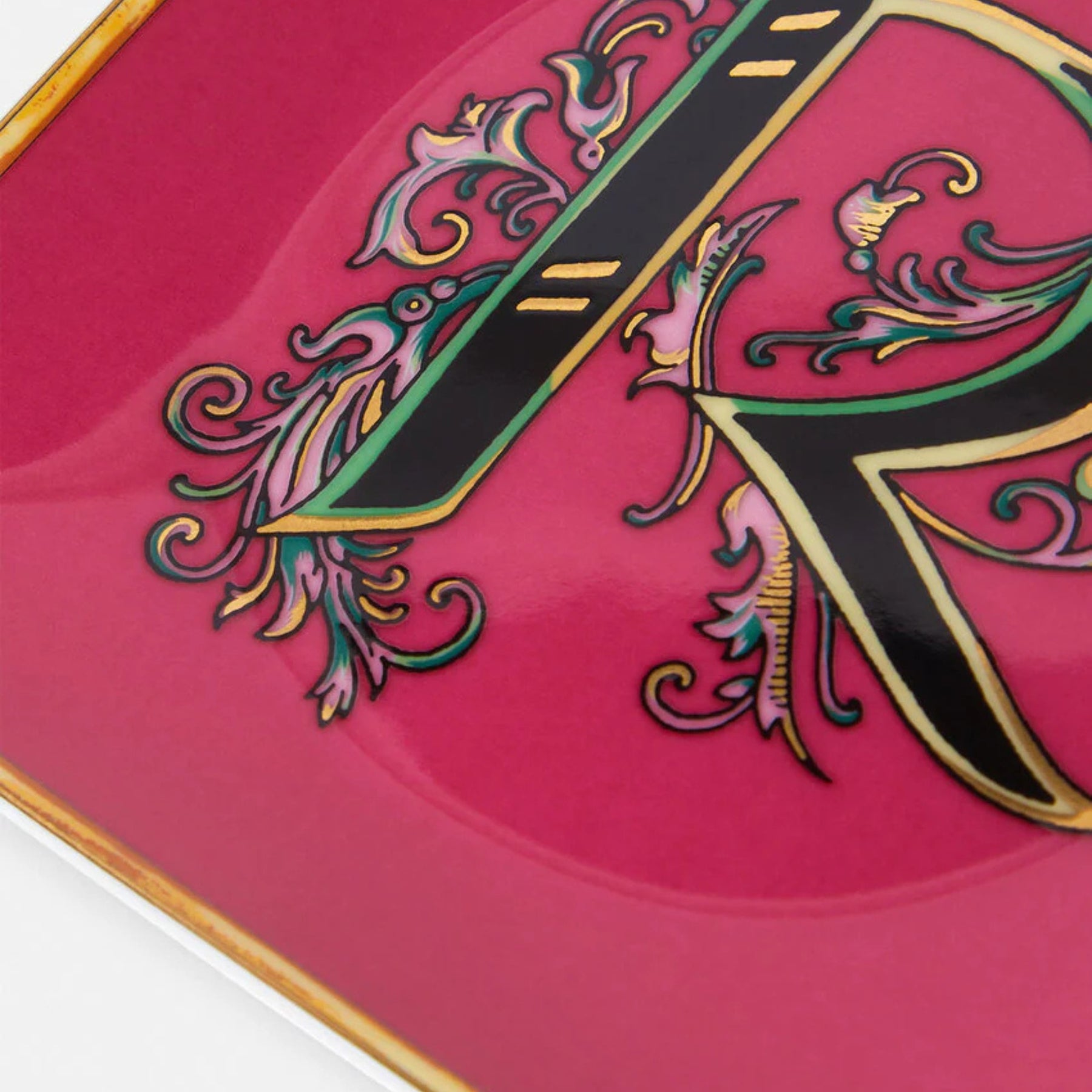 A striking blend of classic refinement and modern exuberance, the Versace Canape Dish – R celebrates the house’s devotion to expressive design and craftsmanship. Expertly crafted from fine porcelain, this decorative dish showcases the letter “R” adorned with elaborate Barocco scrolls, rendered in black, gold, and pastel hues that elegantly contrast against a vibrant fuchsia background.