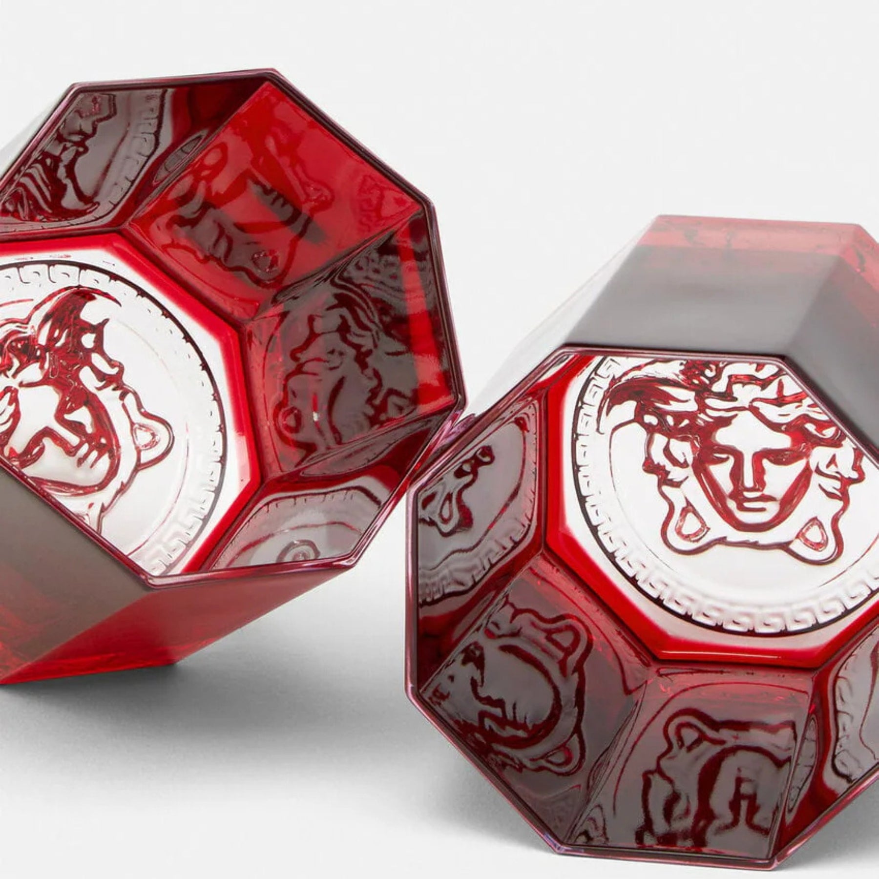 A celebration of Versace’s timeless opulence and artistry, the Medusa Lumière Haze Whiskey DOF Set transforms classic glassware into sculptural masterpieces. Each tumbler is expertly handcrafted from pure crystal and features the iconic Medusa head—seemingly suspended beneath two layers of translucent red glass, as though captured within its mythic gaze.
