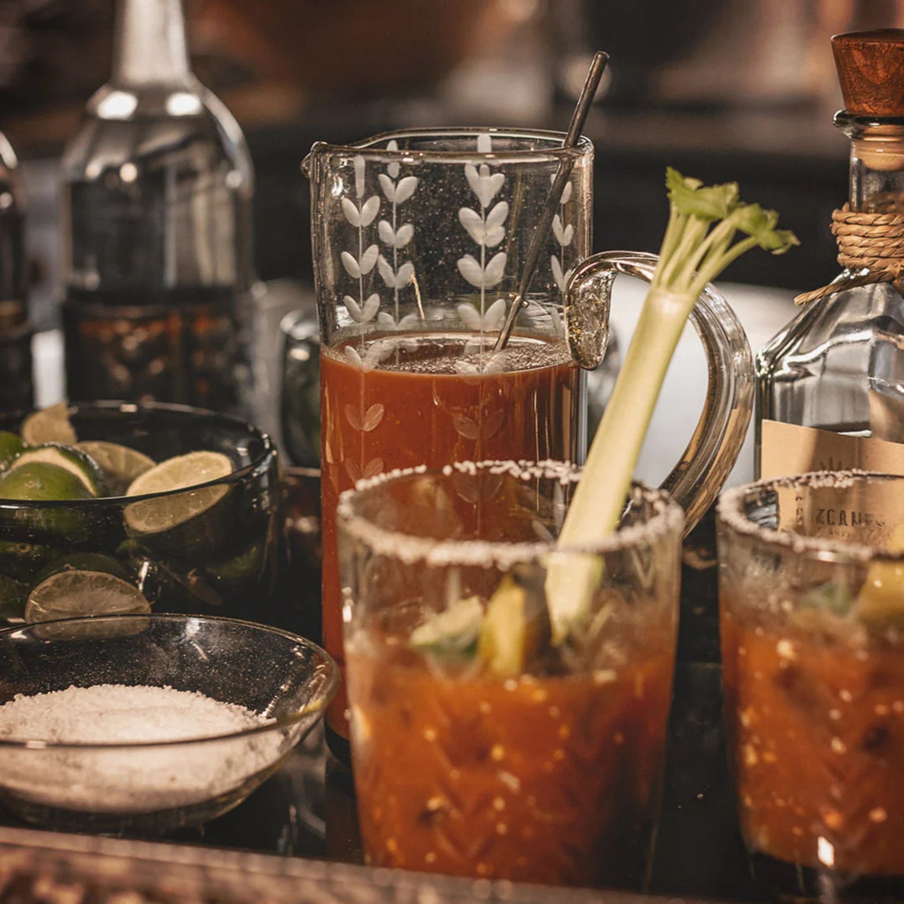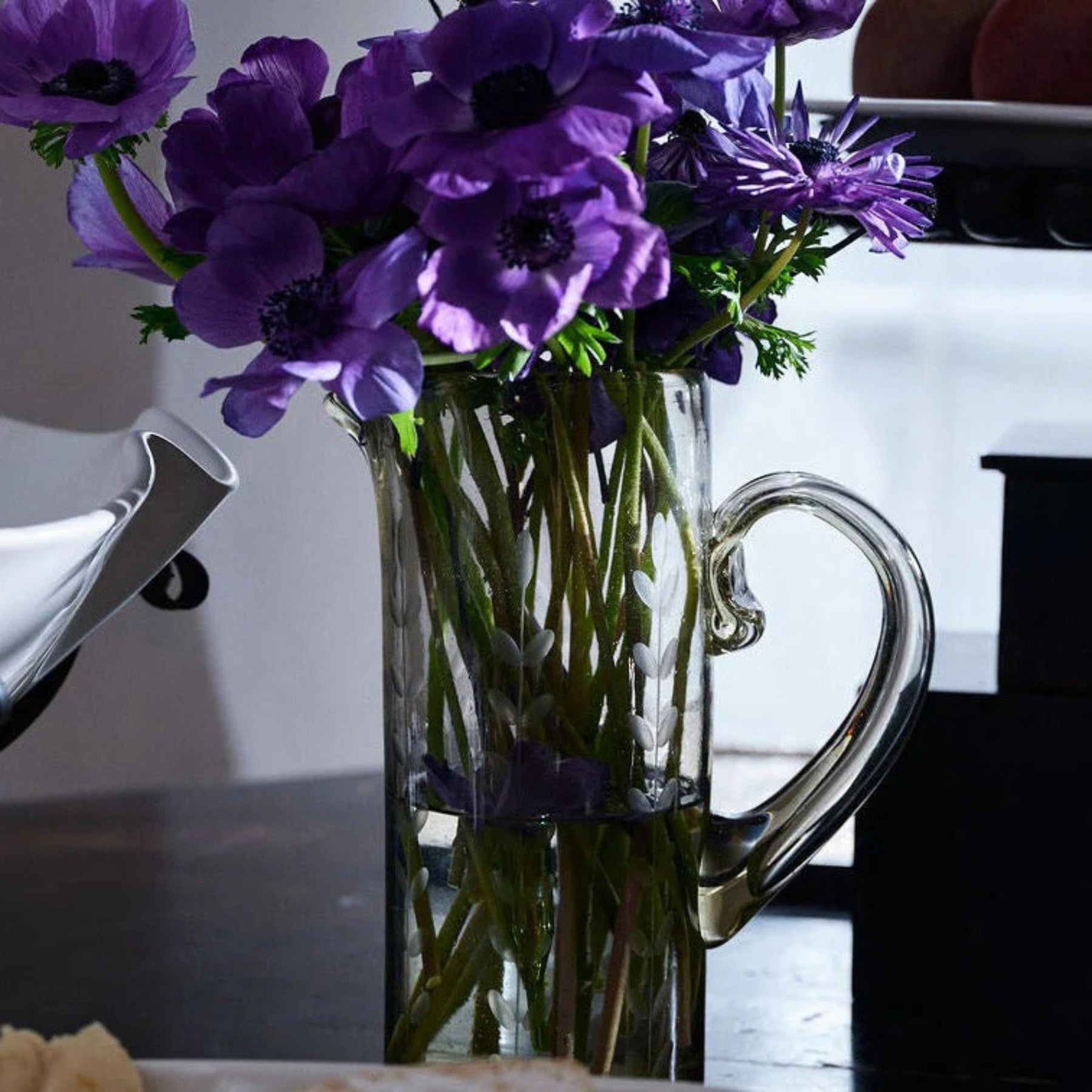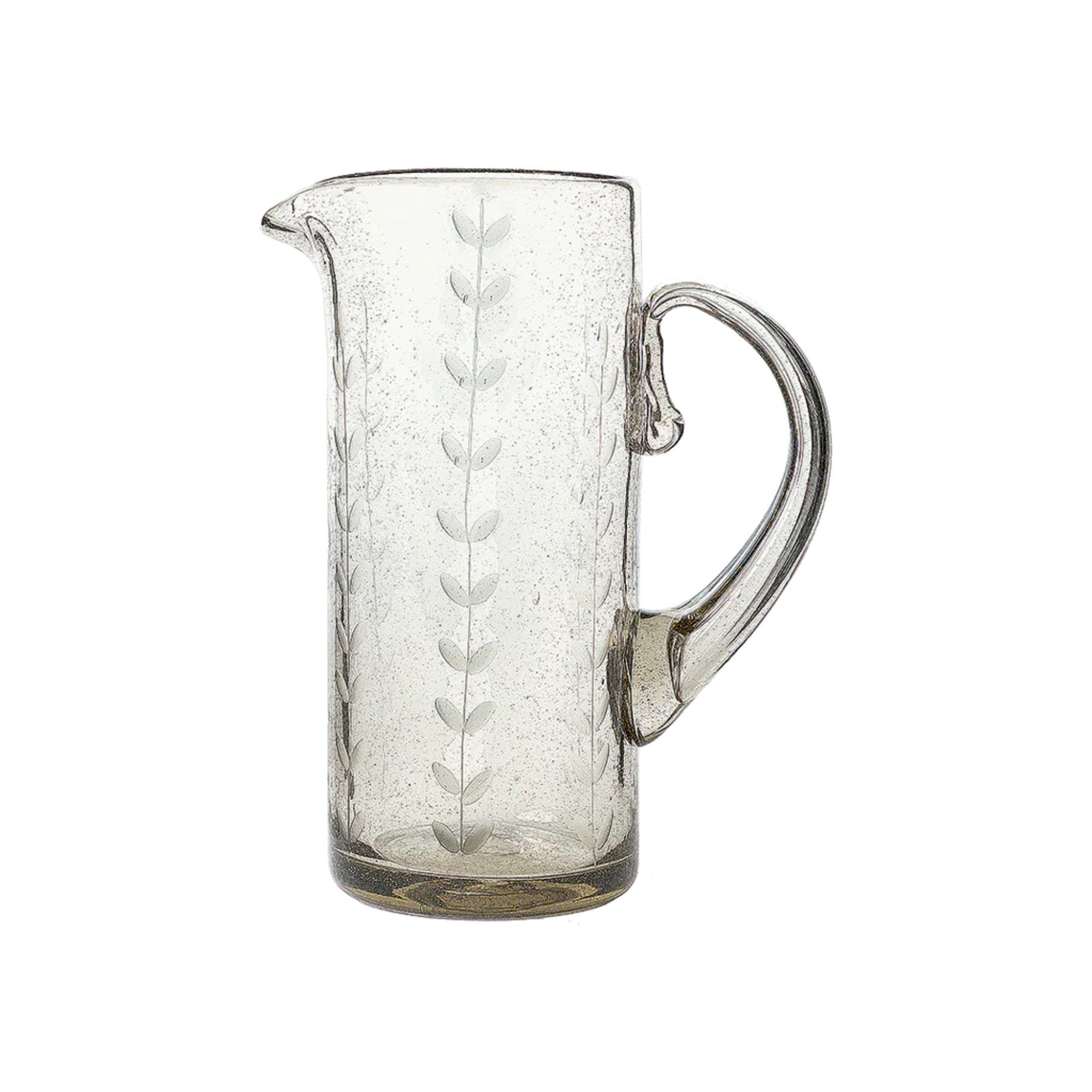 The Pepe Pitcher blends artisanal charm with everyday functionality, making it a beautiful addition to both casual and elevated table settings. Crafted from clear mouth-blown glass, it features a tall, slender silhouette adorned with an etched leaf motif that adds subtle texture and refined detail. The gracefully curved handle and gently tapered spout make pouring effortless, while its handcrafted nature gives each pitcher a unique character.