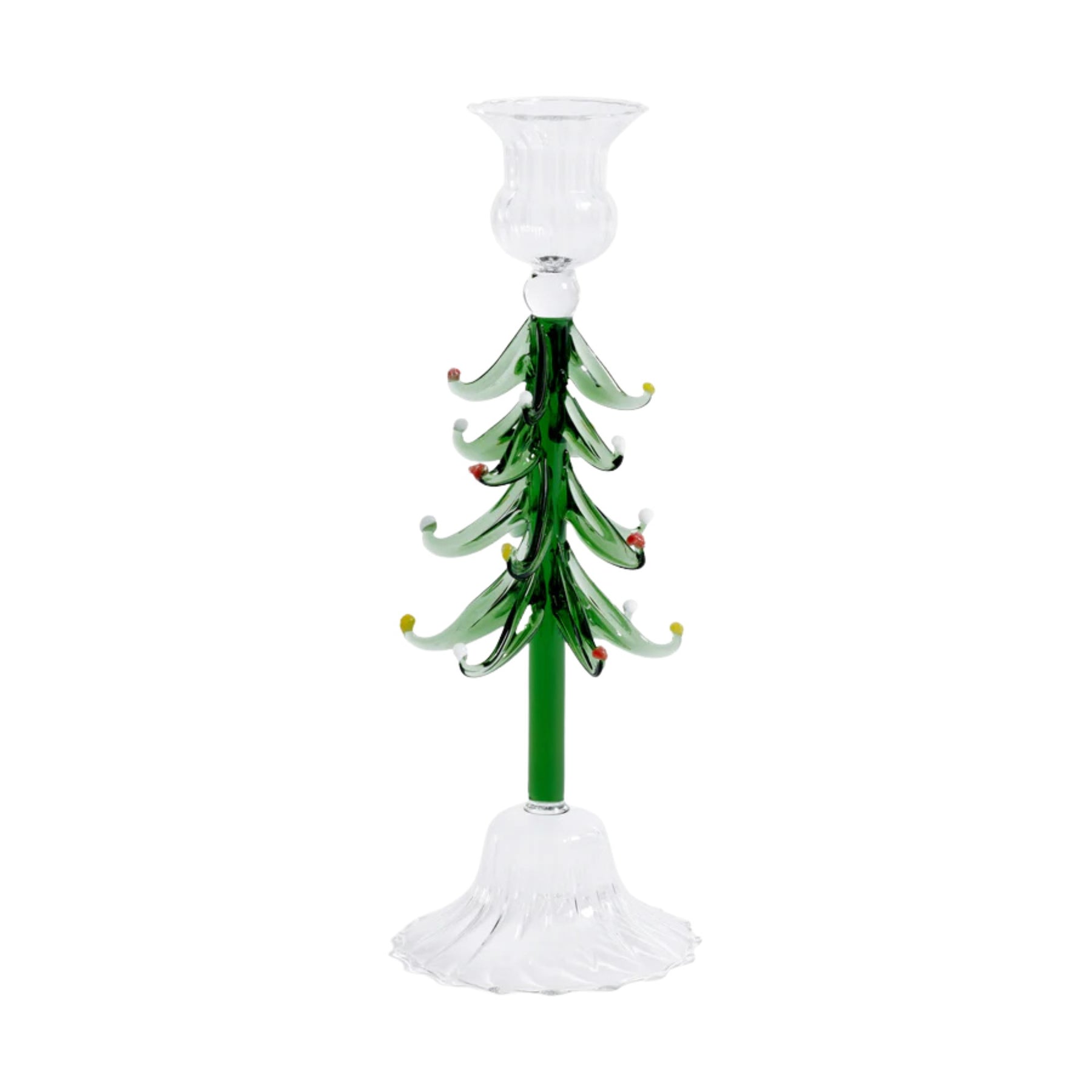 Bring festive charm to your holiday décor with the Holiday Tree Taper Holder - 9.25" - Clear/Green. Crafted entirely from glass, this unique taper holder takes the shape of a Christmas tree, with vibrant green branches and a clear base for added stability. Its tall and elegant form makes it a perfect accent for mantels, dining tables, or as a centerpiece that captures the holiday spirit.