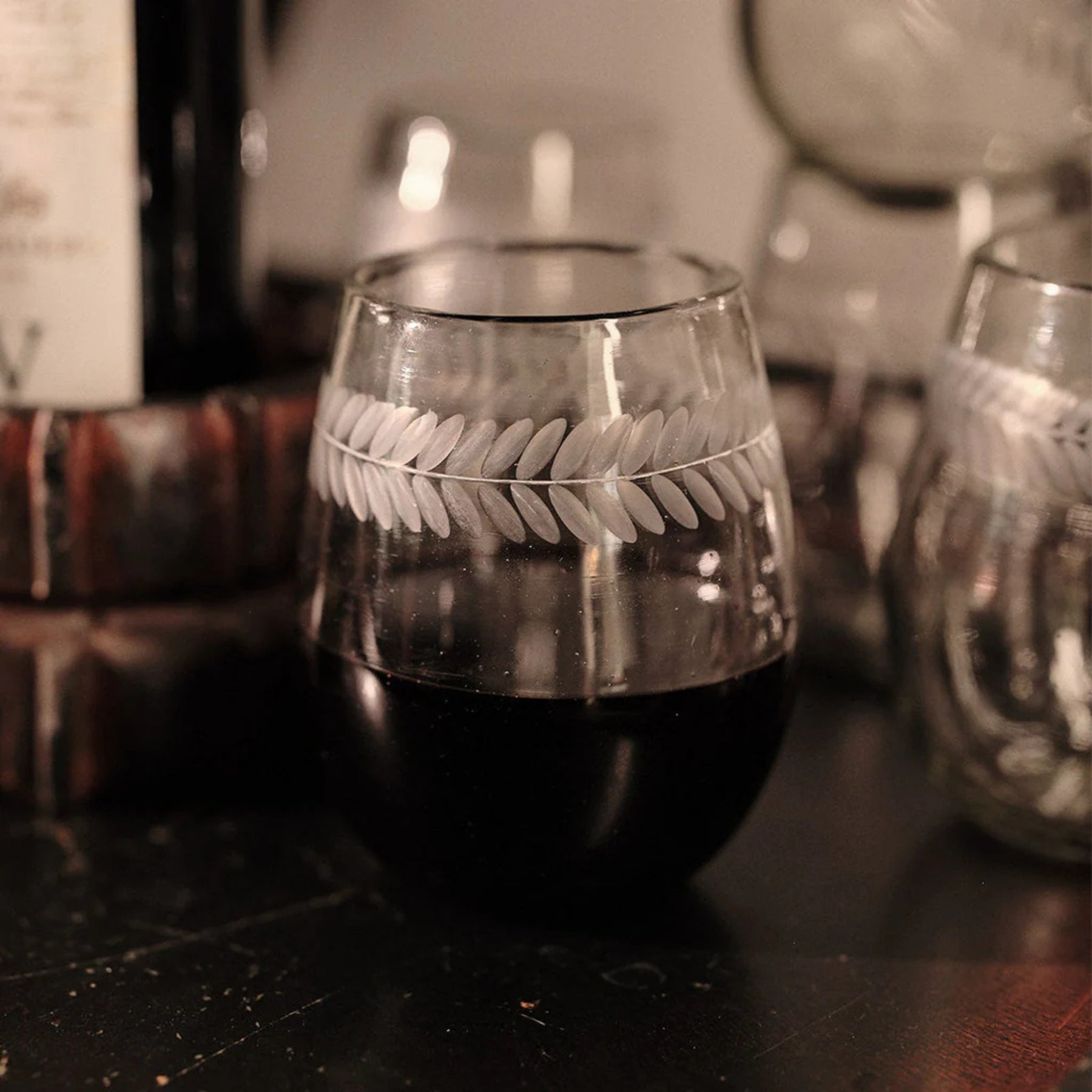 The Honor Stemless Wine Glass combines timeless elegance with artisanal charm. Crafted from mouth-blown glass, each piece features a softly rounded silhouette and a delicate etched leaf motif that adds refined texture and visual interest. Lightweight yet durable, this stemless design elevates everyday dining and enhances special gatherings with effortless sophistication.