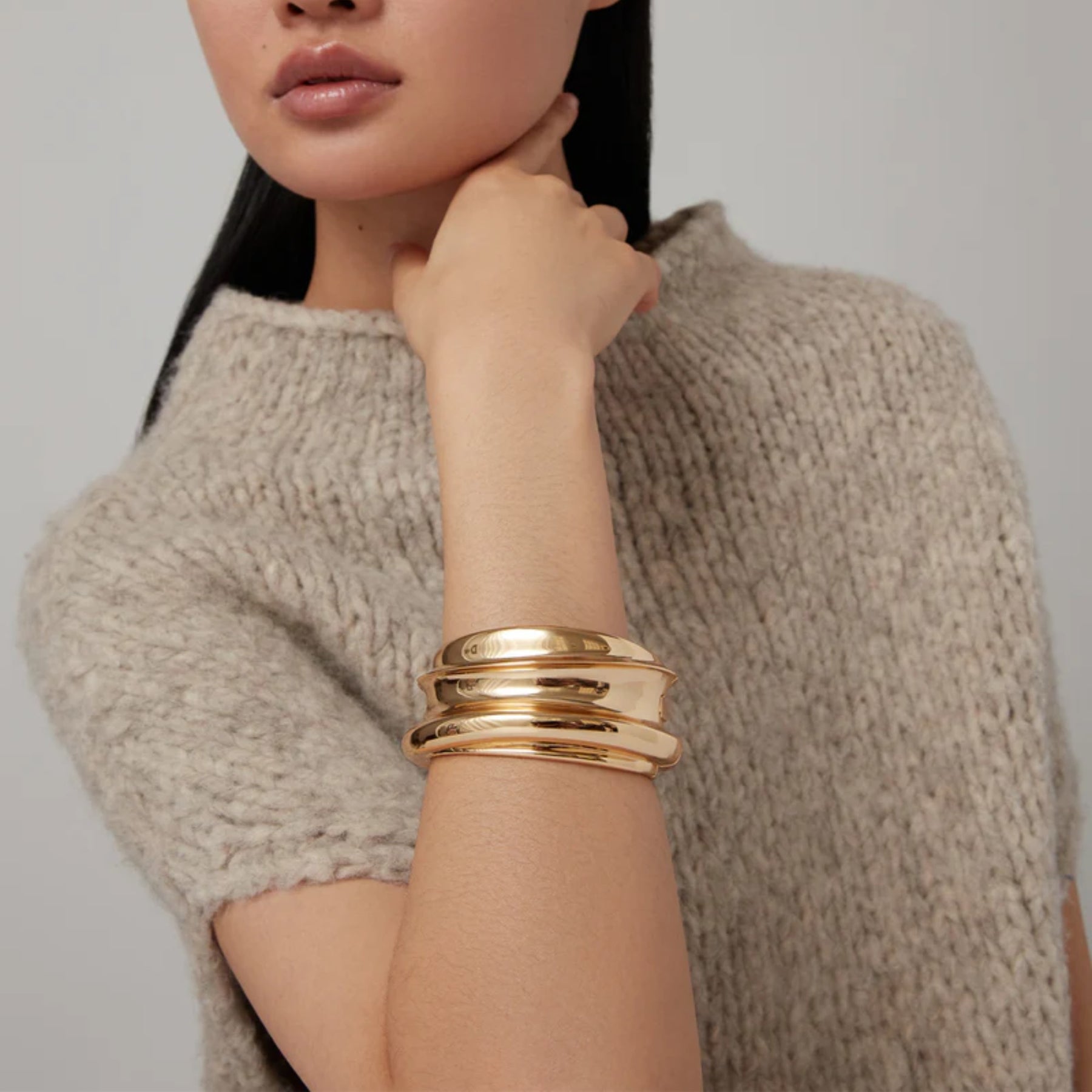 The Lennon Mega Bangle is more than just jewelry—it’s wearable art. With its bold sculptural form and luminous gold finish, it delivers effortless glamour. Whether worn solo as a statement piece or layered with other bangles, it will always stand out.