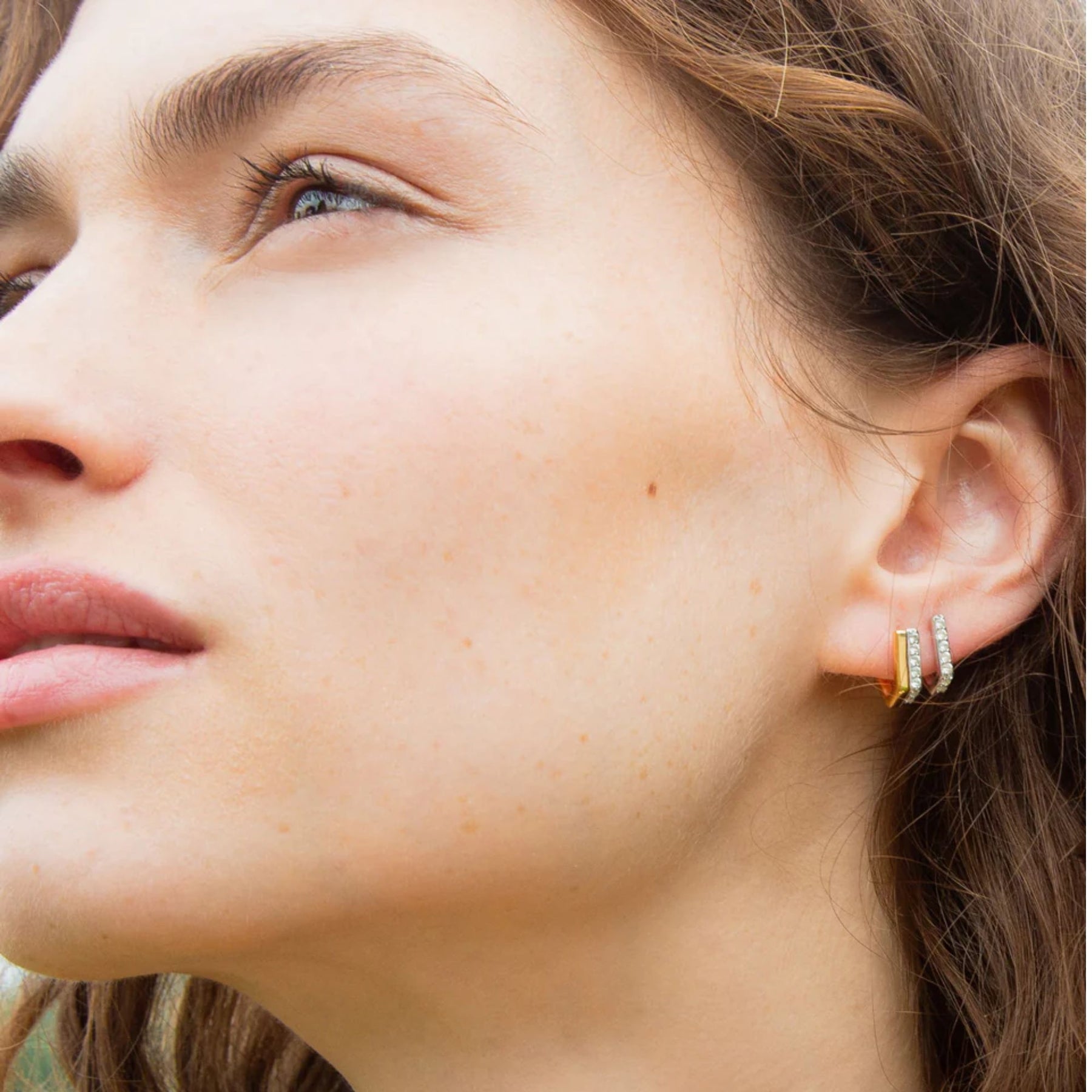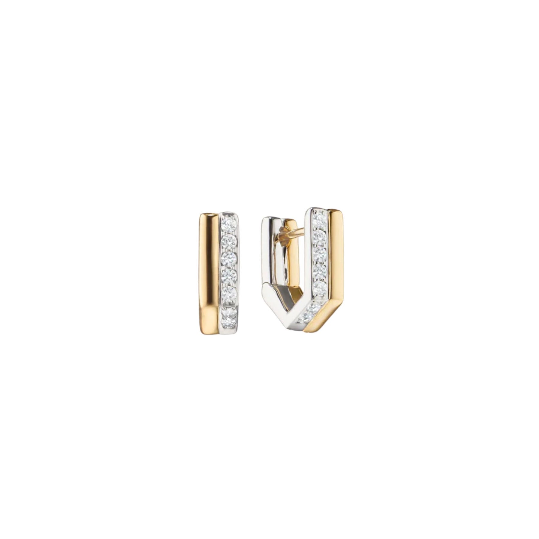 Crafted in sterling silver and 18K yellow gold, each huggie is accented with pavé white sapphires for subtle sparkle. The streamlined profile makes these earrings effortless for everyday wear—refined, modern, and endlessly versatile. Wear them individually or as a matching pair.