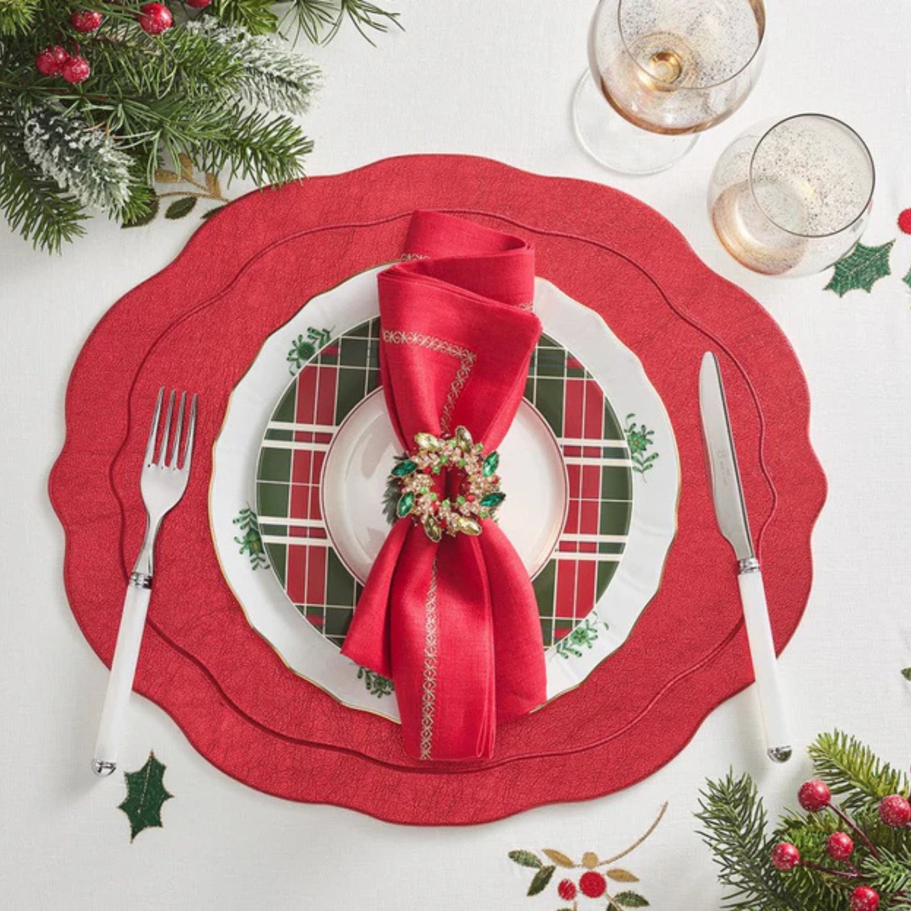 Bring the sparkle of the season to your table with the Gem Wreath Napkin Ring set. Inspired by the beauty of holiday wreaths, these napkin rings feature a dazzling arrangement of multi-colored gemstones meticulously set in a gold-tone base. The wreath-shaped design adds an element of festive luxury, making each place setting shine. Perfect for holiday entertaining or gifting, they are a radiant addition to any table décor.