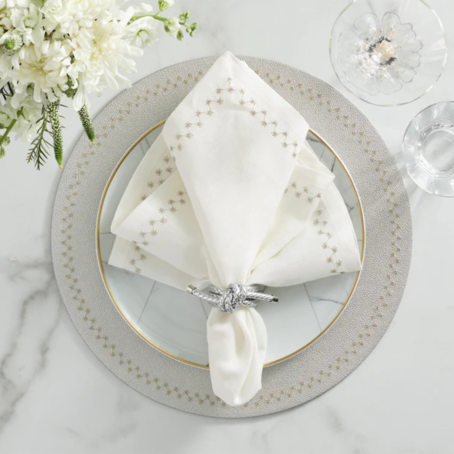 The Rope Knot Napkin Ring brings a touch of nautical sophistication to any table setting. This design celebrates simplicity and craftsmanship, featuring braided faux silver leather cords meticulously knotted to form a modern yet timeless accent. Its coastal-inspired elegance effortlessly complements both casual seaside gatherings and formal dining occasions, offering a polished finishing touch that reflects light beautifully and enhances any tablescape.