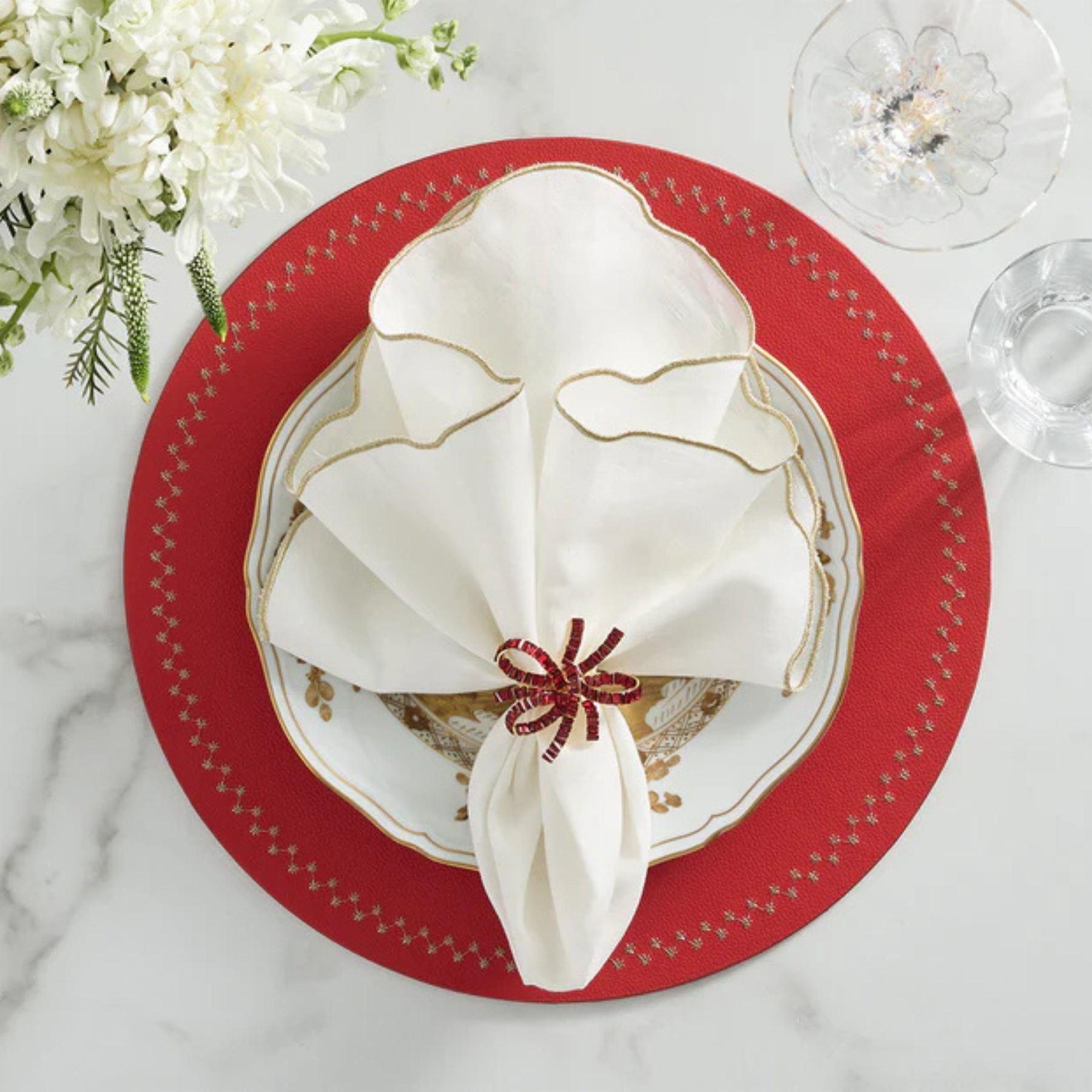 The Starry Night Placemat in Red is your table’s guiding light for effortless style. Its vibrant color and lustrous trim make it a standout piece for both festive dinners and intimate meals. Durable yet refined, it offers easy maintenance and long-lasting elegance. Pair it with the matching Starry Night Napkins and Coasters for a coordinated look that sparkles from every angle.