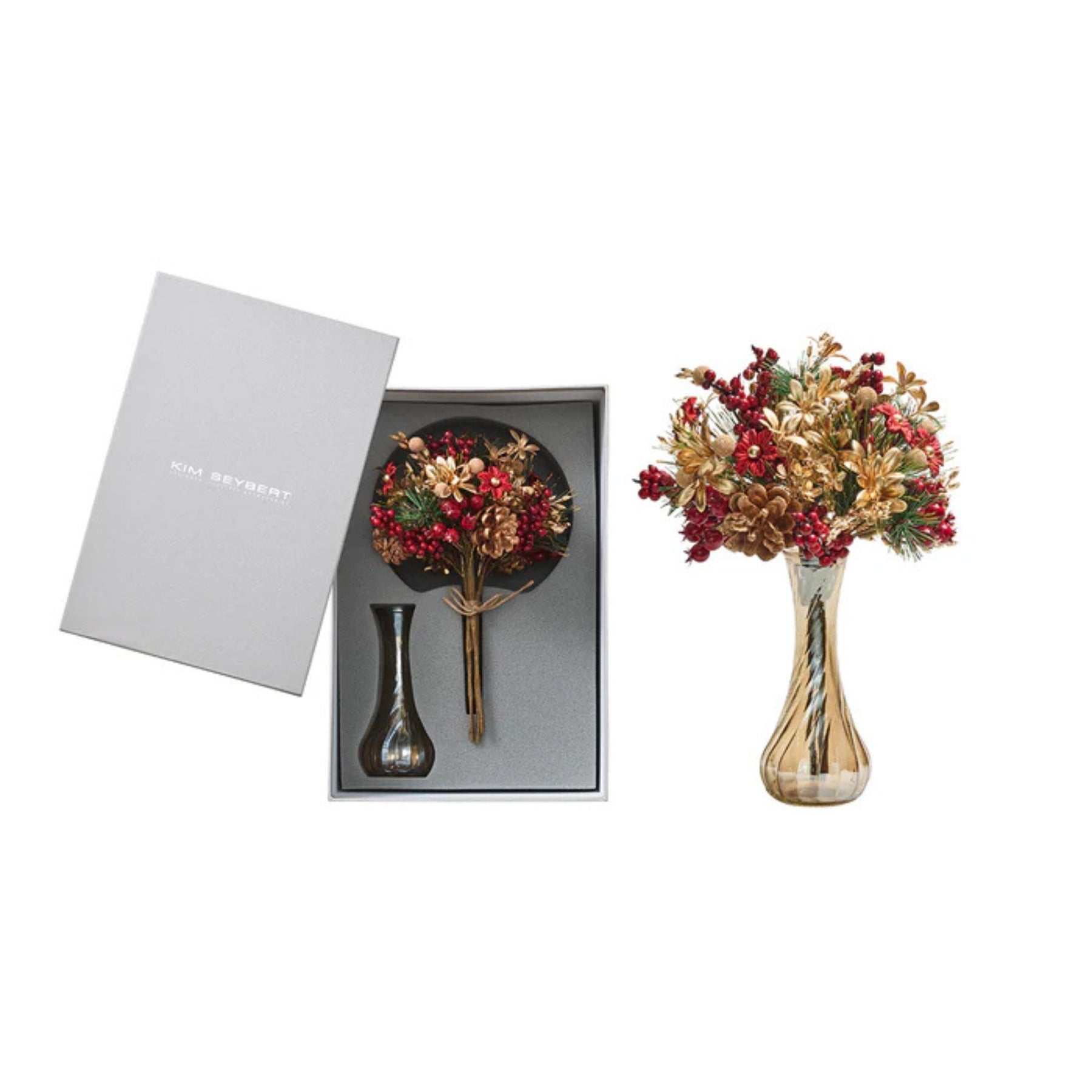 The Xmas Cheers 11" Bouquet transforms any space into a holiday haven with its rich reds, shimmering golds, and lifelike greenery. Its timeless beauty lasts season after season, making it a perennial favorite for both gifting and decorating. Whether placed on a dining table, mantel, or entryway, this arrangement brings an air of luxurious festivity and handcrafted elegance to your home.
