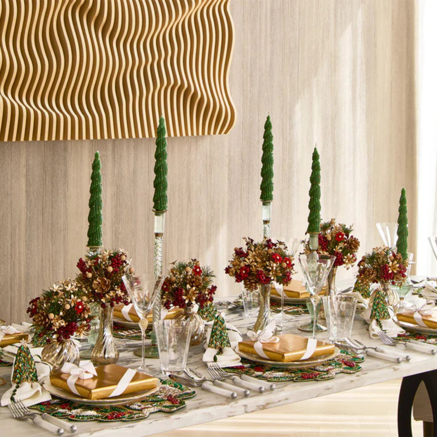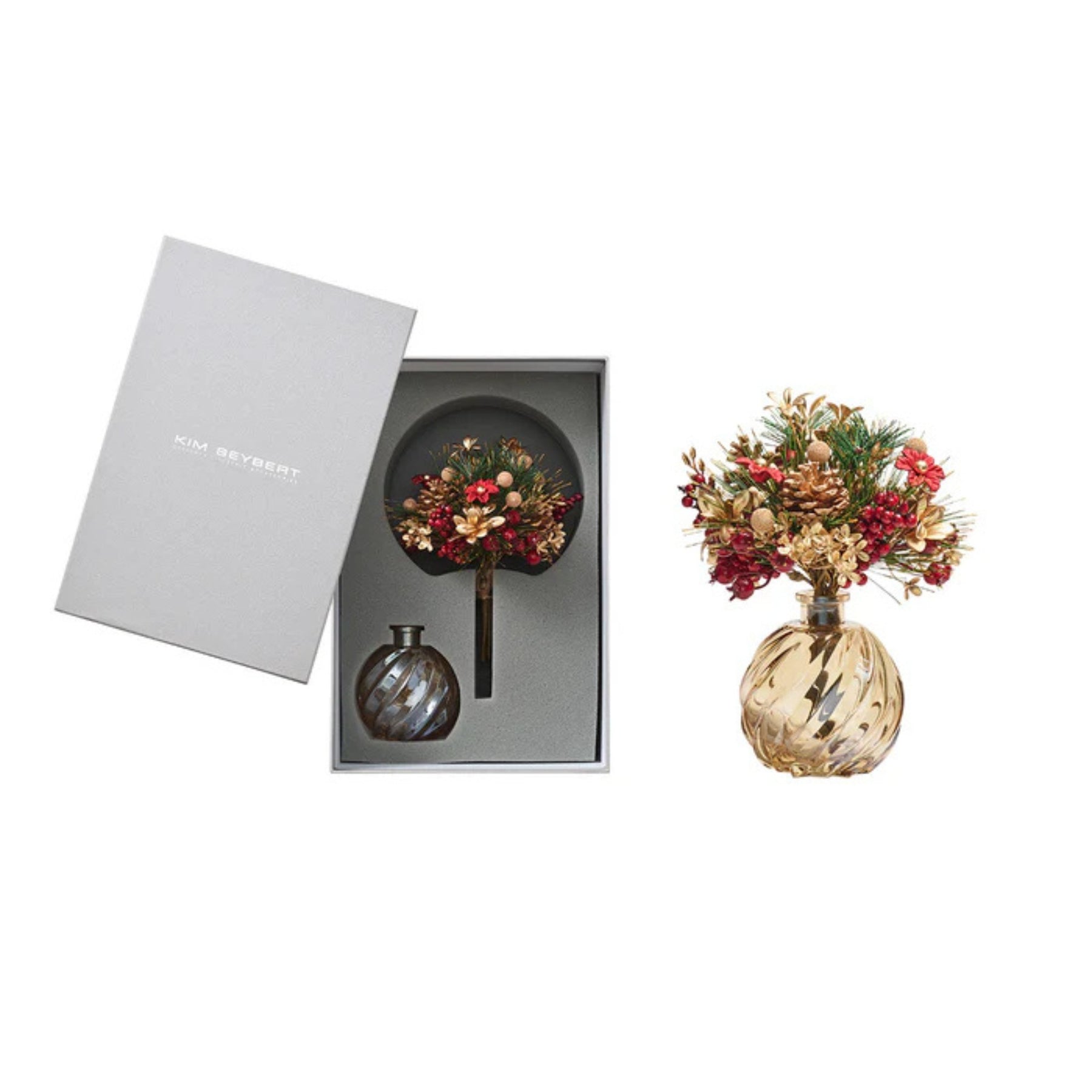 • Design: Handcrafted evergreen arrangement with metallic florals and festive berries in a swirling glass vase
