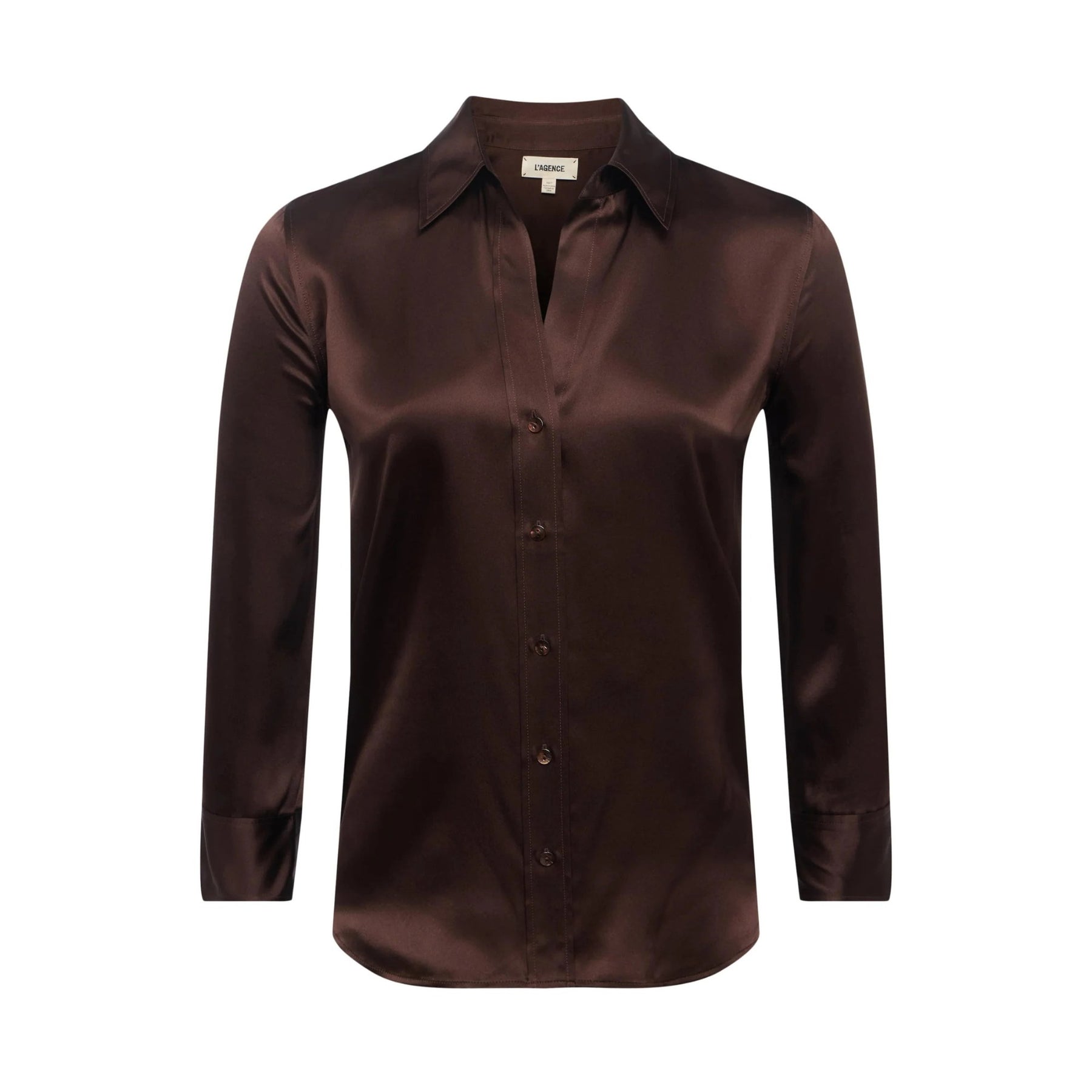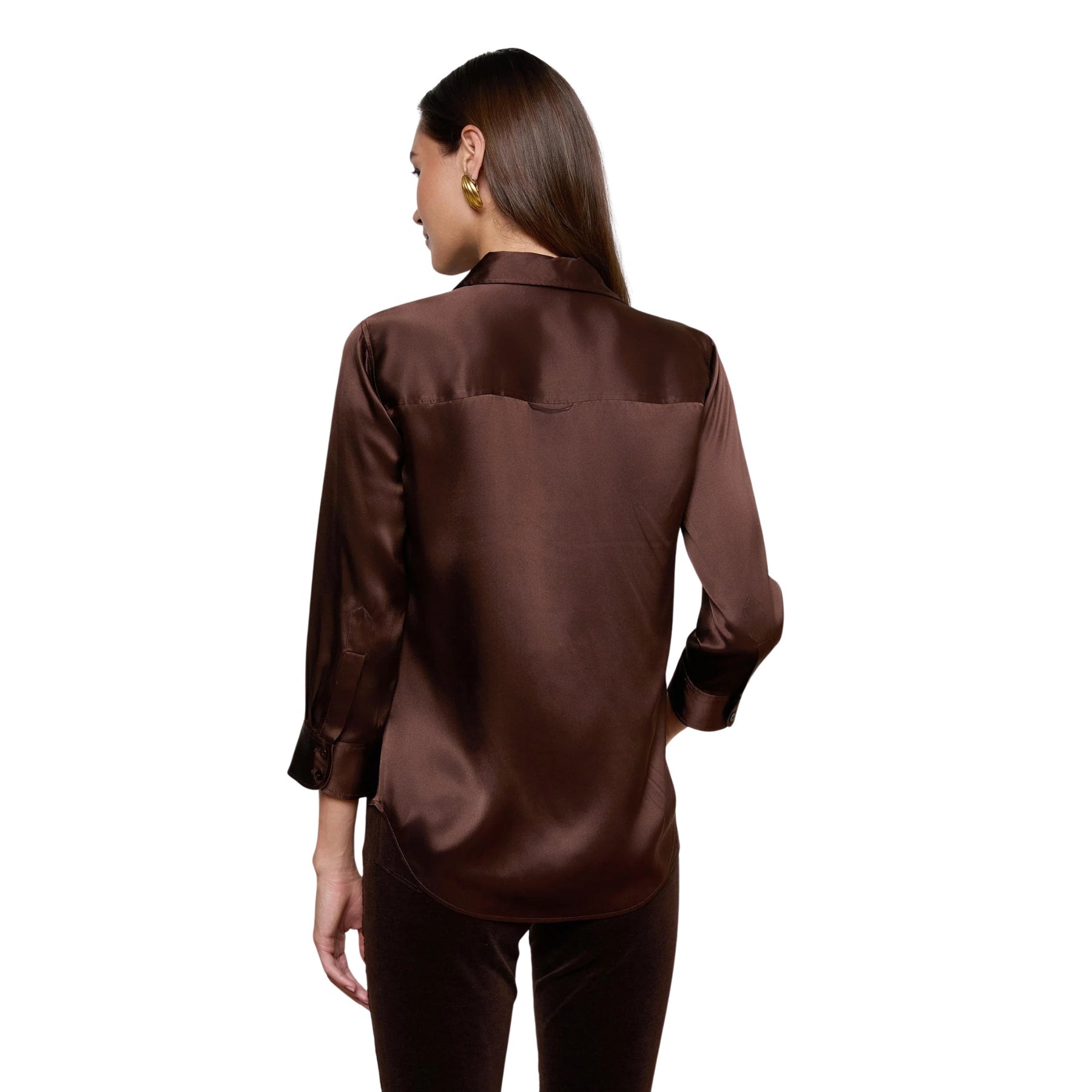 The Dani Blouse is an iconic silk button-down designed to bring timeless sophistication to every wardrobe. Cut in luxurious silk charmeuse, it drapes effortlessly while offering a refined sheen. Now refreshed in a rich coffee bean brown, it’s the ultimate versatile piece for desk-to-dinner styling.
