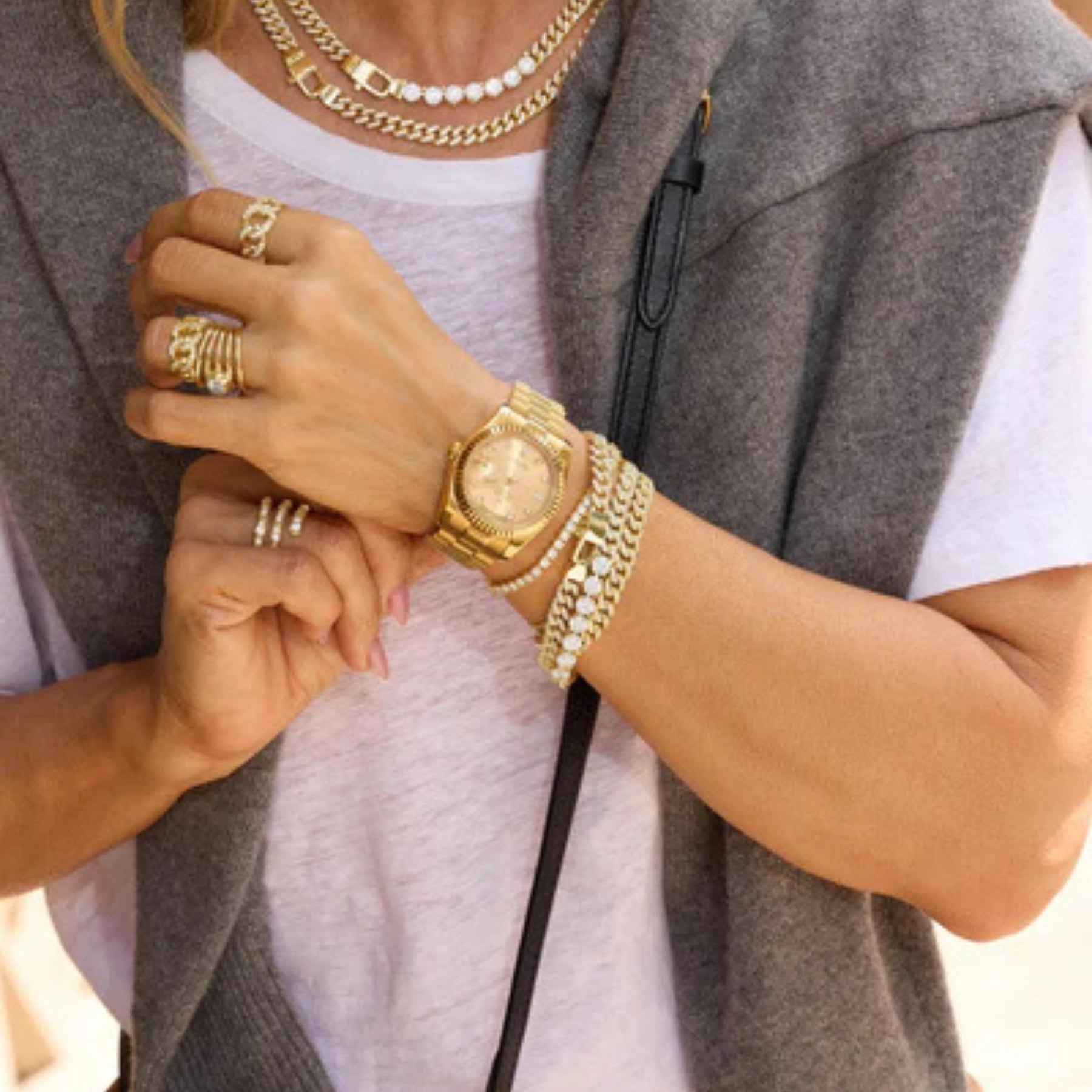 The Graduated Pavé Julian Ring – Gold/White redefines bold sophistication with a touch of sparkle. Inspired by iconic Cuban chain links, this statement ring features graduated links that create a dynamic, sculptural silhouette. Each curve is adorned with pavé simulated diamonds that catch the light beautifully, blending strength and elegance in perfect harmony.