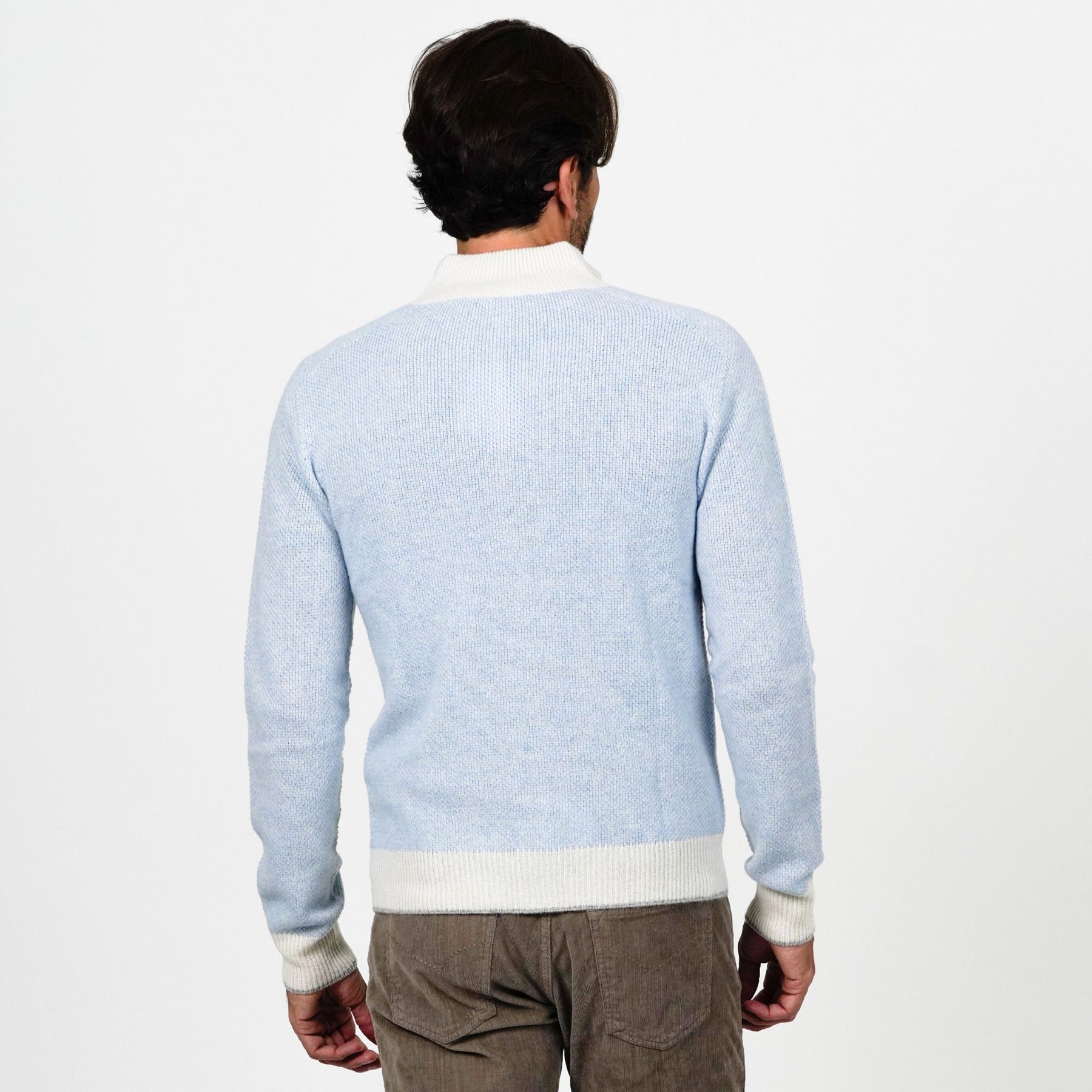 A modern classic with a refined twist, this Fradi zip knit combines soft comfort with standout detailing. The light blue knit is framed with contrast trim at the collar, cuffs, and hem, adding subtle visual interest while keeping the look effortlessly polished. Crafted from a comfortable, breathable blend, it’s the ideal layering piece for cooler days — equally suited for weekend wear or elevated casual dressing.