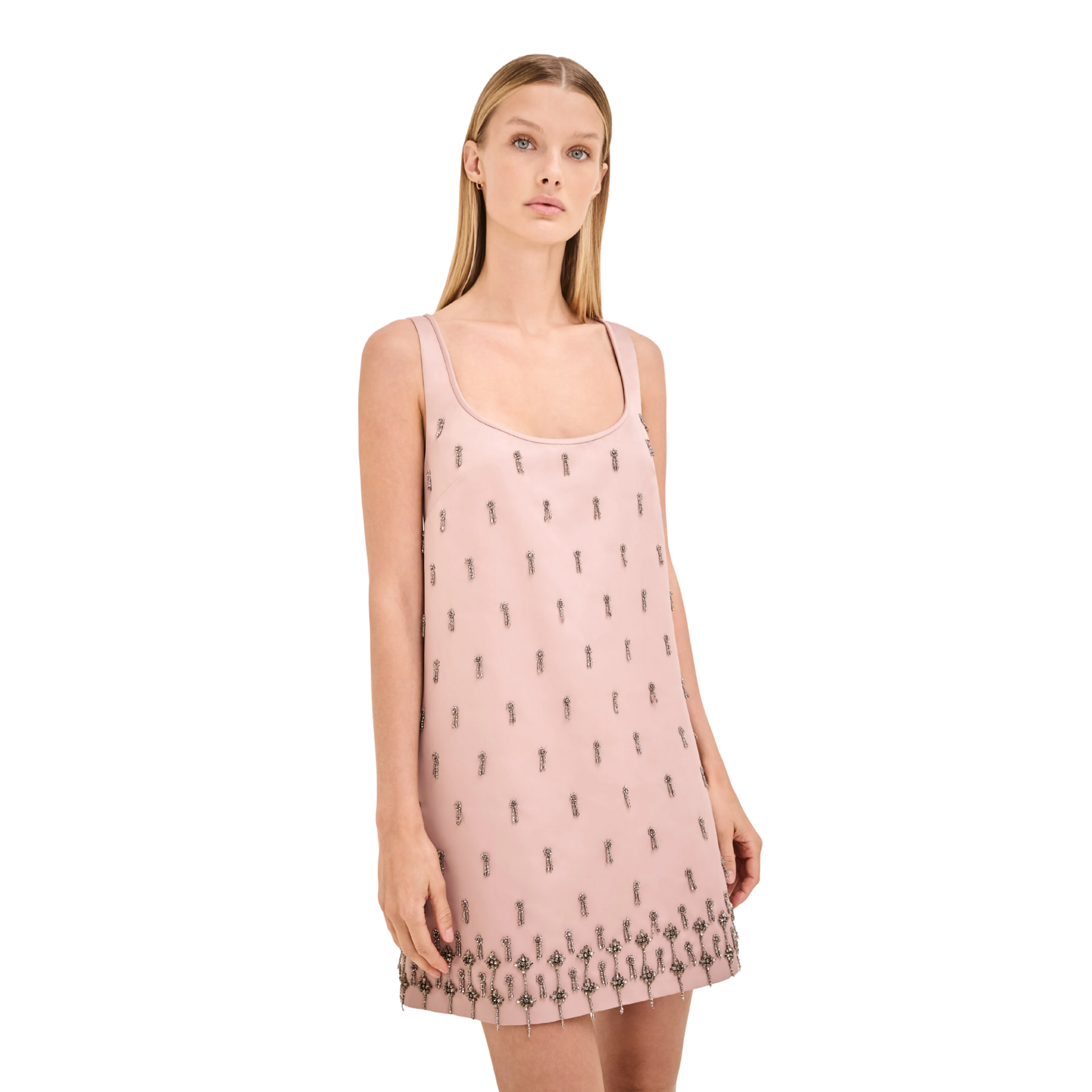 The Delma Dress is a scoop-neck mini dress with beaded embellishments and a beaded fringe hem.