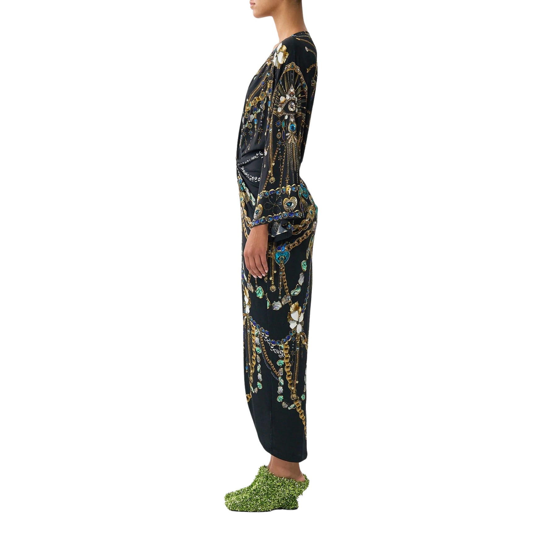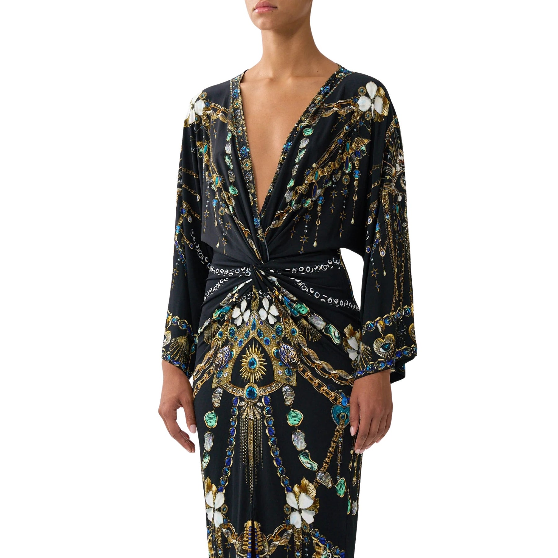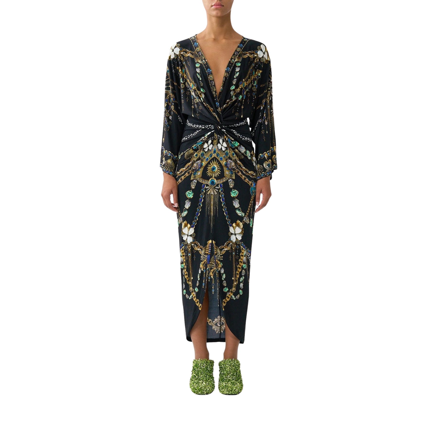 The Amulets And Alchemy Long Split Front Twist Dress is a statement maxi designed for high-impact evenings. Handcrafted by in-house artisans in an exclusive CAMILLA print, this draped jersey dress sculpts the figure with a twisted front and elongating lines, while crystal embellishment adds jewel-like sparkle. A V neckline, long sleeves, and dramatic front split balance coverage with movement for a look that feels both glamorous and effortless.
