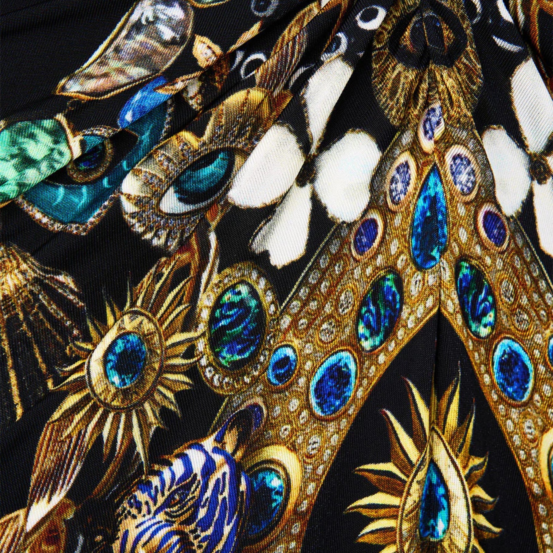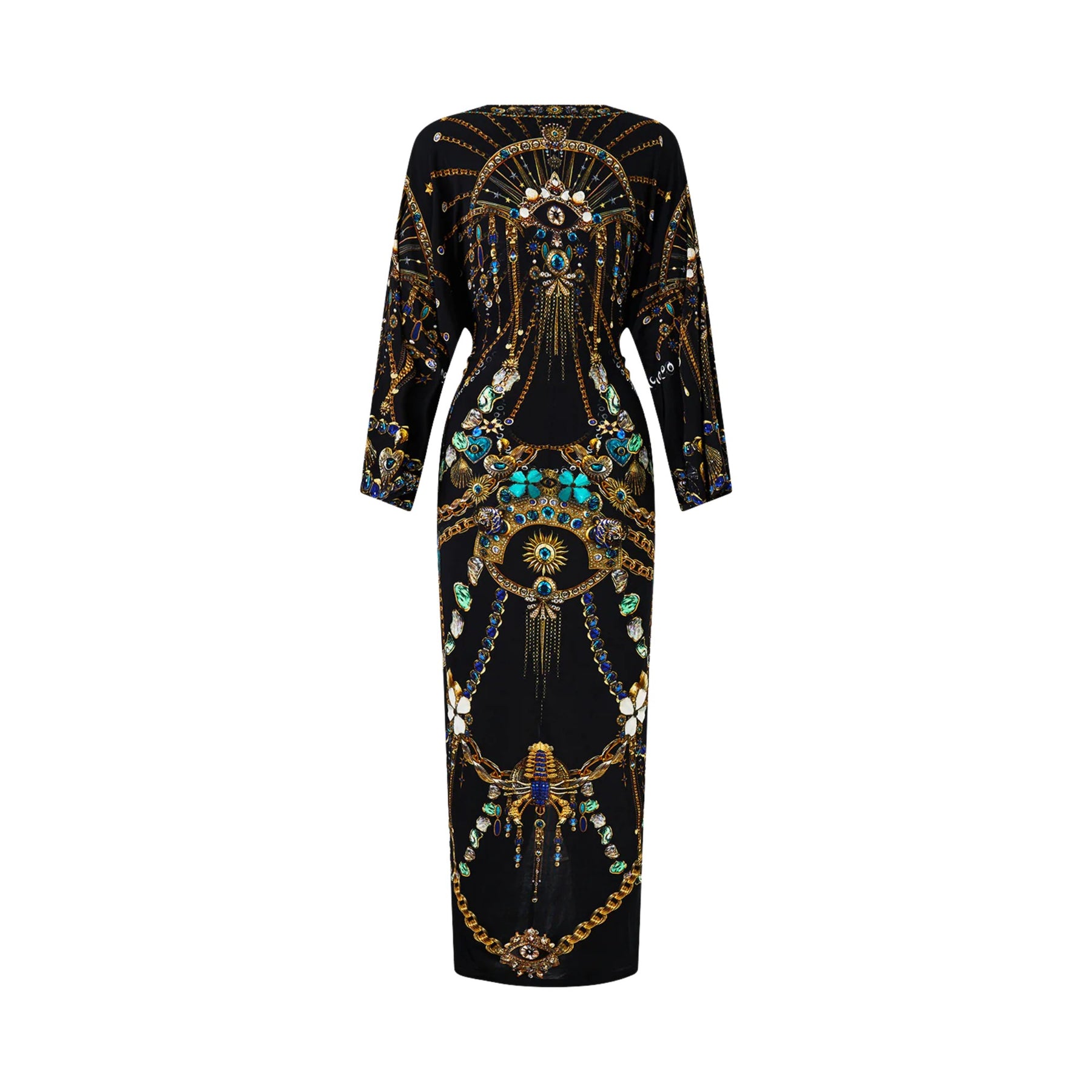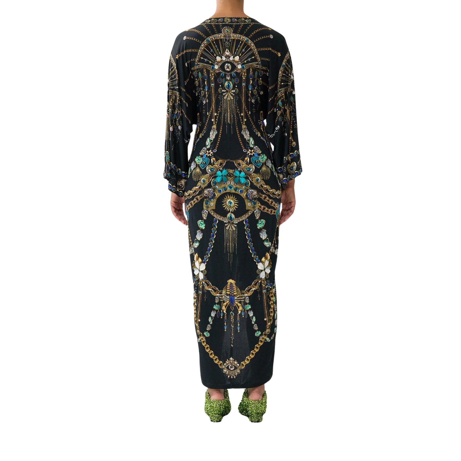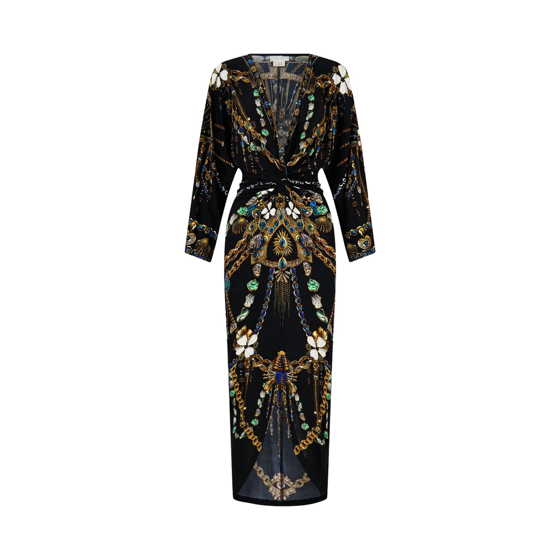 The Amulets And Alchemy Long Split Front Twist Dress is a statement maxi designed for high-impact evenings. Handcrafted by in-house artisans in an exclusive CAMILLA print, this draped jersey dress sculpts the figure with a twisted front and elongating lines, while crystal embellishment adds jewel-like sparkle. A V neckline, long sleeves, and dramatic front split balance coverage with movement for a look that feels both glamorous and effortless.