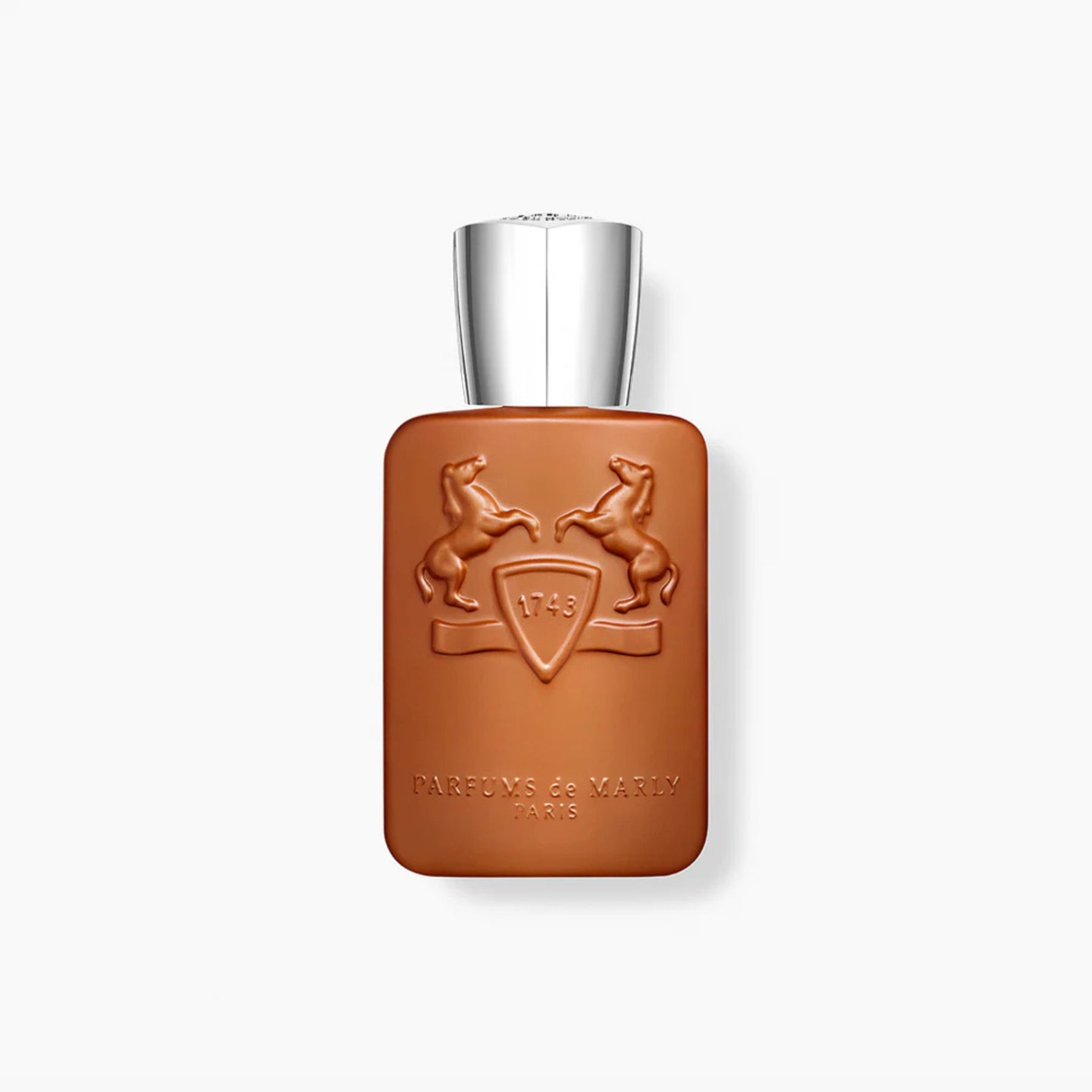 Bottle Design: Distinctive warm caramel-brown flacon with embossed Parfums de Marly crest, finished with a sleek silver cap