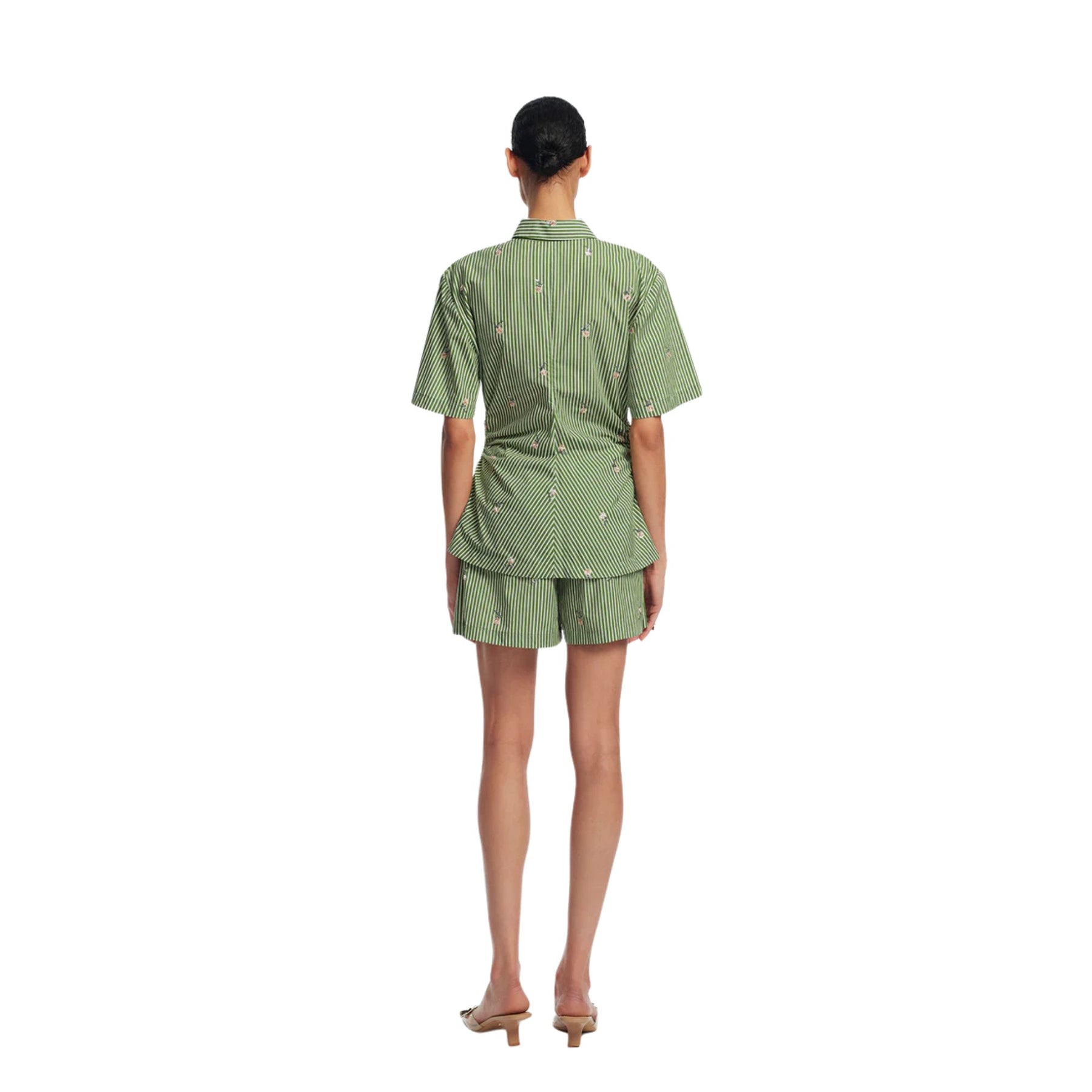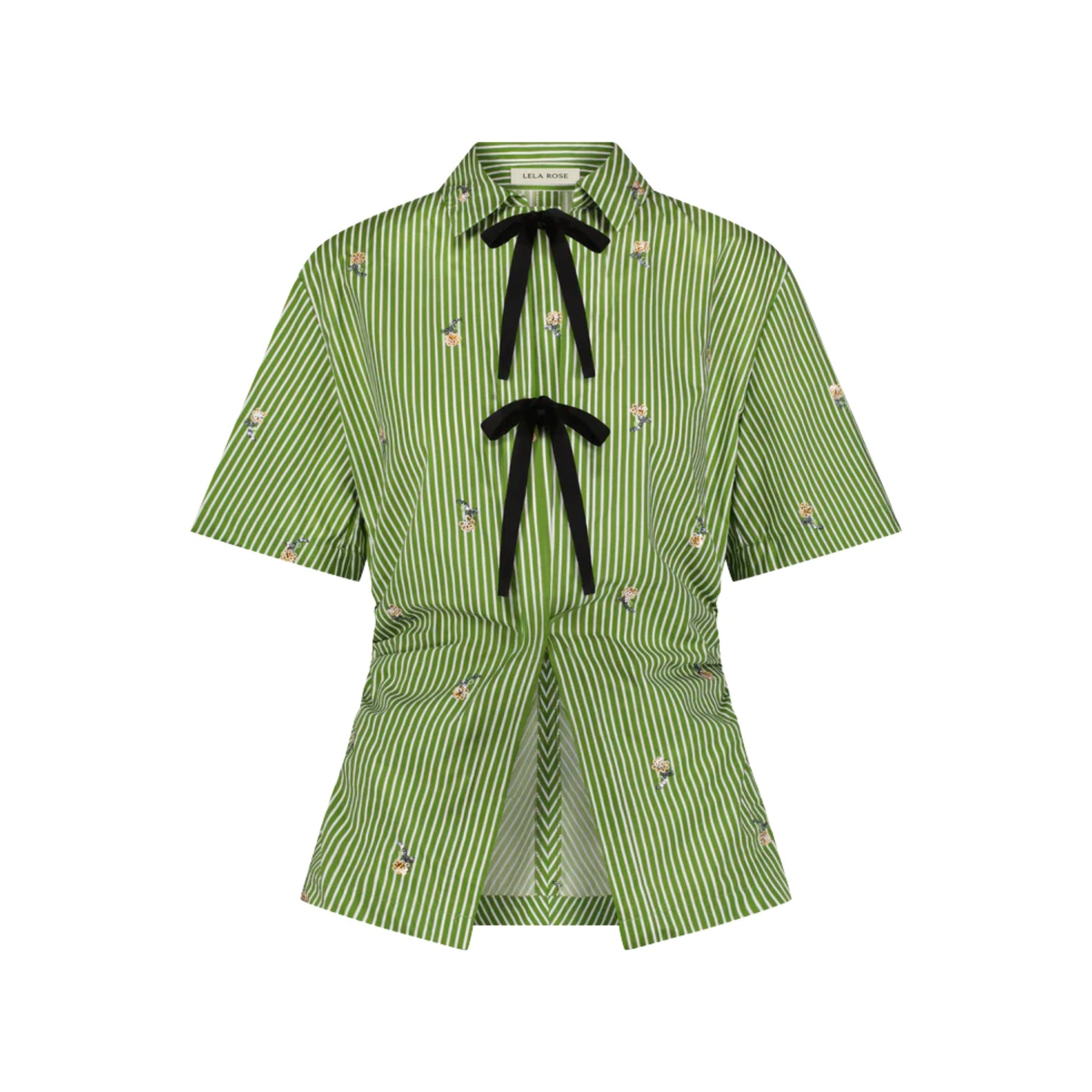 Playful yet polished, the Embroidered Stripe Cotton Bow Front Shirt blends classic tailoring with feminine detail. Crafted from crisp cotton in a fresh cactus stripe, this silhouette features a fitted waist and subtle peplum hem for a flattering shape. Delicate hand-embroidered wildflowers add texture and charm, while bow front closures create a soft, romantic finish.