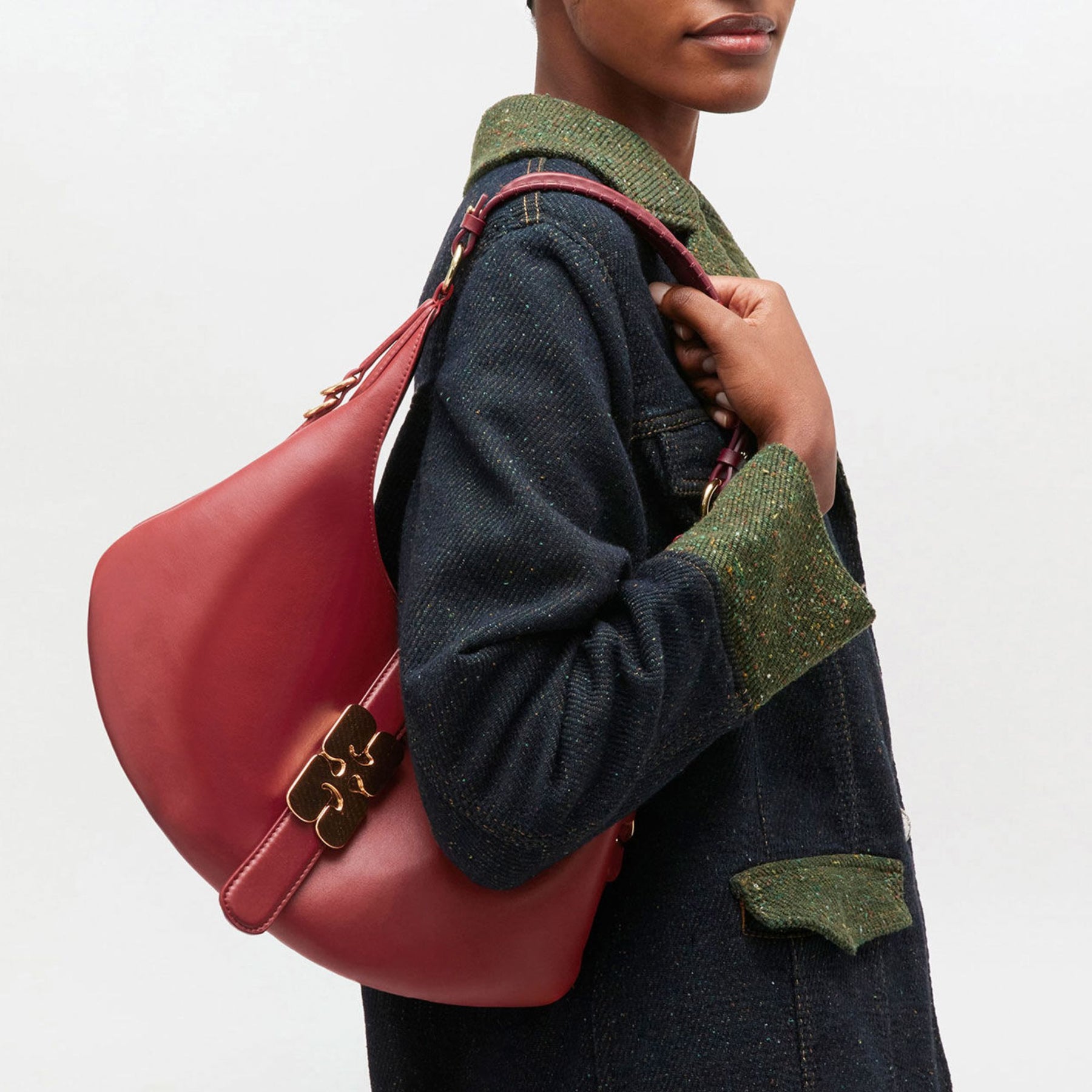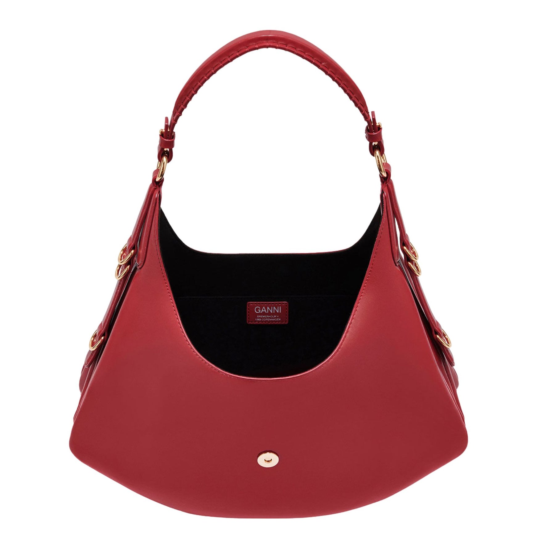 A refined take on everyday sophistication, this GANNI shoulder bag features a soufflet-style silhouette finished with gold-tone hardware and the signature Butterfly clasp. Designed with a structured yet supple shape, it includes a single main compartment, an interior open pocket, and D-ring detailing at the side for a modern edge.