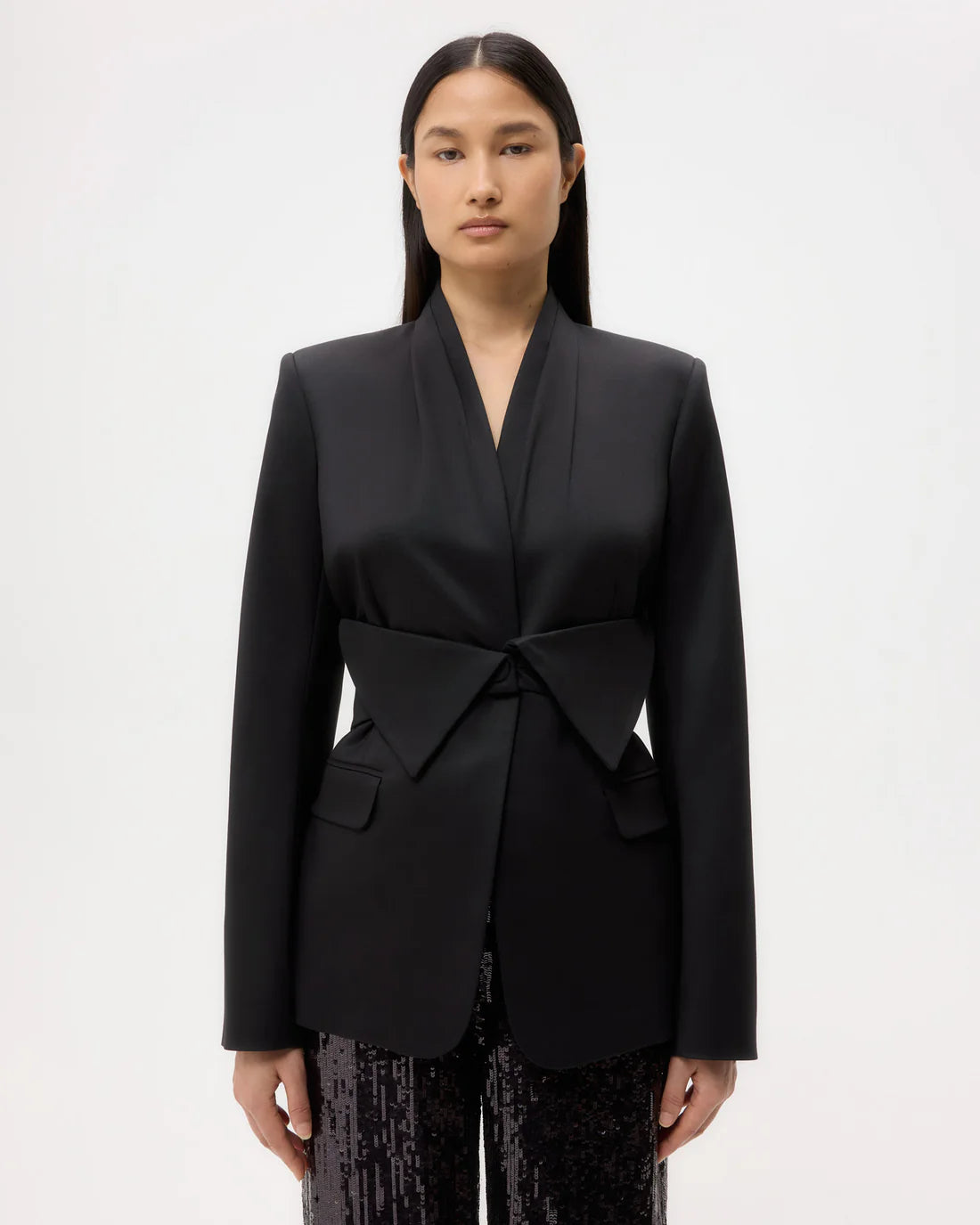 The After Five Blazer combines a sleek, structured silhouette with luxurious comfort. Crafted from extra fine, silk-finish twill in a satiny soft stretch tuxedo suiting, this collarless, single-breasted blazer features molded shoulder pads and covered buttons for a polished look. The belted waist enhances the fitted shape, delivering a refined yet modern style perfect for elegant occasions. Its black hue adds timeless versatility, making it an essential addition to any sophisticated wardrobe.