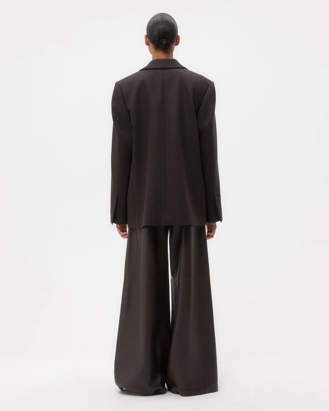 The Jillian Blazer combines timeless sophistication with modern comfort. Crafted from a luxurious cashmere and wool blend with a hint of stretch, it offers a relaxed, oversized fit that moves with you. Designed with molded shoulder pads and notched lapels, this single-breasted blazer features a sleek single-button closure and practical side flap pockets. Its rich chocolate color enhances versatility, making it an elegant choice for both professional and casual looks.