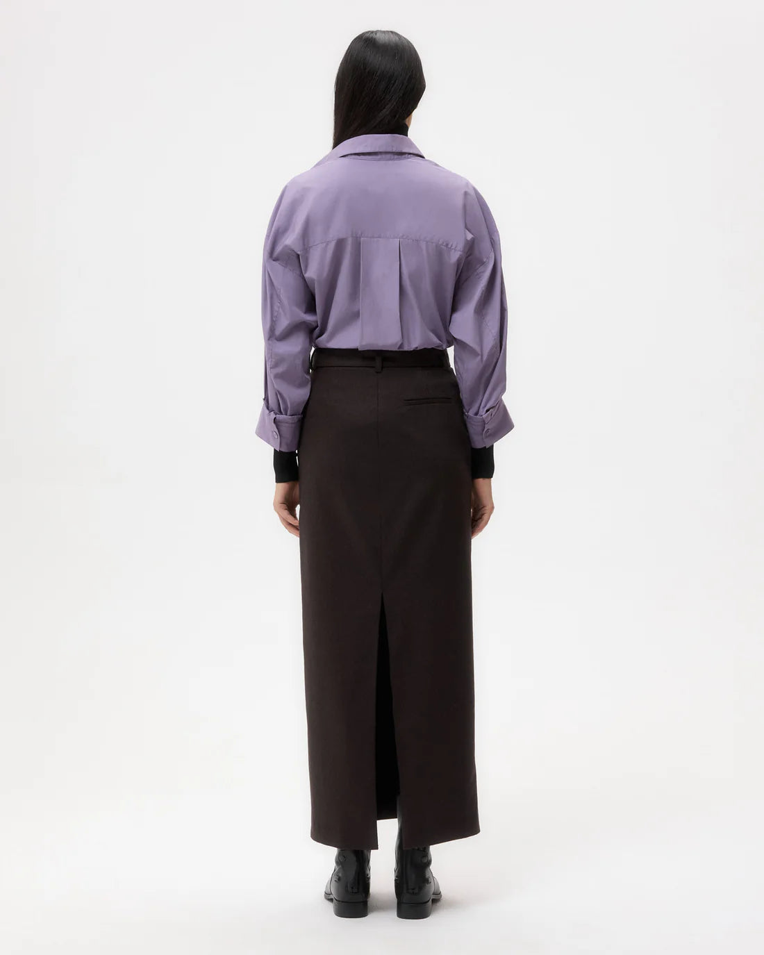 The New Earl Shirt showcases an oversized silhouette crafted from smooth, structured cotton poplin. Its asymmetric button front and spread collar offer a refined yet contemporary edge, while the chest patch pocket adds subtle utility. Features like the back box pleat and single roll button cuffs enhance comfort and tailored movement. Finished in a striking purple hue, this shirt balances classic elements with modern design for a versatile wardrobe staple.