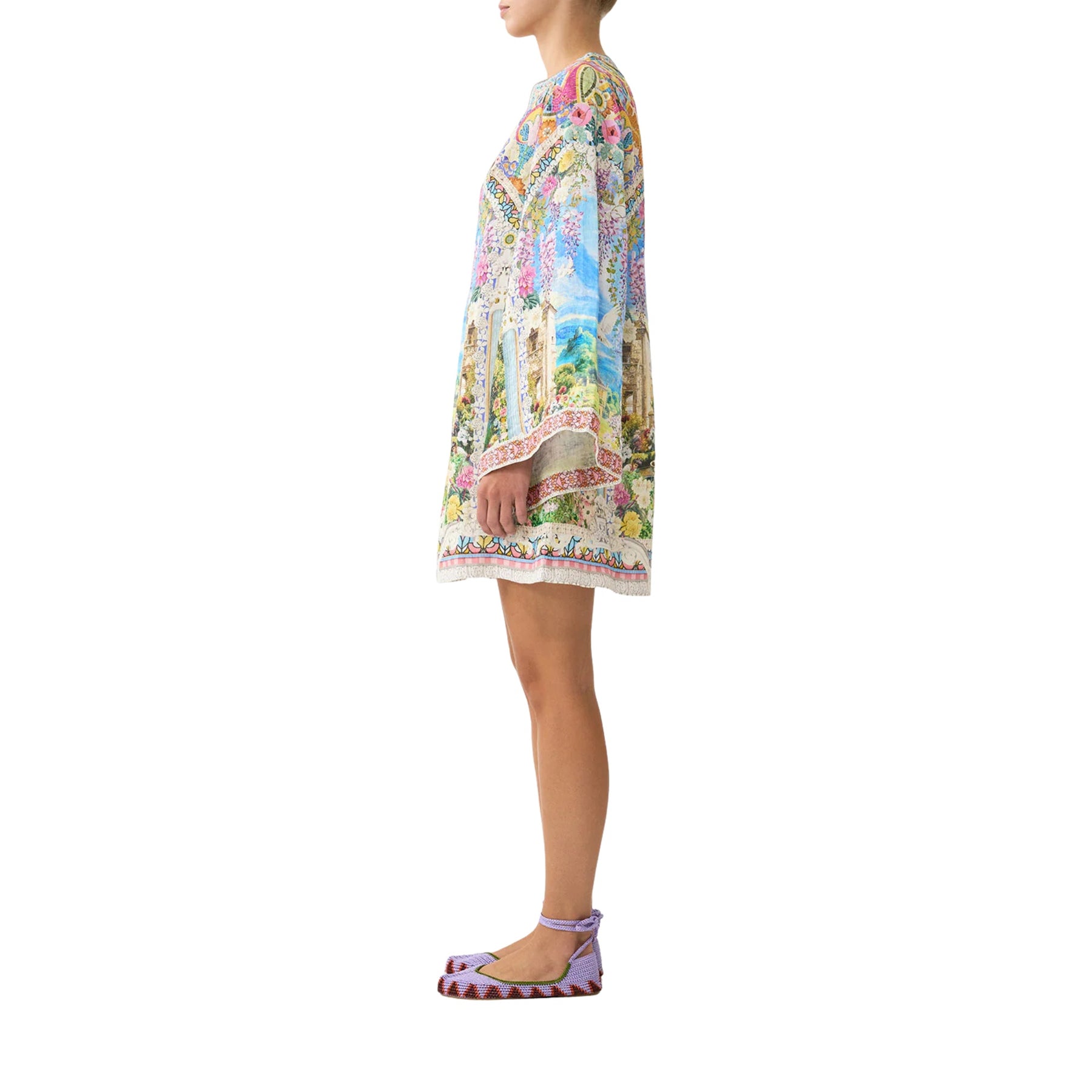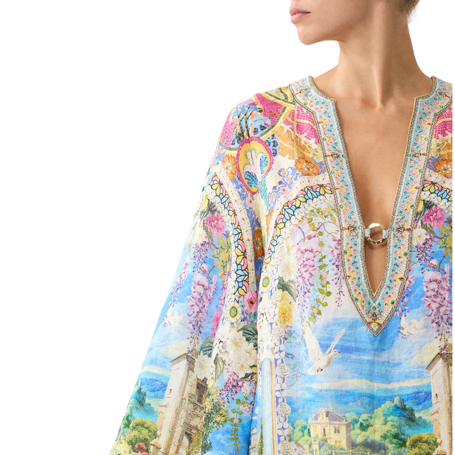 Striking yet effortless, the Deep V Neck Hardware Short Kaftan in Navas Nouveau is crafted in airy linen with an exclusive artisan print and sculptural hardware detail. The relaxed short silhouette and dramatic flared sleeves create fluid movement, making this statement piece an elevated essential for resort and warm-weather dressing.