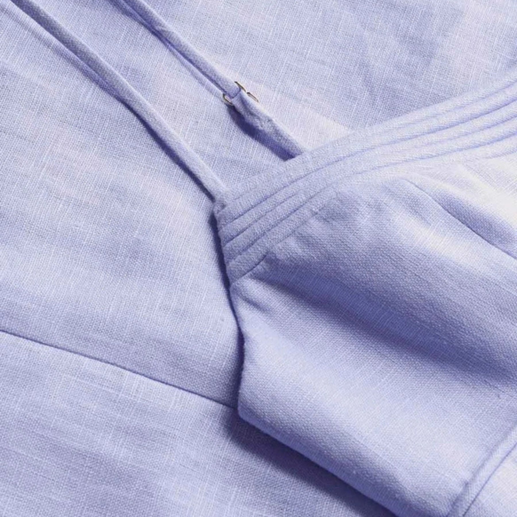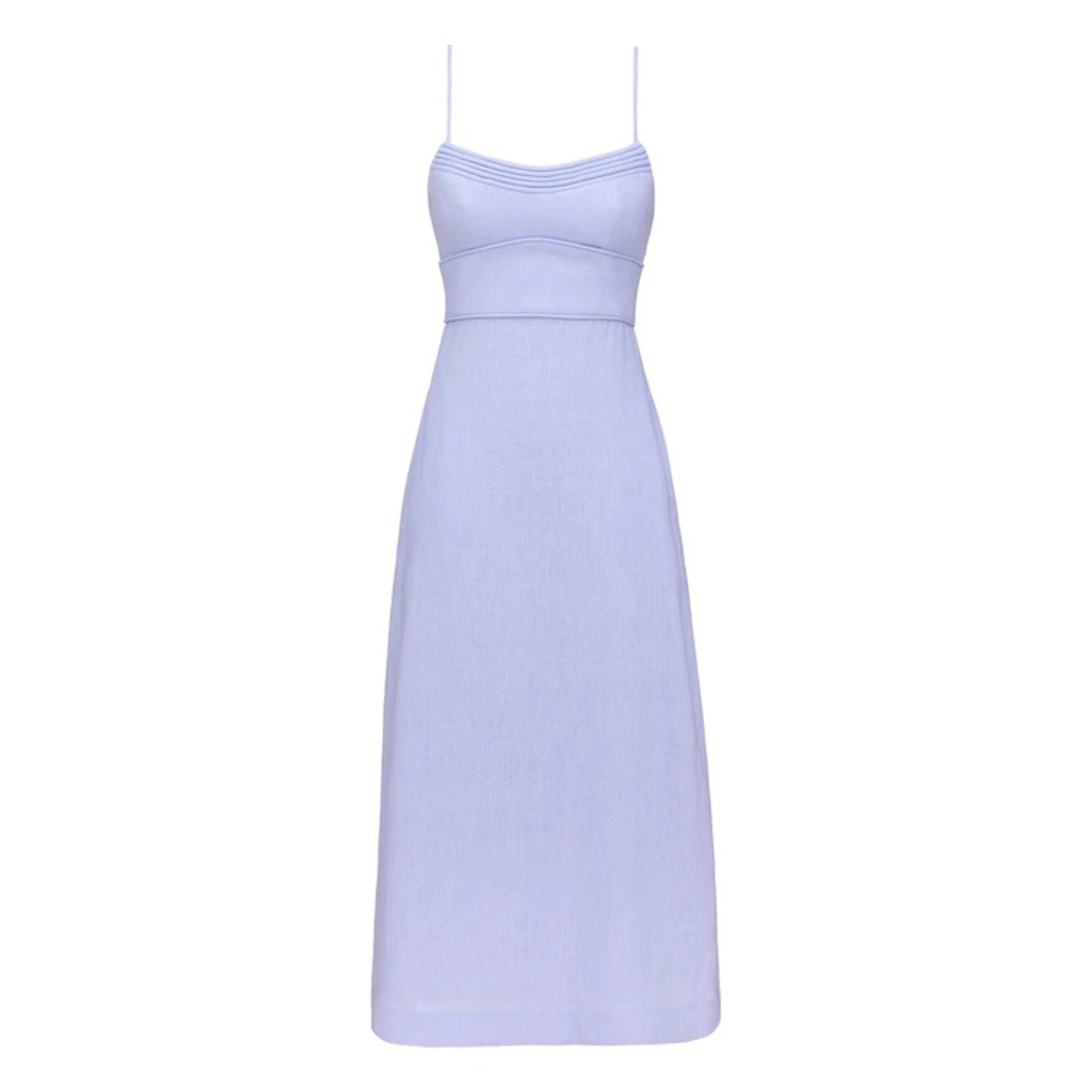 Fresh and quietly sophisticated, the Luna Midi Dress in Sky is tailored in breathable linen with a softly structured bodice and fluid A-line skirt. The delicate straps and clean waist seam create an effortlessly feminine silhouette, making it a timeless warm-weather staple for polished daytime dressing.