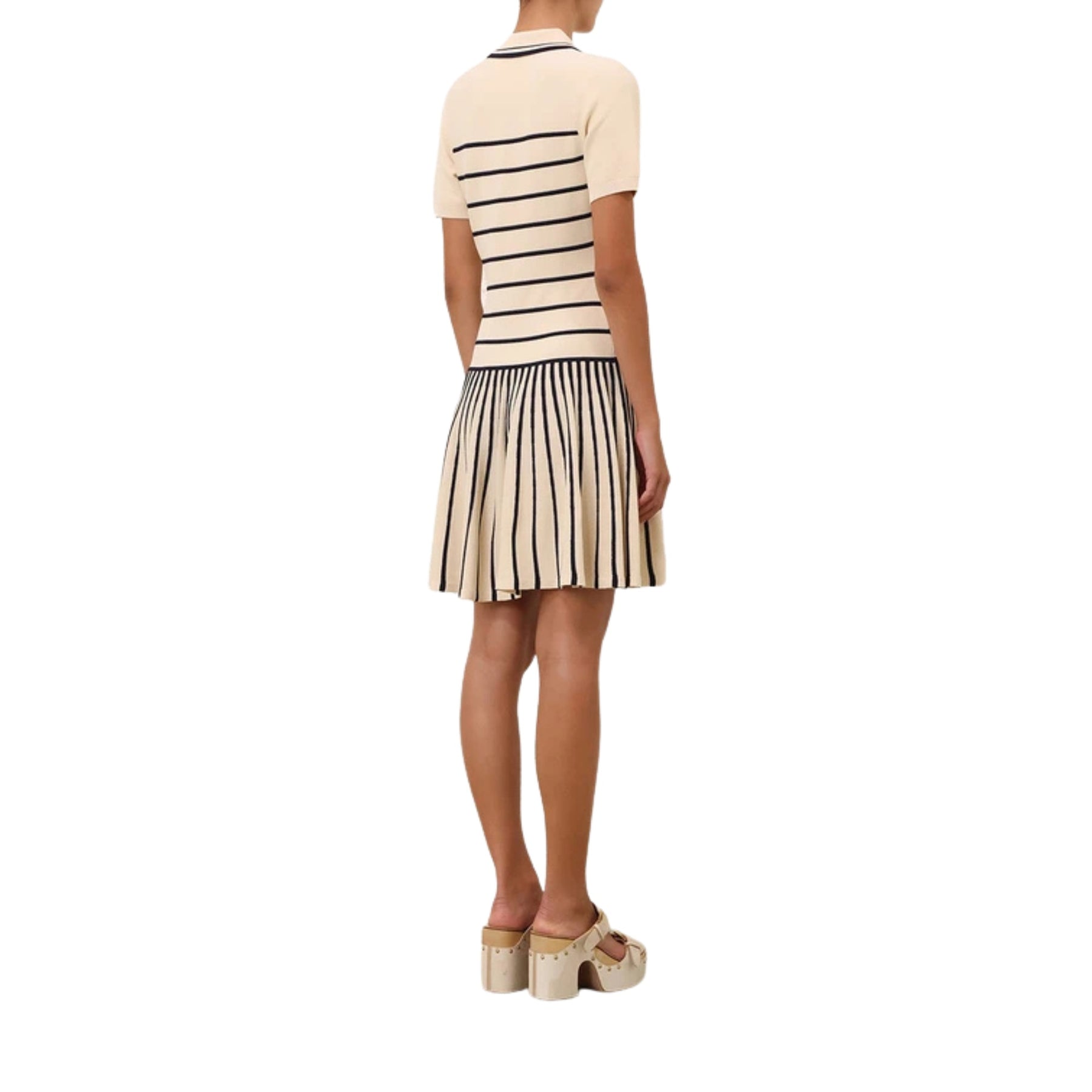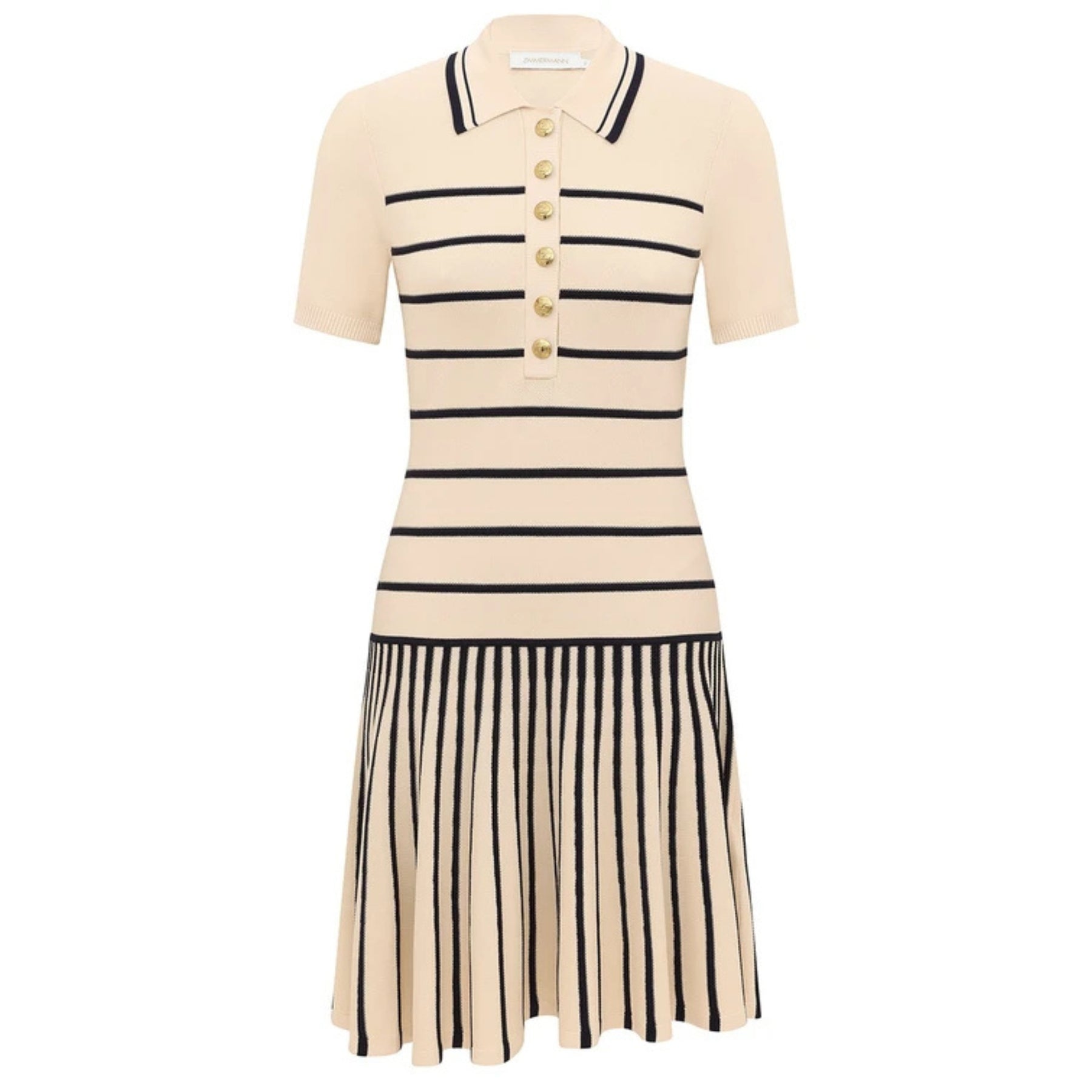 Sport-inflected polish meets feminine ease in the Luna Striped Polo Mini Dress in Cream Navy, crafted in a sculpting ribbed knit with heritage stripe placement and gold-button accents. The fitted polo bodice flows into a softly pleated mini skirt, creating a flattering silhouette that balances structure and movement for elevated everyday wear.