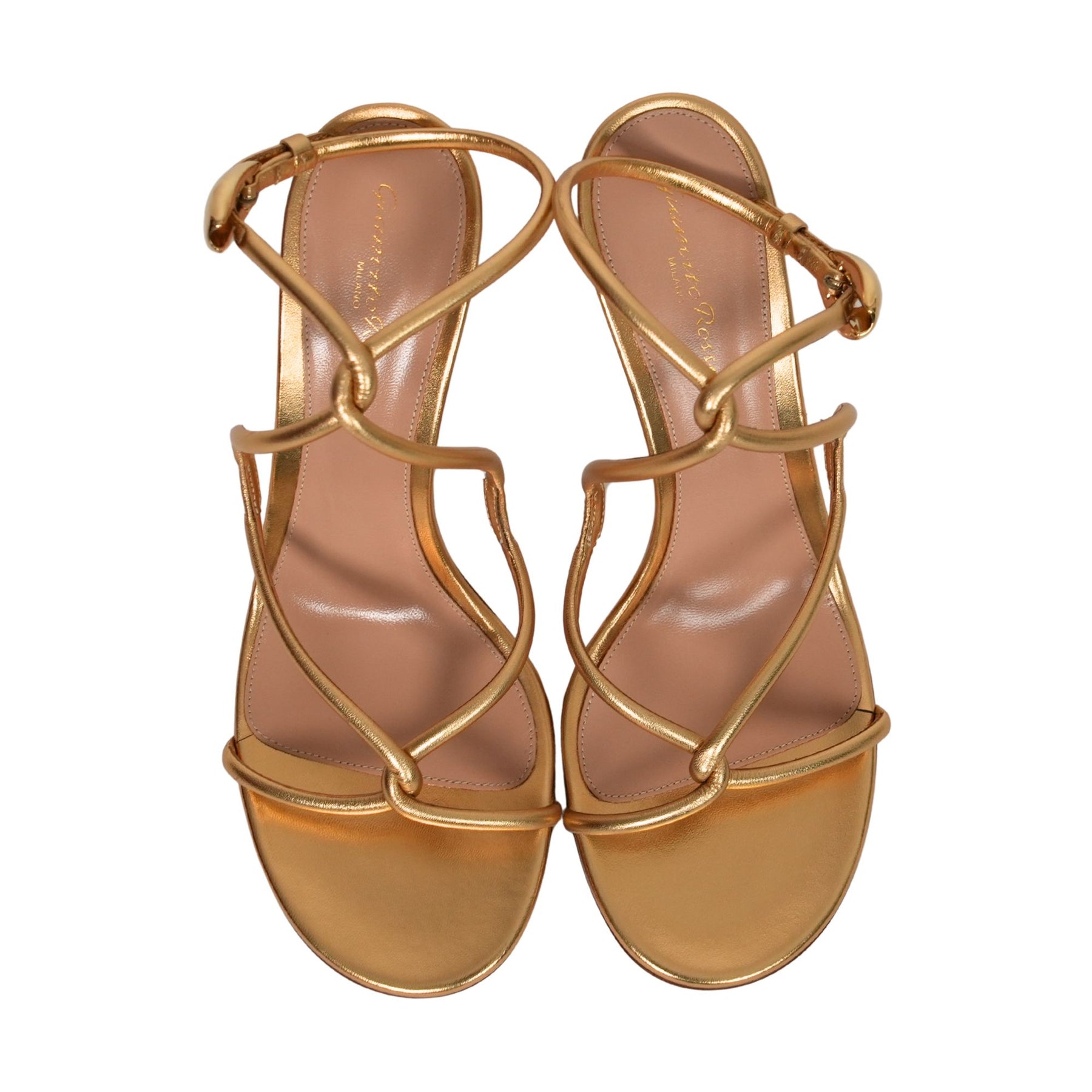 Crafted in Italy from metallic-effect leather, the Jungle Mamba 85 sandal in gold features a sleek round toe and a sculptural 85mm stiletto heel. The standout upper is inspired by the sinuous coil of a snake, echoed in the custom metallic buckle shaped after a snake’s head. A striking design that balances elegance with bold detail.