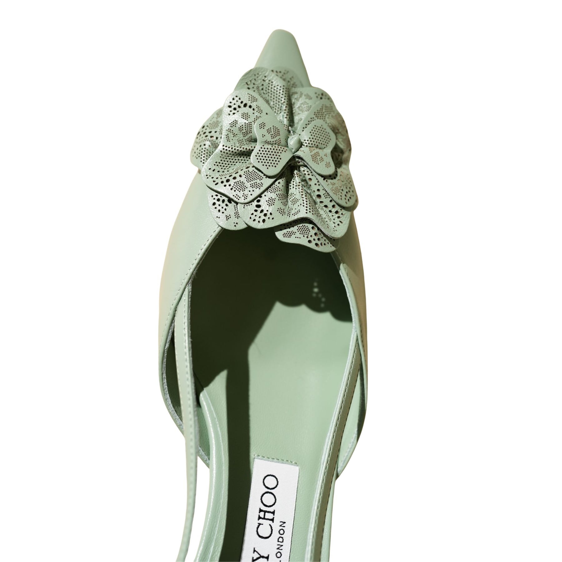 Turn heads with this stunning Jimmy Choo slingback pump, crafted in soft mint-green leather for a fresh, sophisticated look. The pointed toe is beautifully accented with a delicate floral appliqué, showcasing intricate perforated detailing that adds dimension and elegance. Designed with a slim adjustable slingback strap and a low sculpted heel, this style offers both comfort and refinement—perfect for weddings, garden parties, or polished everyday wear. A standout piece that effortlessly elevates any outfit.