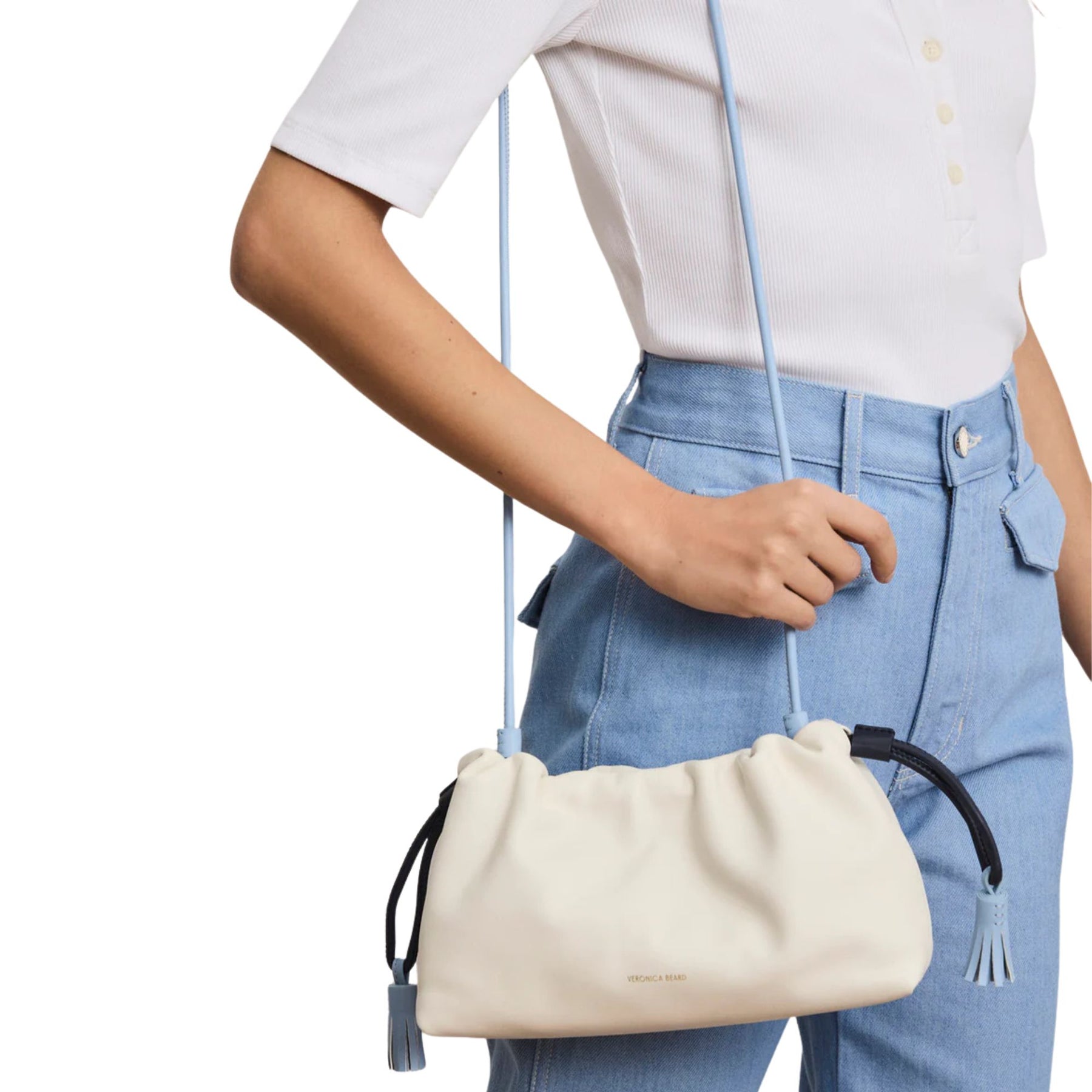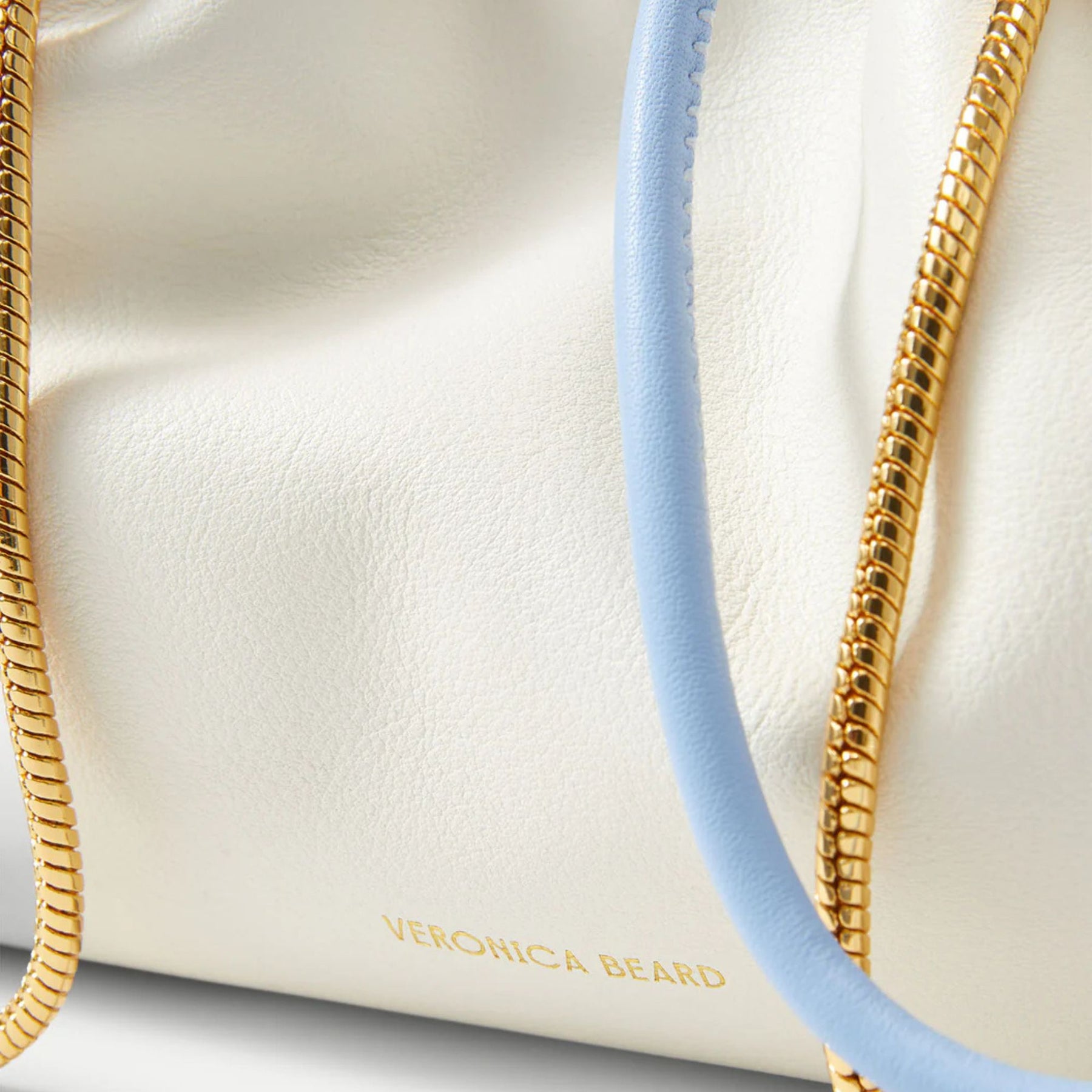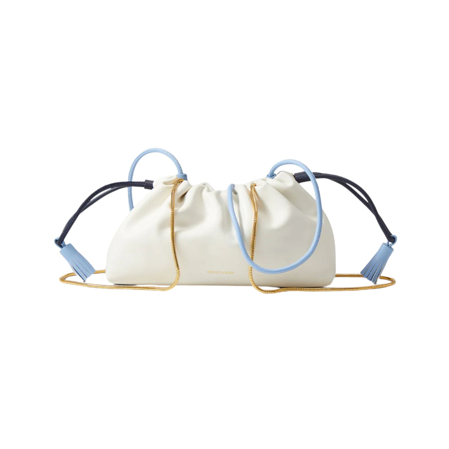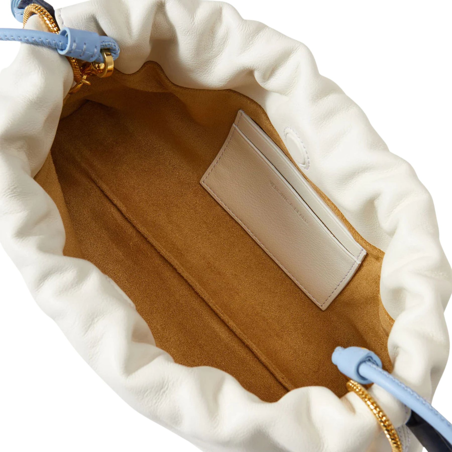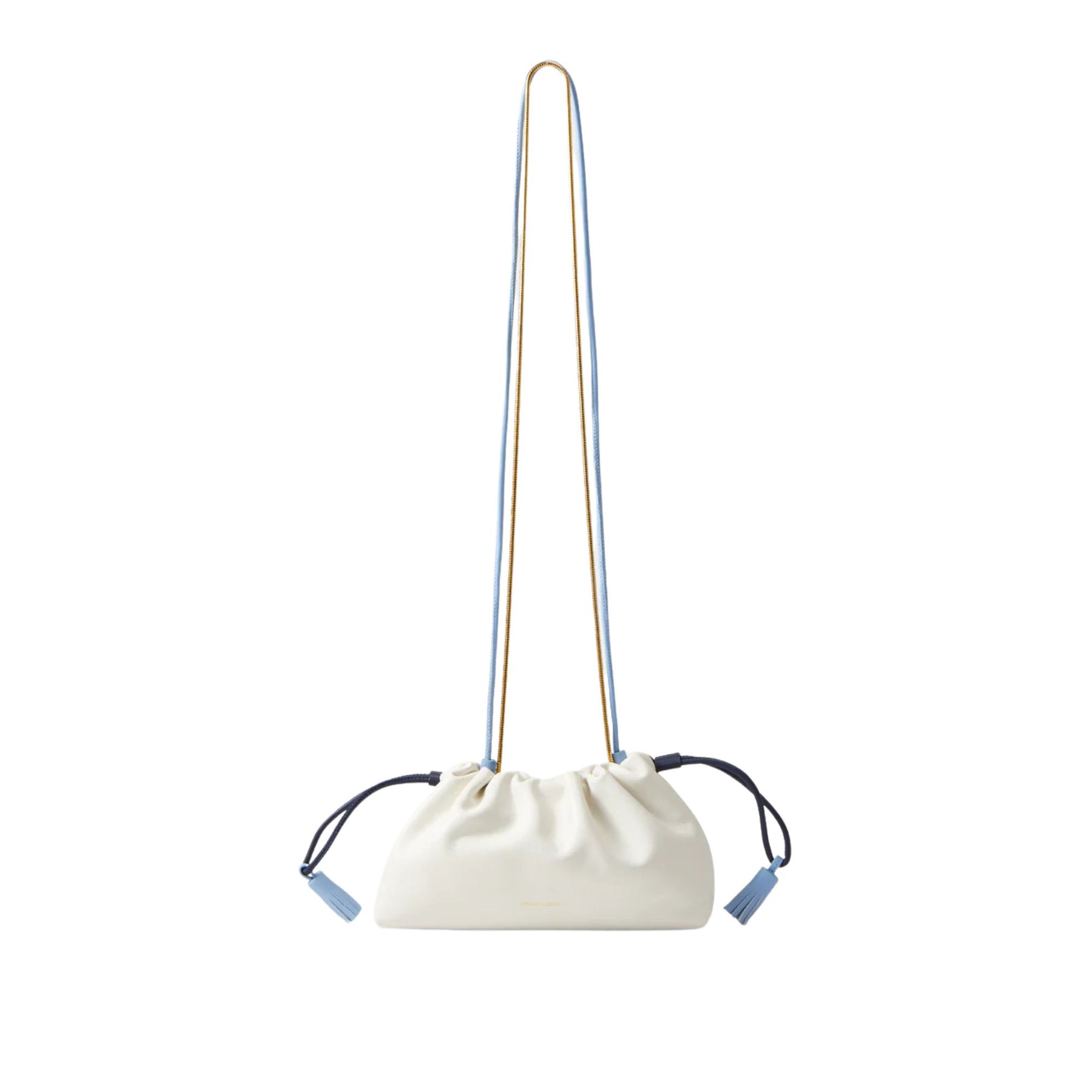 A petite take on our original Stash bag—that's still roomy enough to fit the largest iPhone. Crafted from smooth, supple off-white leather, this pouch bag features a softly structured silhouette with a gathered, cinchable top, finished with contrast navy and sky blue tasseled drawstrings. Two straps—one in leather, the other a gold snake chain—offer maximum versatility. Inside, a zip pocket and magnetic tab closure keep your essentials secure.