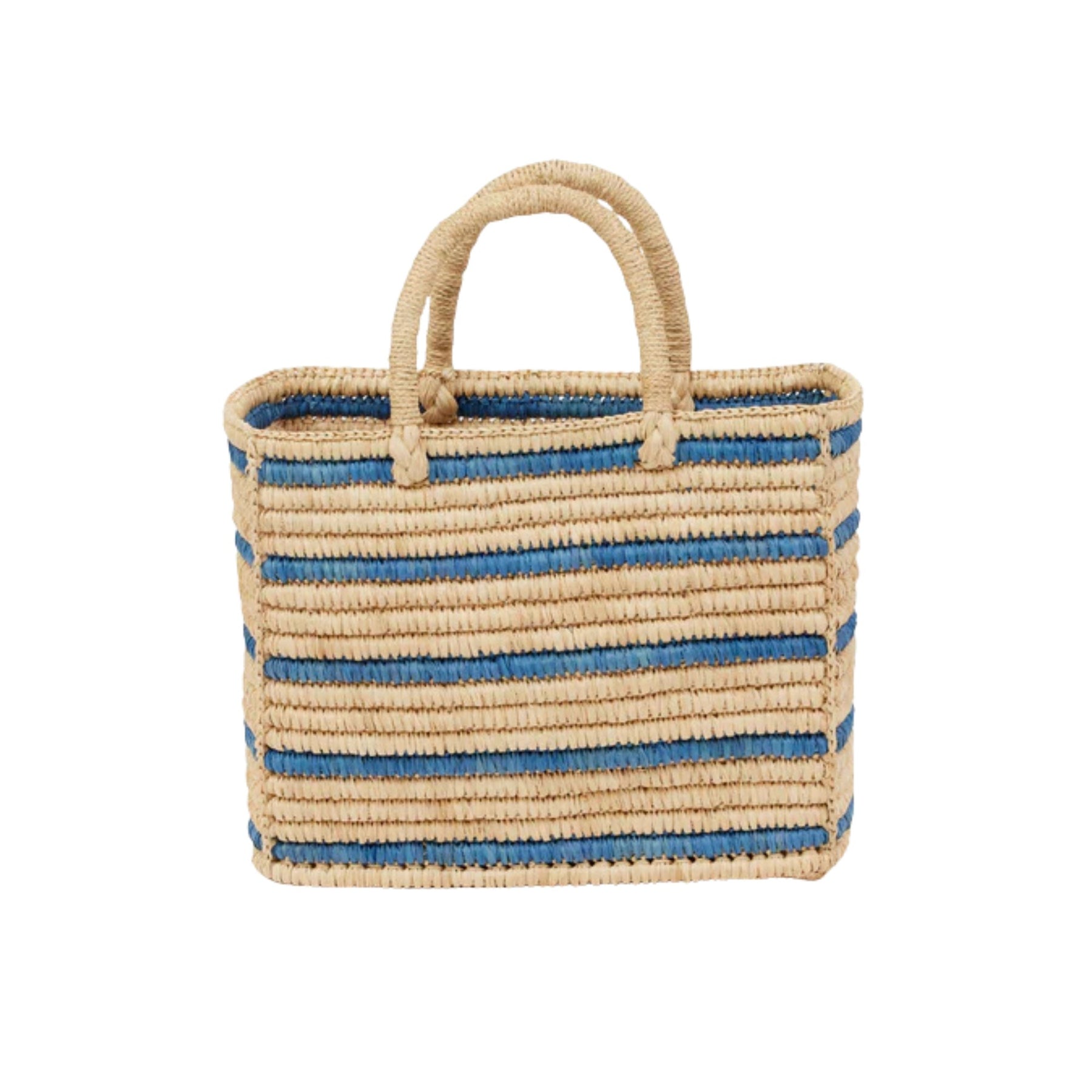 Minimal yet refined, this Juli Bag elevates an everyday essential with effortless, warm-weather appeal. Handwoven from natural raffia with denim-blue striping, it features a structured rectangular silhouette and sturdy top handles for a clean, classic carry. Perfect for farmers markets, casual outings, or everyday use.