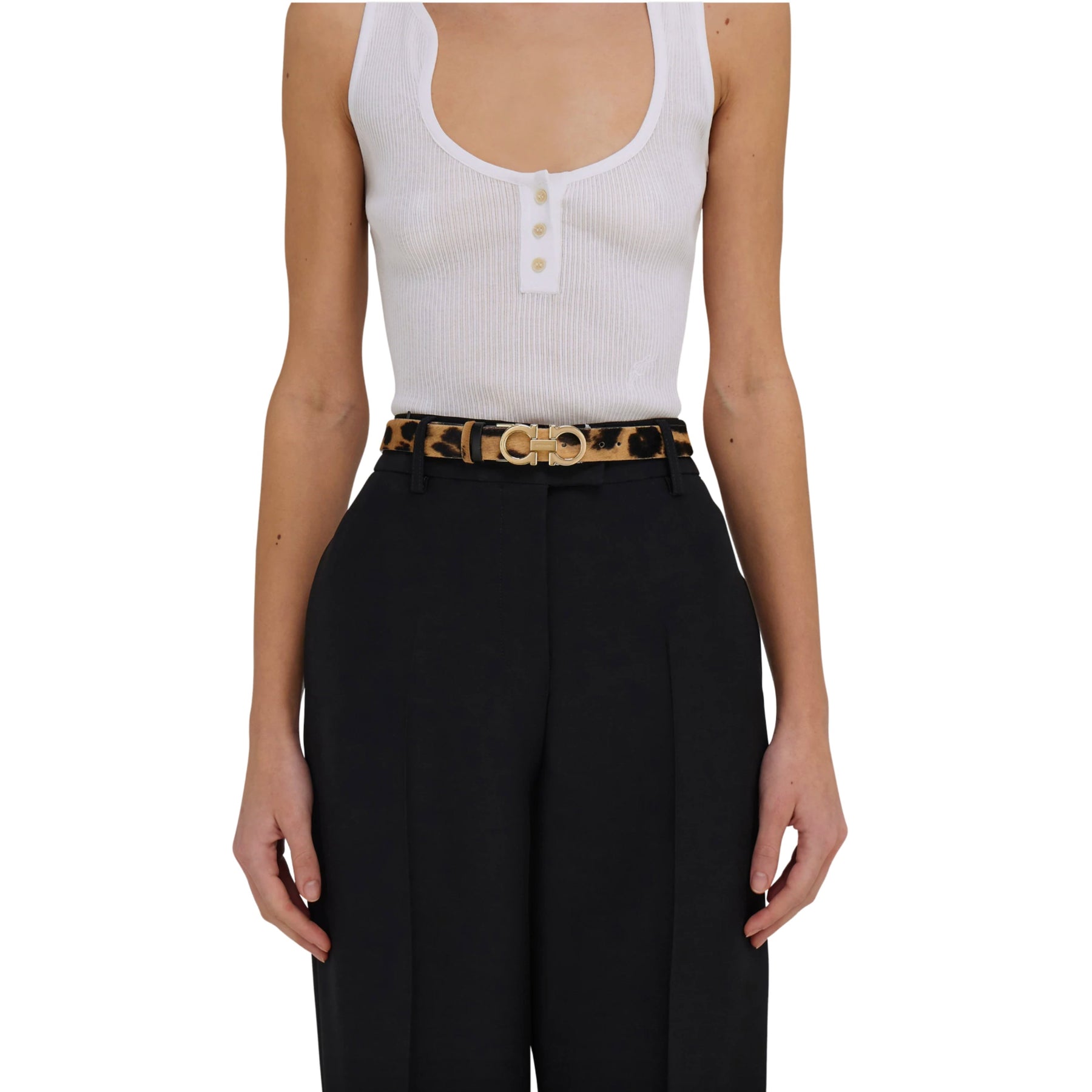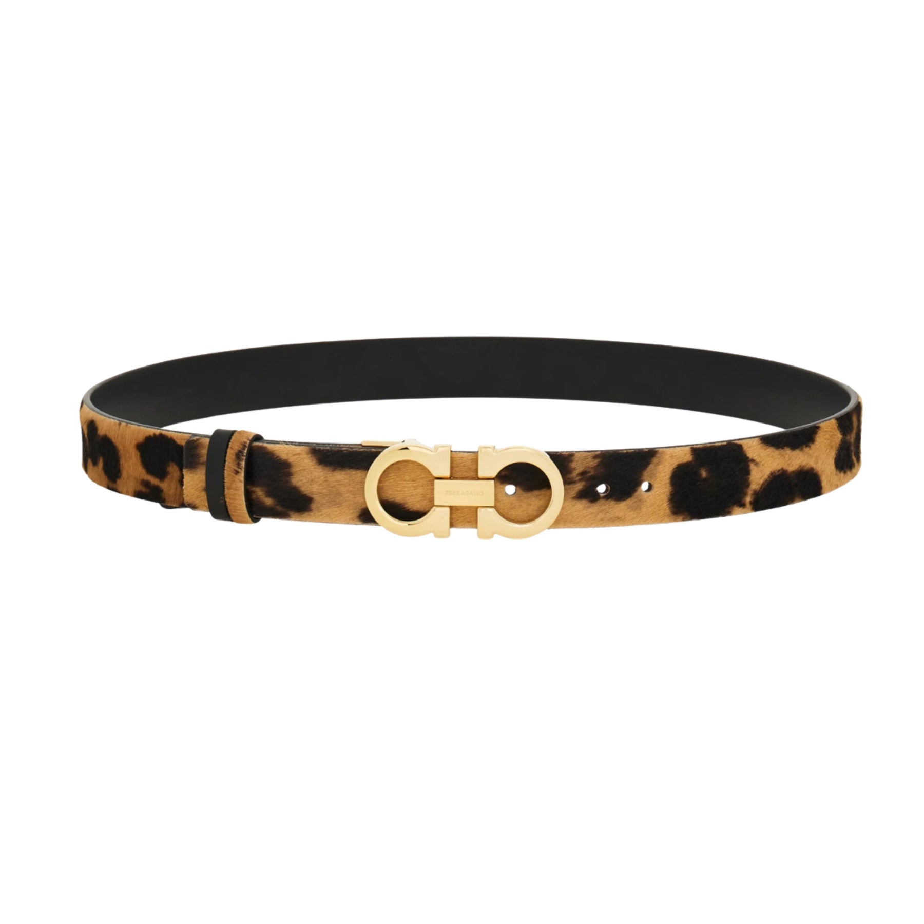 A glam-chic update to the brand’s most iconic belt. Designed in bold animal-print pony hair, this statement style is finished with a gold-tone Gancini buckle for instant polish. The adjustable length allows for a customized fit, making it as versatile as it is eye-catching.
