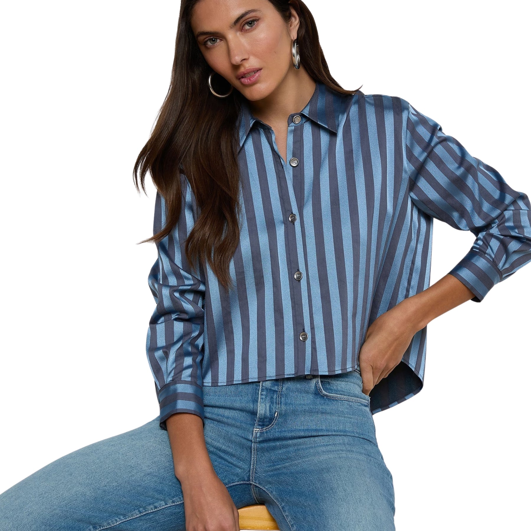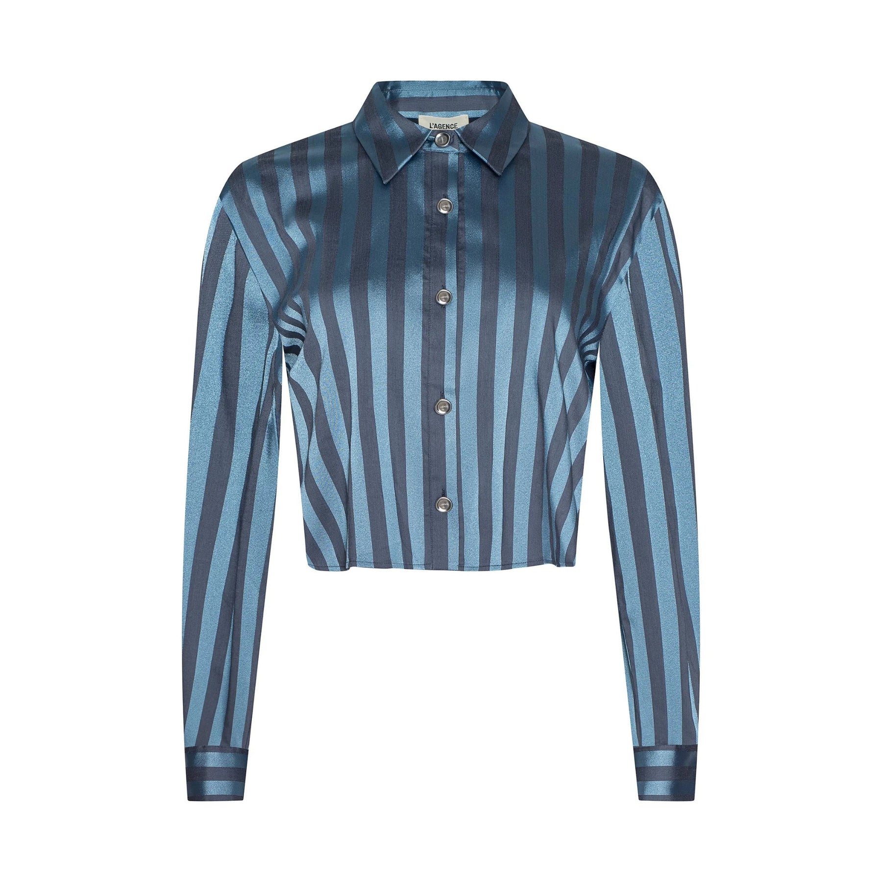 Effortlessly tailored with a modern twist, the Cosette shirt reworks a classic silhouette through a cropped, high-low hem and a cool, borrowed-from-the-boys feel. Rendered in blue striped satin, it balances structure with subtle shine for a polished yet relaxed look.