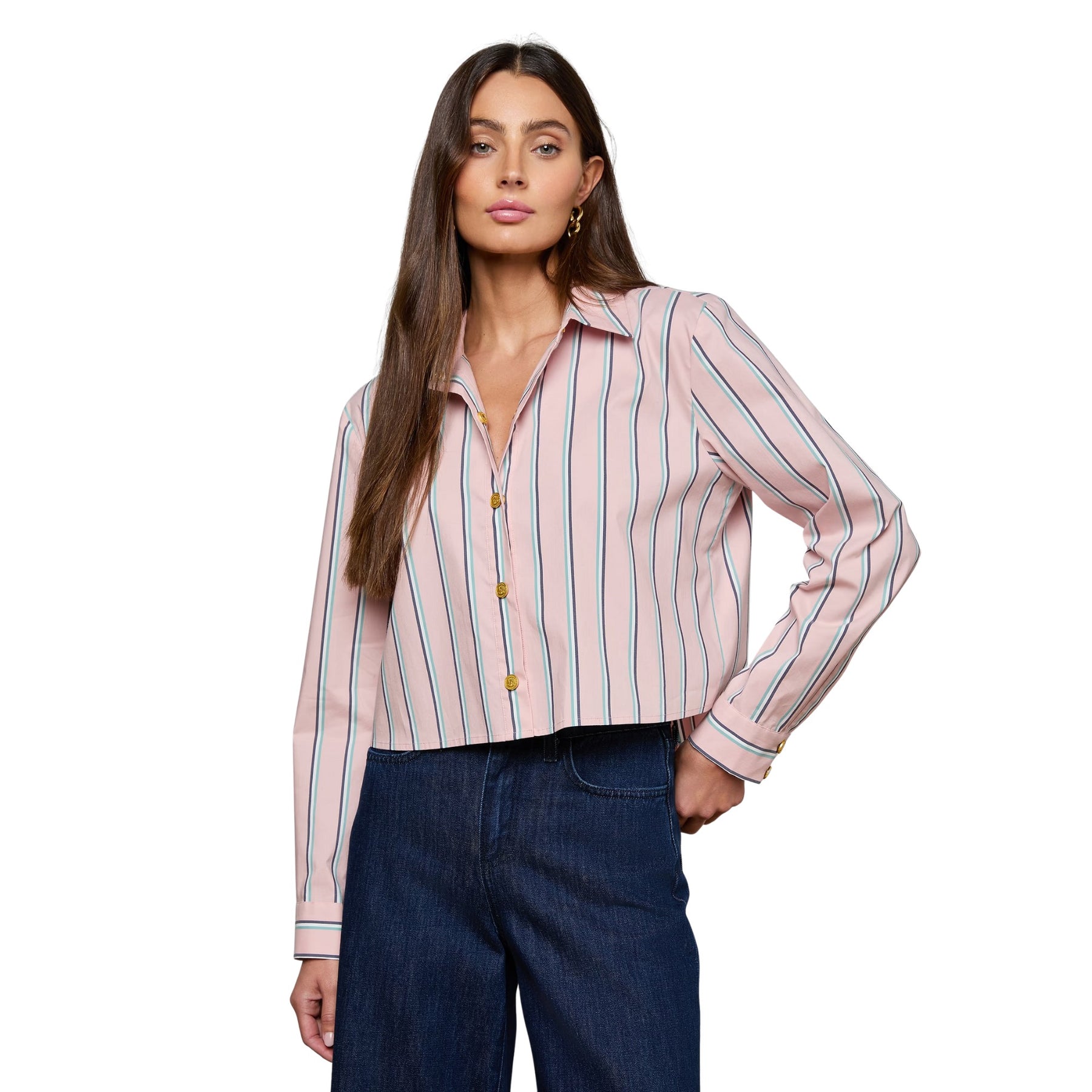 Classic tailoring meets modern proportion in this L’AGENCE Cosette shirt. Designed with a relaxed, menswear-inspired silhouette, it features a cropped length balanced by a high-low hem for effortless styling. Crafted from crisp organic cotton-blend poplin and finished in a soft pale rose stripe, it’s a fresh update to an everyday essential.