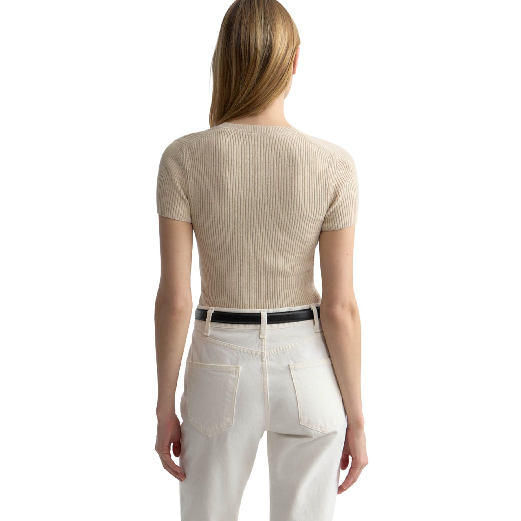 This short-sleeve V-neck sweater is crafted from a lightweight cotton-silk blend in a refined rib stitch for a soft, breathable feel. Designed in a slim fit with a classic body length, it features contrast tipping at the neckline and subtle fashioning at the shoulders and sleeves for a polished finish. An effortless essential with elevated detail.