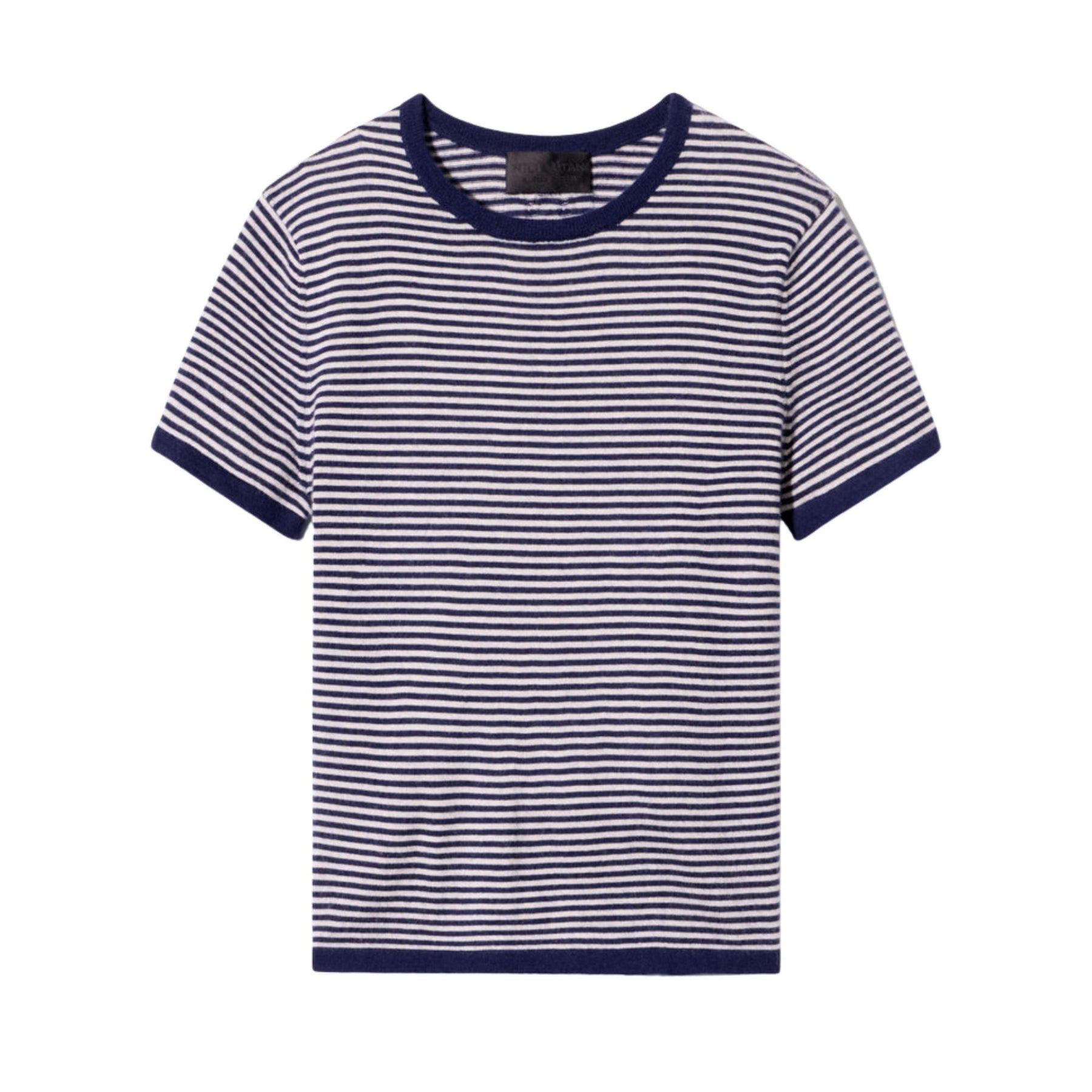 This short-sleeve crewneck sweater is crafted from fine-gauge cashmere in a classic striped jersey stitch. Designed in a slim fit with a slightly shorter body length, it offers a soft, lightweight feel with a refined silhouette, an elevated take on the everyday tee.