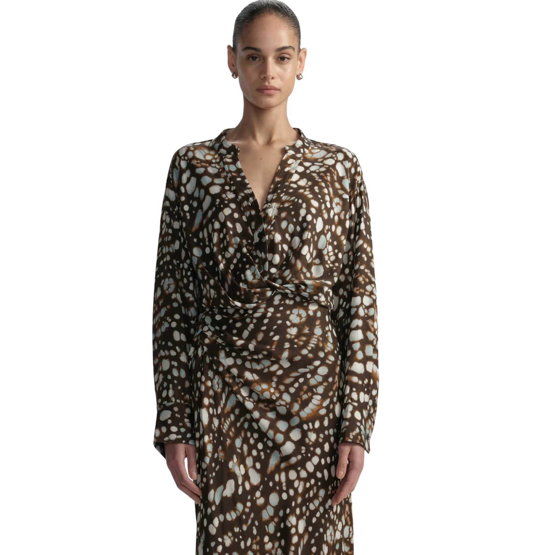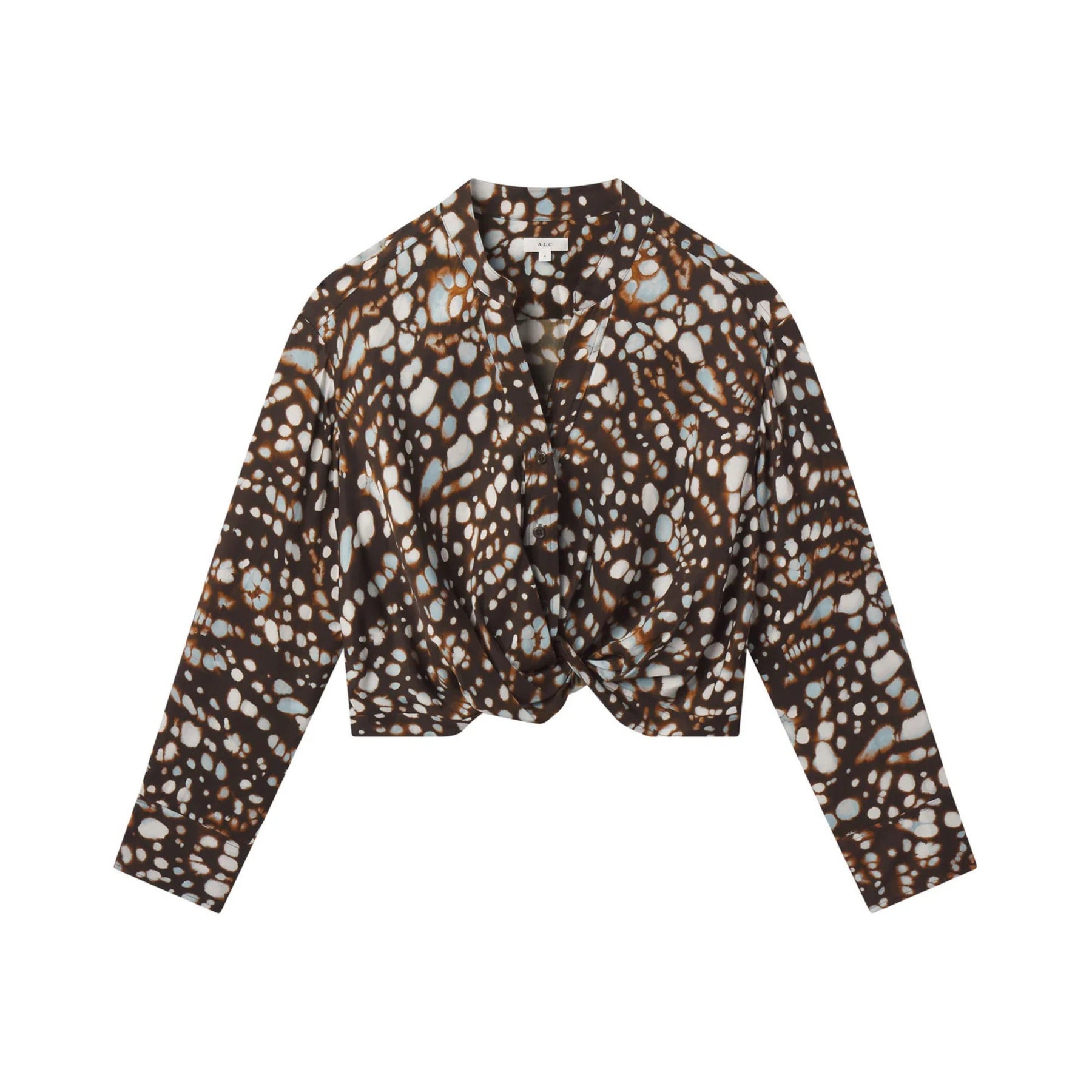 This beautifully tailored top brings effortless polish to your wardrobe with a chic, modern silhouette and eye-catching print. Cut from viscose twill shirting in A.L.C.’s signature Aria print, the Luca Top features a button-front design and a subtle twisted front detail that creates a soft drape for a flattering, relaxed fit. The versatile colorway and refined construction make it perfect for pairing with tailored pants, skirts, or denim for elevated everyday style or dressed-up occasions. The piece strikes a balance between tailored structure and easy movement, making it a standout addition to any seasonal lineup.