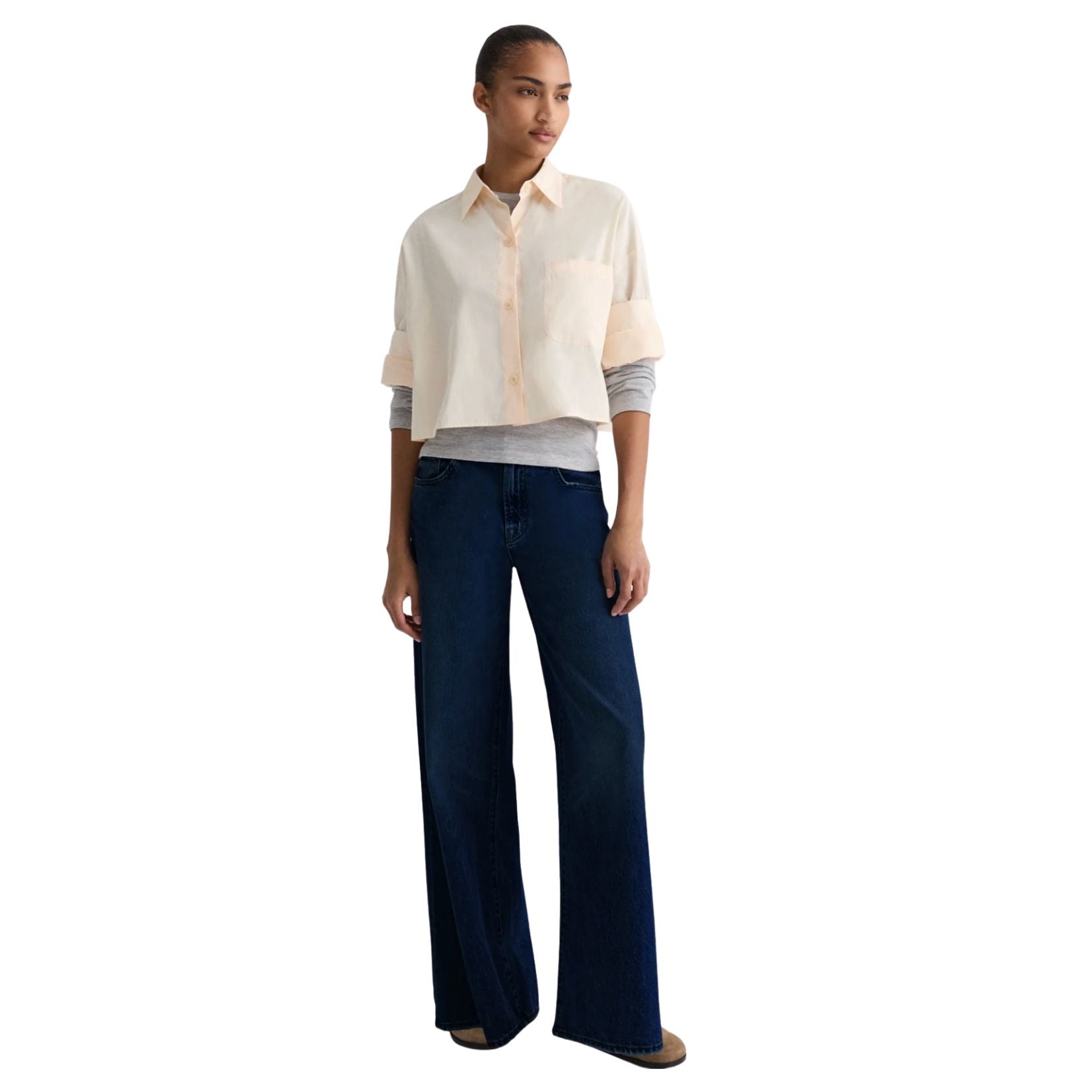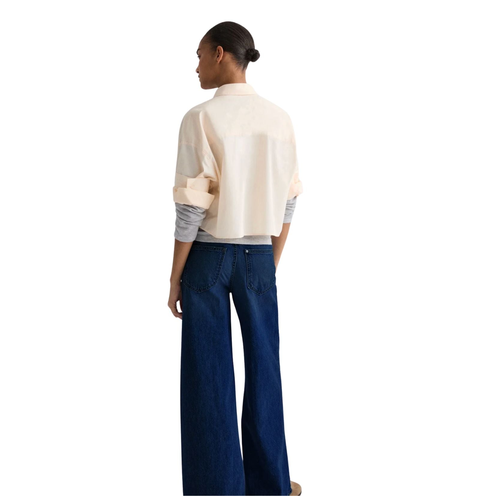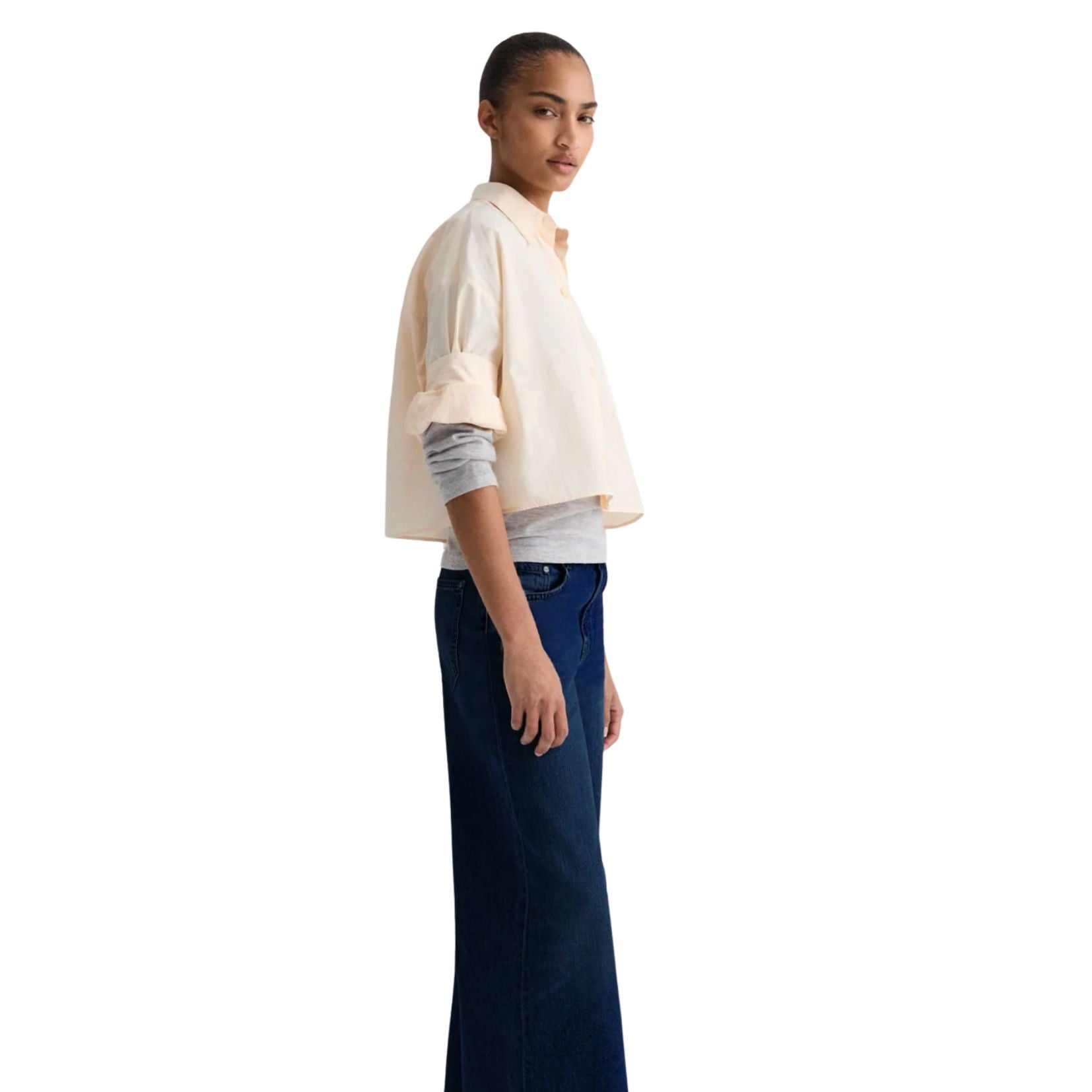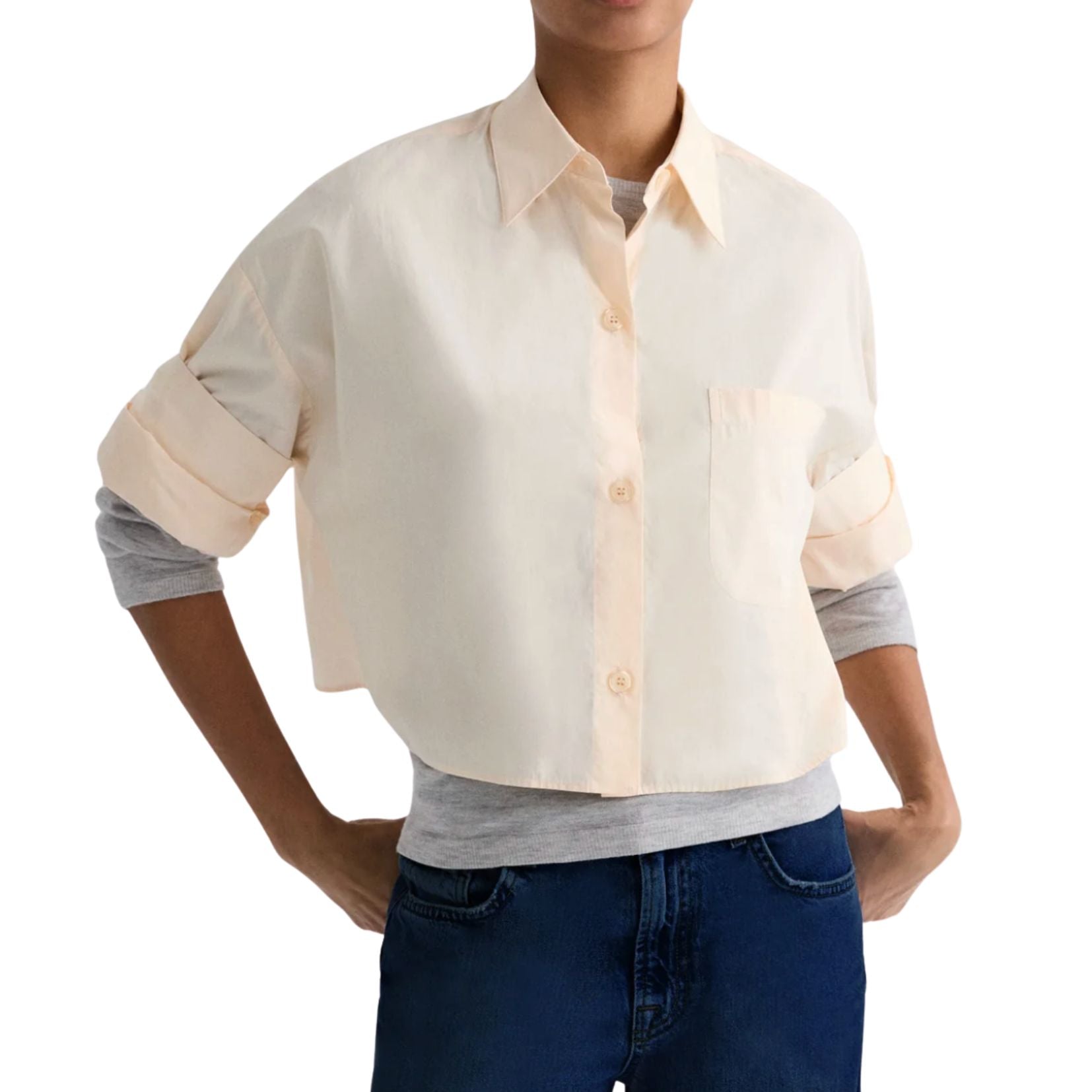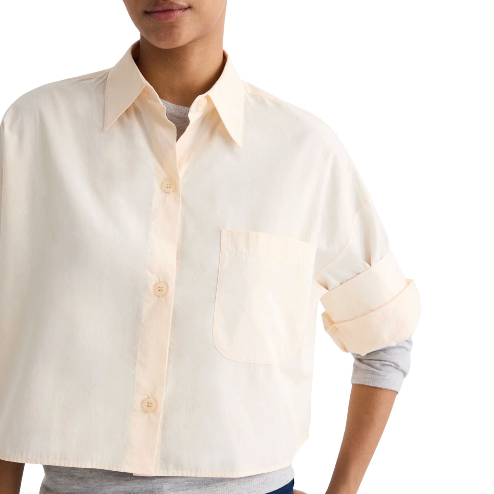 TWP’s signature Next Ex Shirt is a refined short-sleeve button-down crafted from superfine Italian cotton shirting for an ultra-smooth, lightweight feel. Designed in a cropped, boxy silhouette, it features a spread collar, chest patch pocket, classic button-up placket, and the brand’s signature double-roll button cuffs. The soft Crème de Pêche hue adds an understated elegance, making it an effortless staple that feels both polished and relaxed.