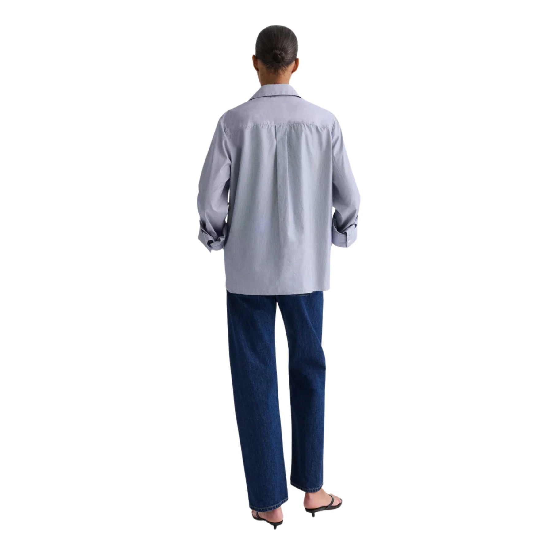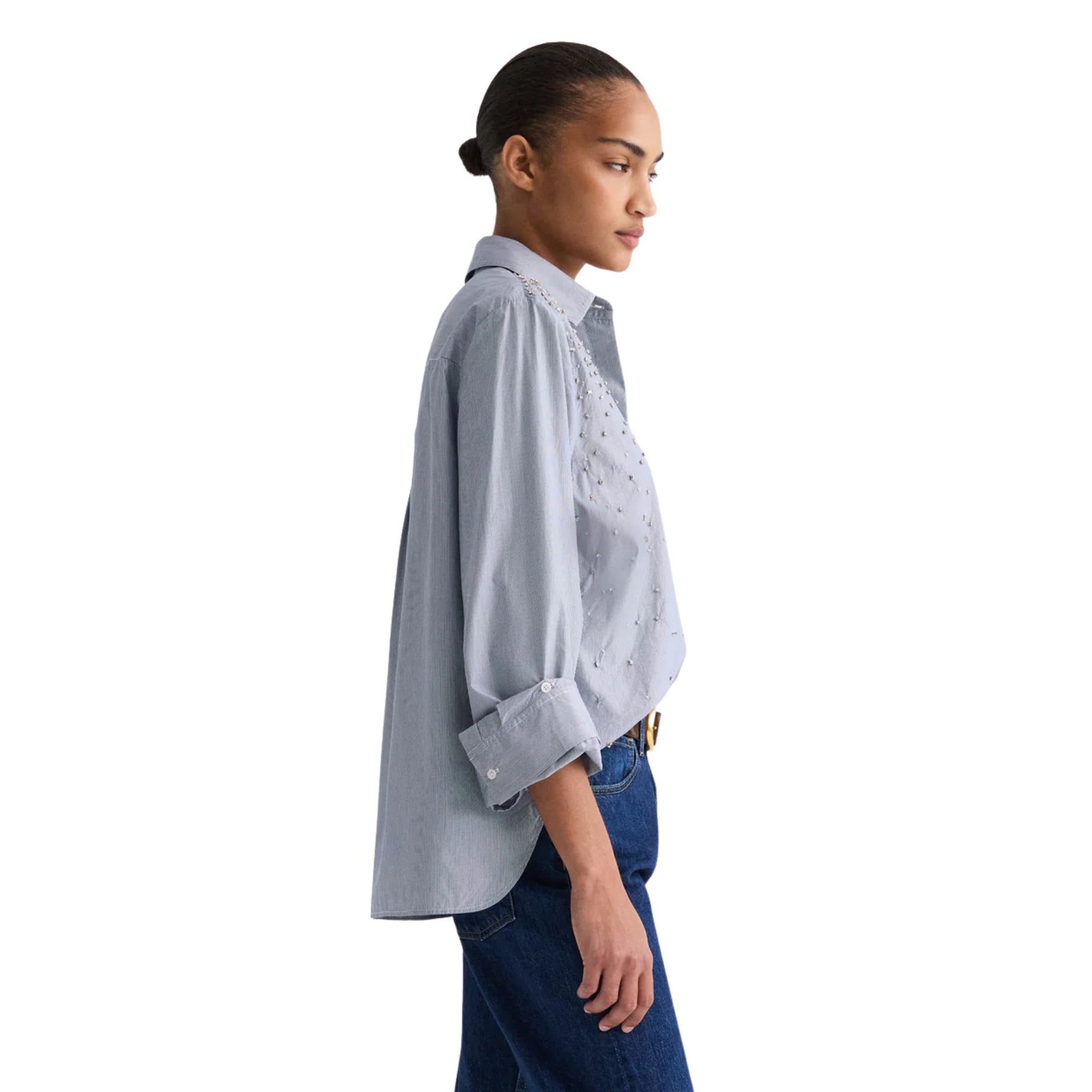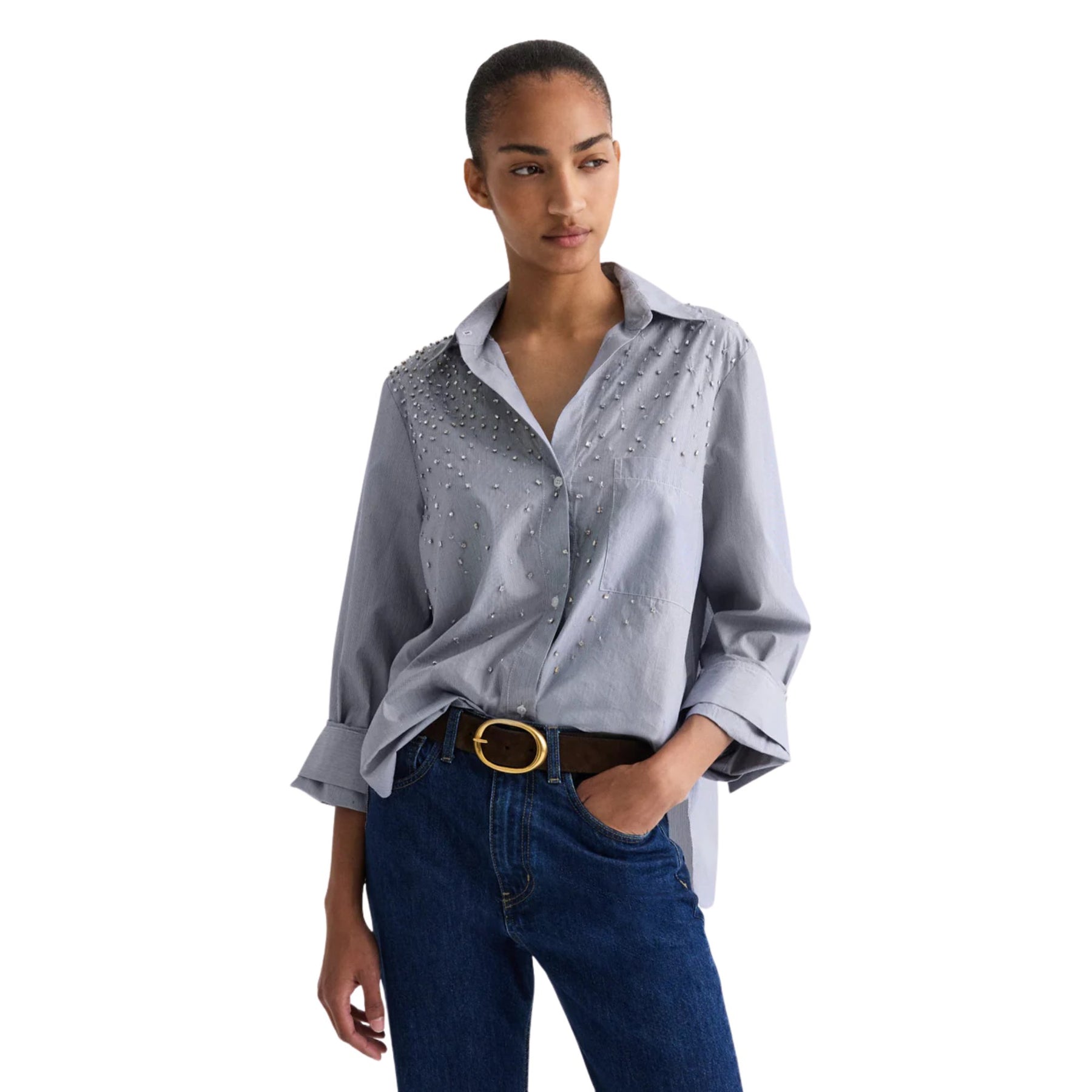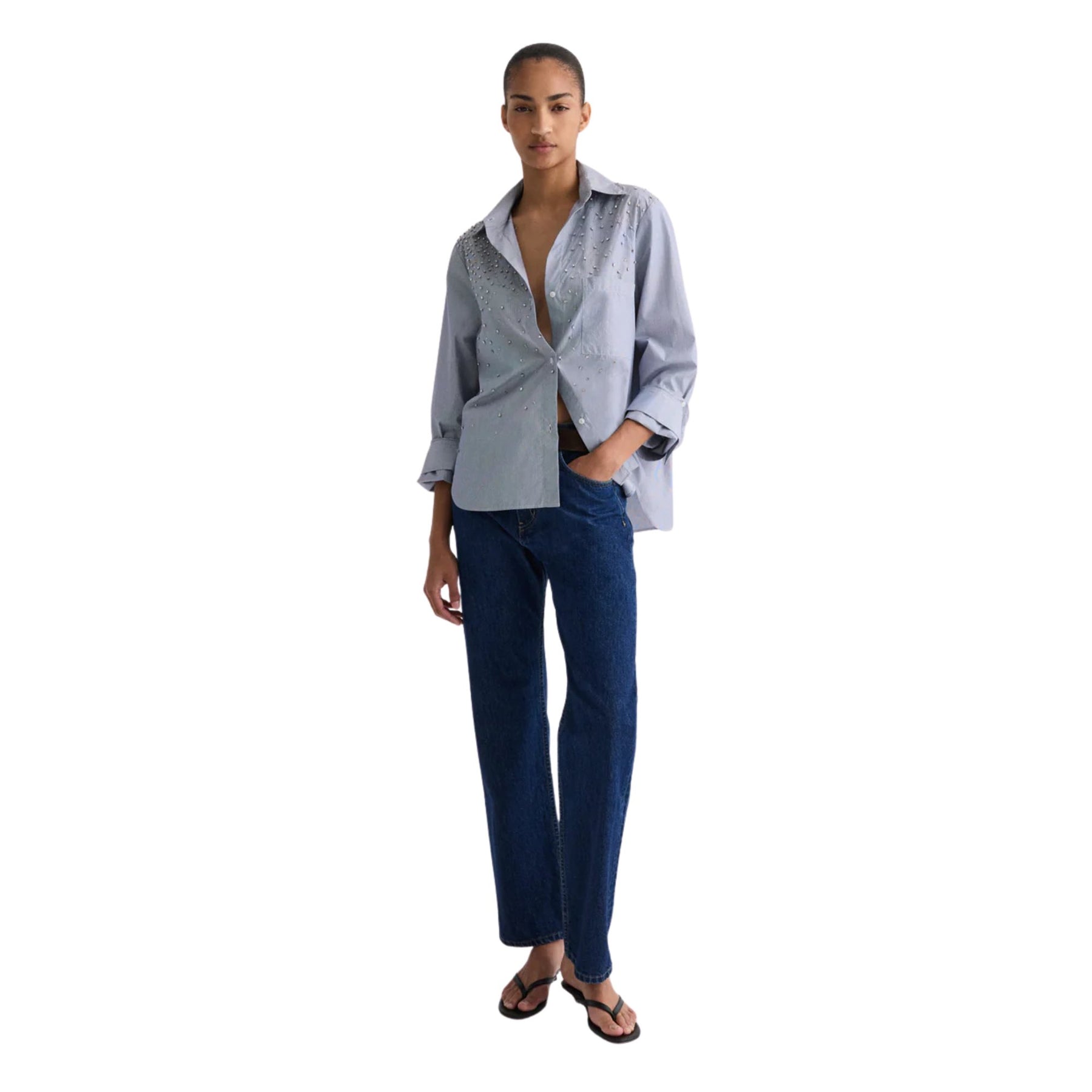 An elevated take on the classic button-down, the Next Morning shirt is crafted from ultra-fine Italian striped cotton shirting and embellished with delicate crystals for a subtle touch of shine. Designed with an oversized, relaxed silhouette, it features a center box pleat at the back for ease of movement. Timeless details include an exposed button-up placket, chest patch pocket, spread collar, and single roll button cuffs, making it a versatile piece for both casual and polished styling.