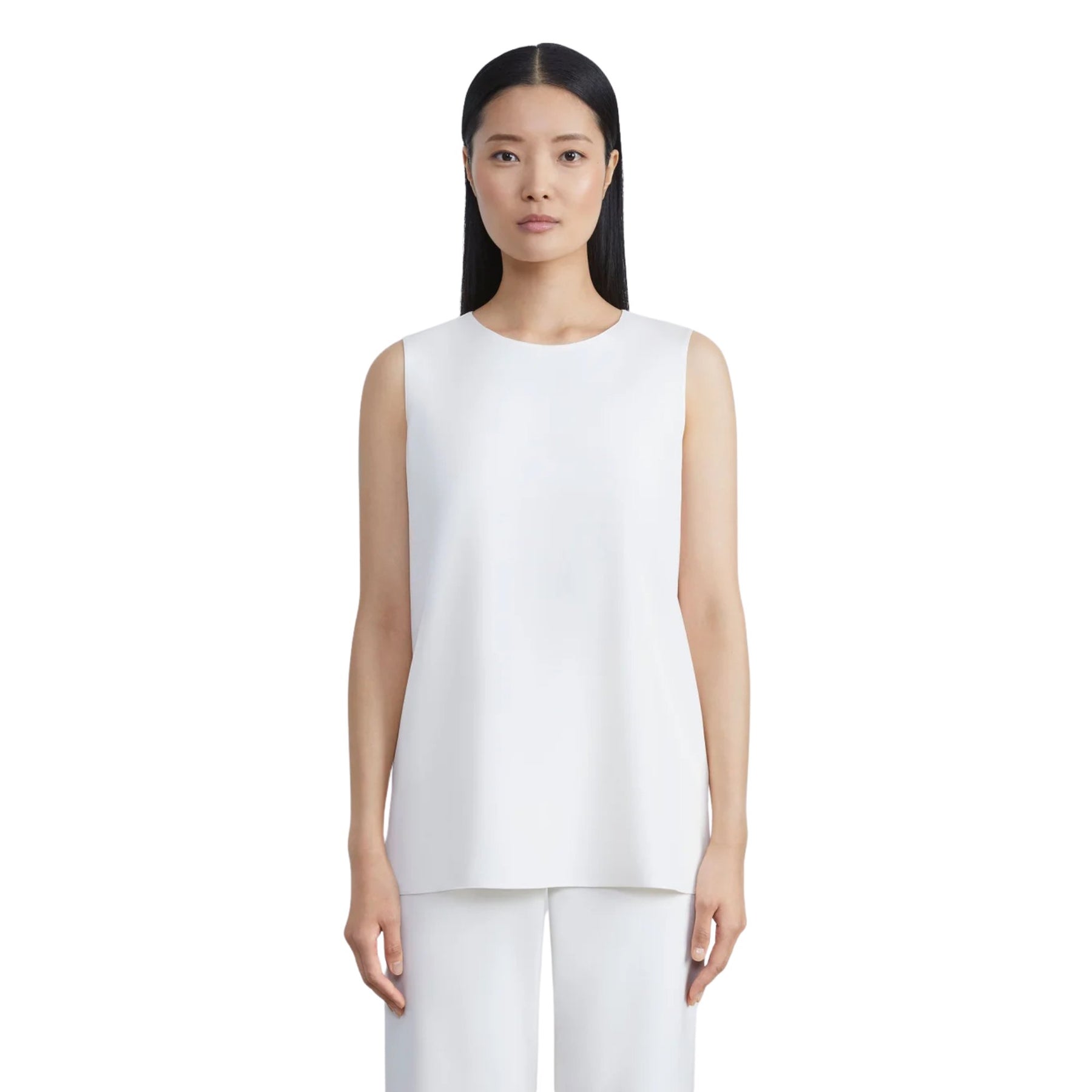 The Sleeveless Adela Blouse is a refined essential with an airy, effortless feel. Crafted from richly textured silk crepe de chine, this sleeveless style drapes softly in a straight silhouette designed for seamless layering. A polished crew neckline, subtle side slits, and a keyhole button back complete the clean, modern look.