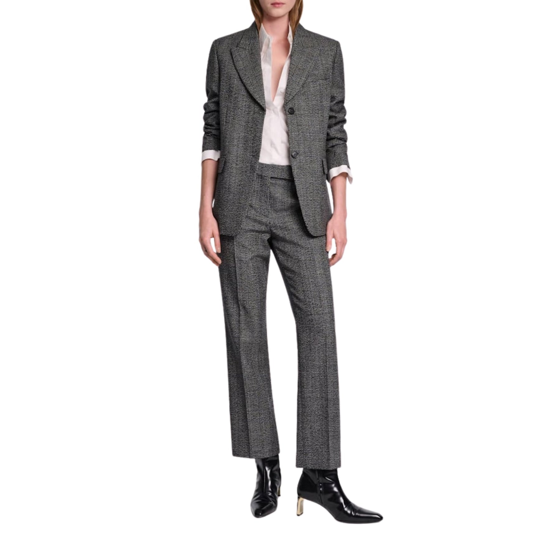 From a refined tailoring edit, the Graphic Elegance Jacket in Salt & Pepper Glencheck is a timeless blazer defined by classic menswear detailing and precise craftsmanship. Cut from pure virgin wool, this slim, tailored jacket features a traditional glen plaid pattern that brings understated sophistication to both workwear and occasion dressing. Designed with a sharp peaked lapel and structured silhouette, it pairs seamlessly with the coordinating trousers for a polished suit look or stands alone as an elevated wardrobe essential.