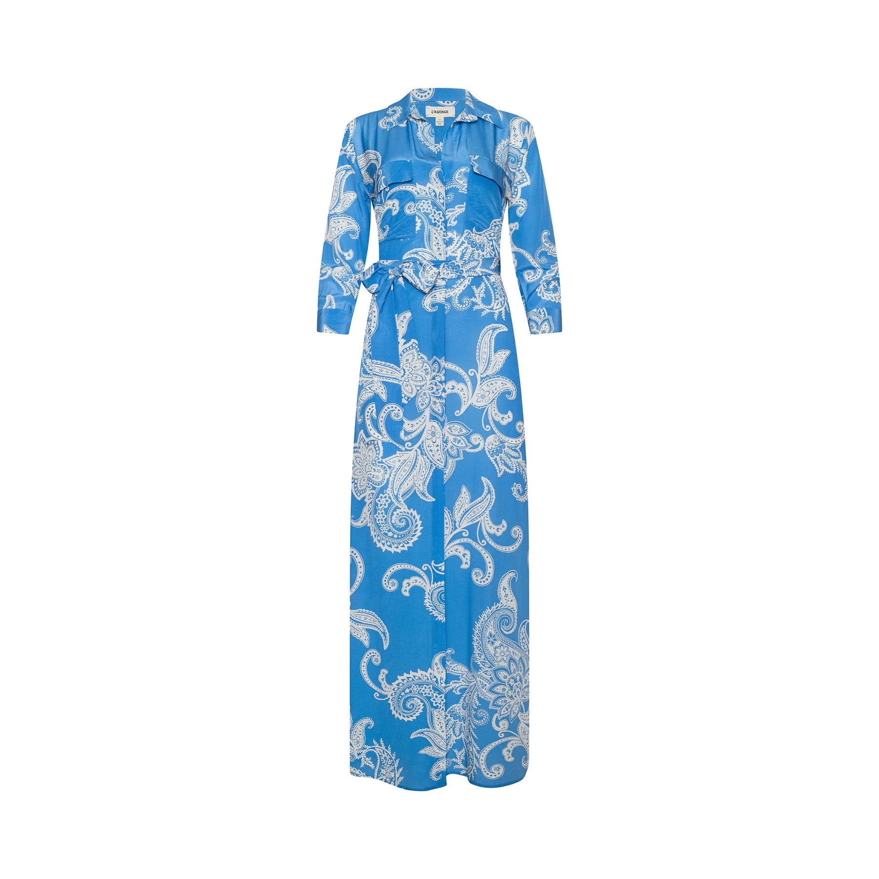 From a statement-making silk essentials edit, the Cameron Long Shirt Dress in Regatta Blue/Ivory 2 Tone Large Paisley delivers effortless drama with timeless appeal. Crafted in fluid silk crepe de chine, this bestselling silhouette features a bold paisley print and deep side slits that create beautiful movement with every step. Designed with classic shirt-dress detailing, it transitions seamlessly from day to night—wear it buttoned as a dress or open as a duster over denim and a camisole.