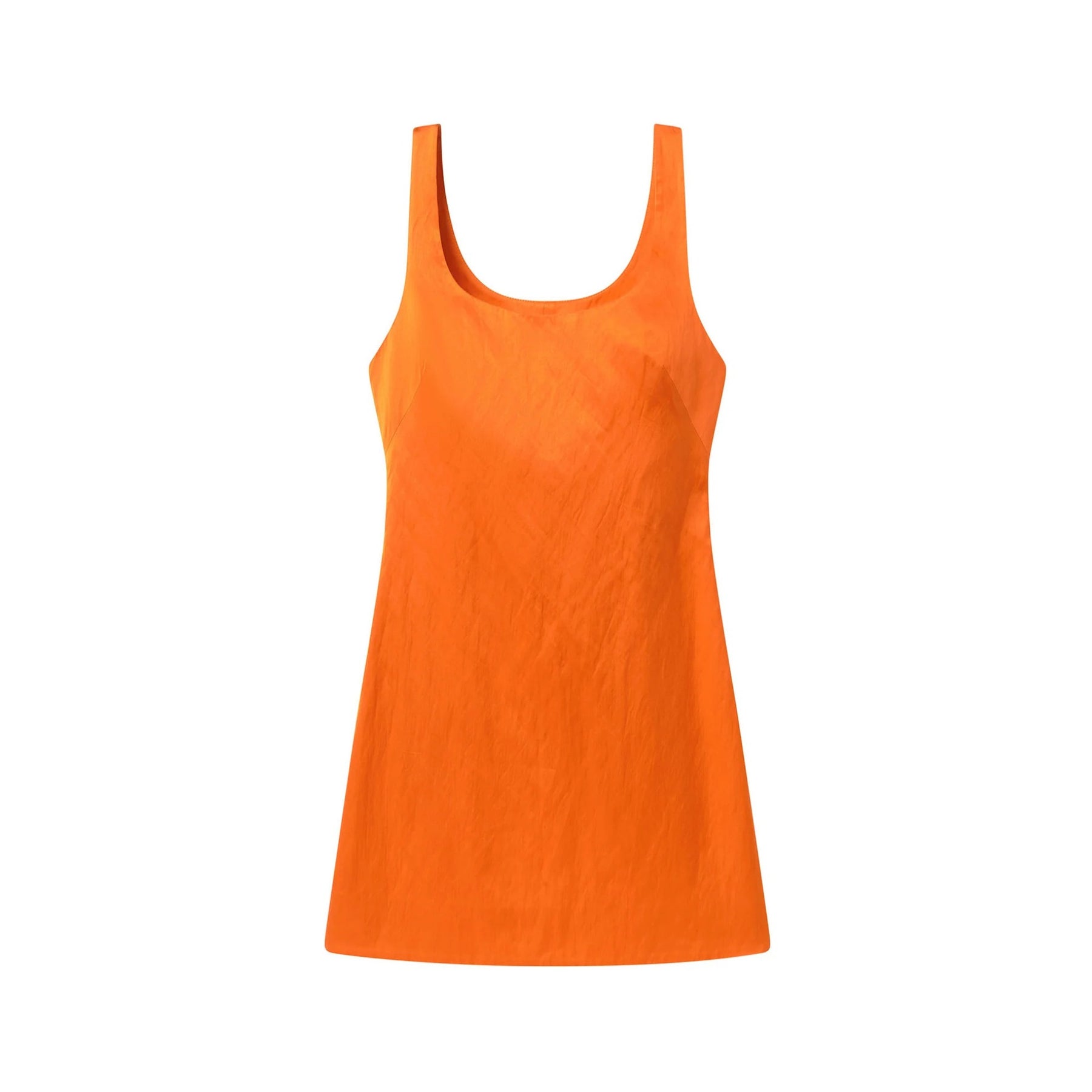 This chic mini dress blends modern tailoring with a subtle pearlescent sheen for an effortlessly elevated look. Cut from a unique cotton-metal satin fabric with a dimensional, crinkled texture, the Faye Dress offers both visual interest and a sleek silhouette. It features a sleeveless design with a square neckline and a tailored fit that skims the body, making it perfect for everything from daytime events to evening occasions. With its vibrant persimmon hue and thoughtful construction, this dress brings a refined yet playful energy to your wardrobe.